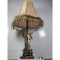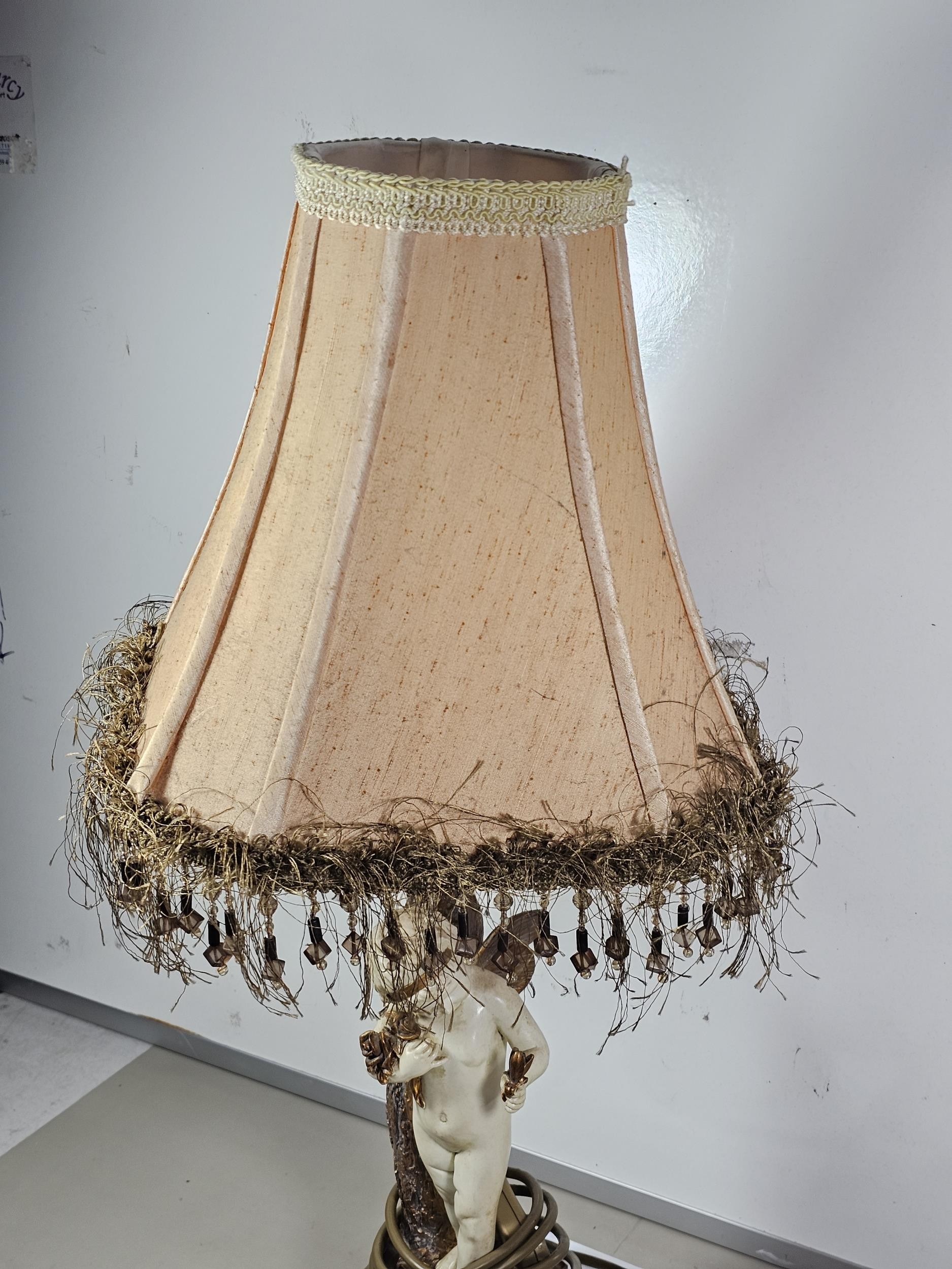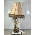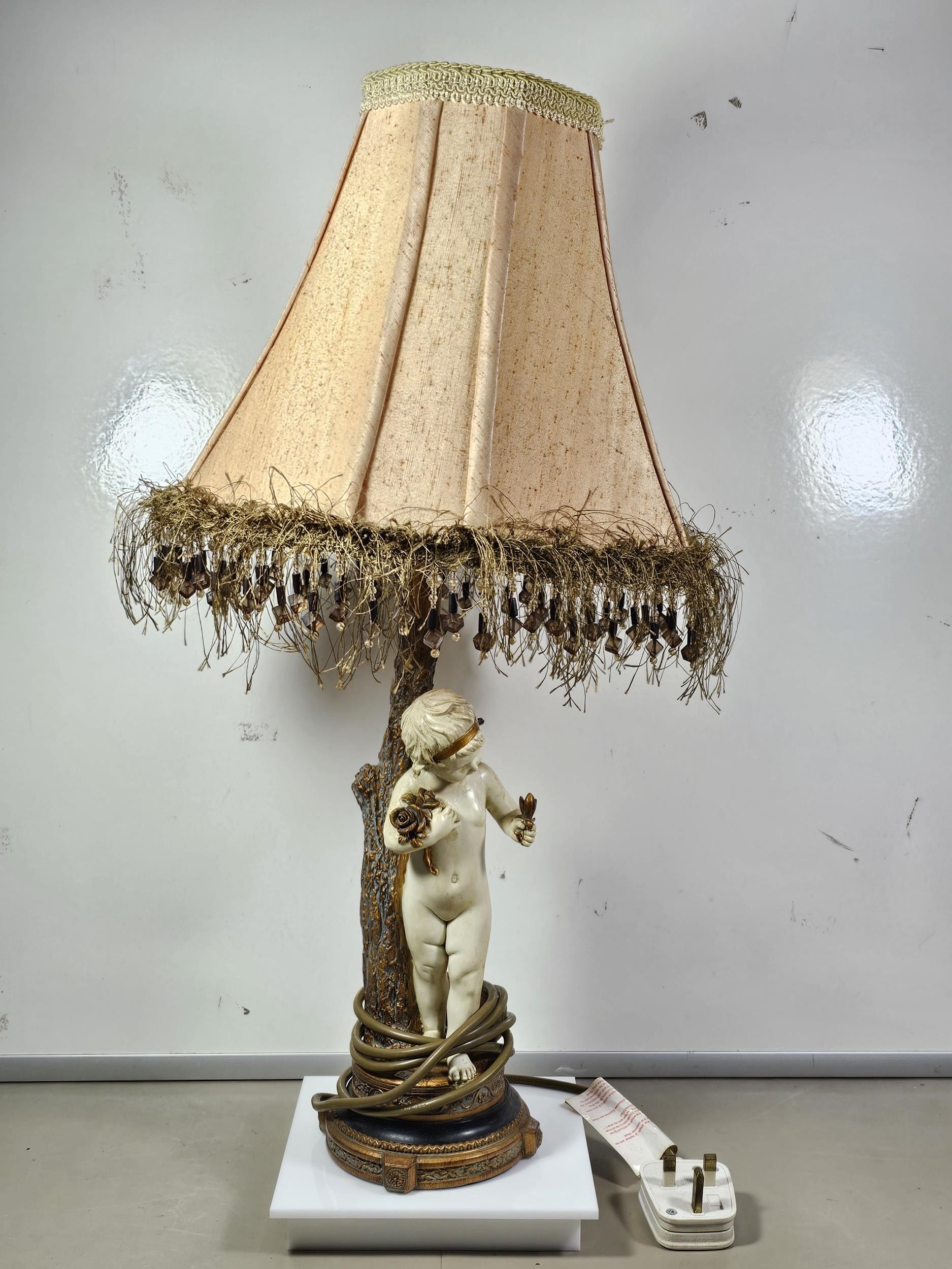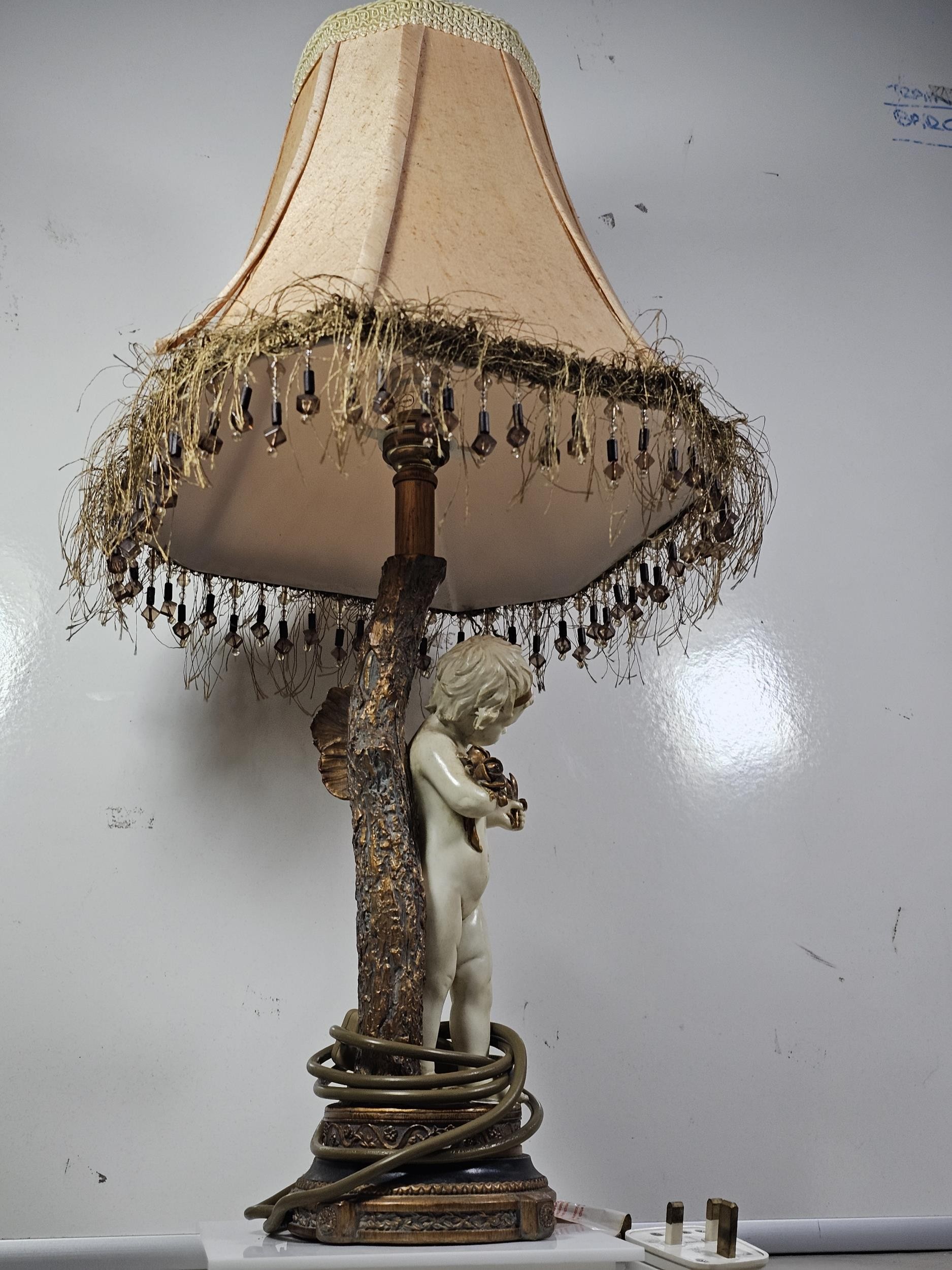 A vintage resin figural lamp with a cherub to the base and an original vintage lampshade decorated with sequins. The lamp is in good order with a height including shade of 59cm. the Base diameter is 14cm