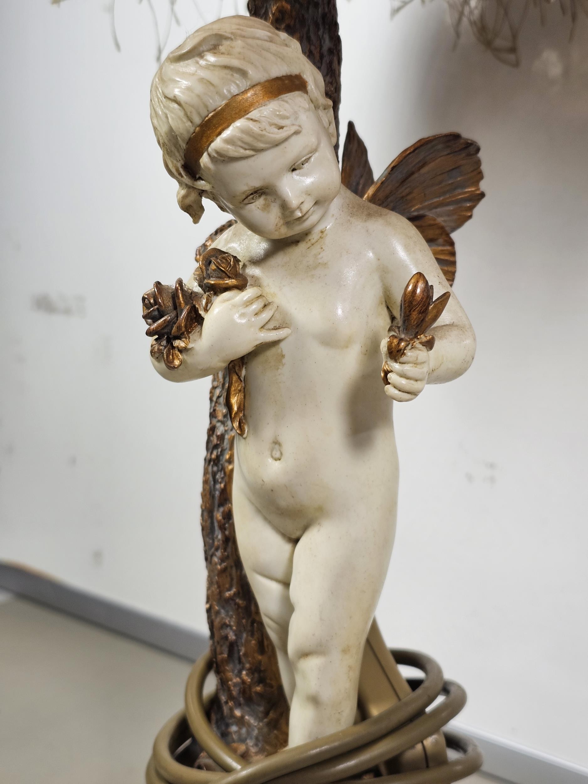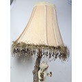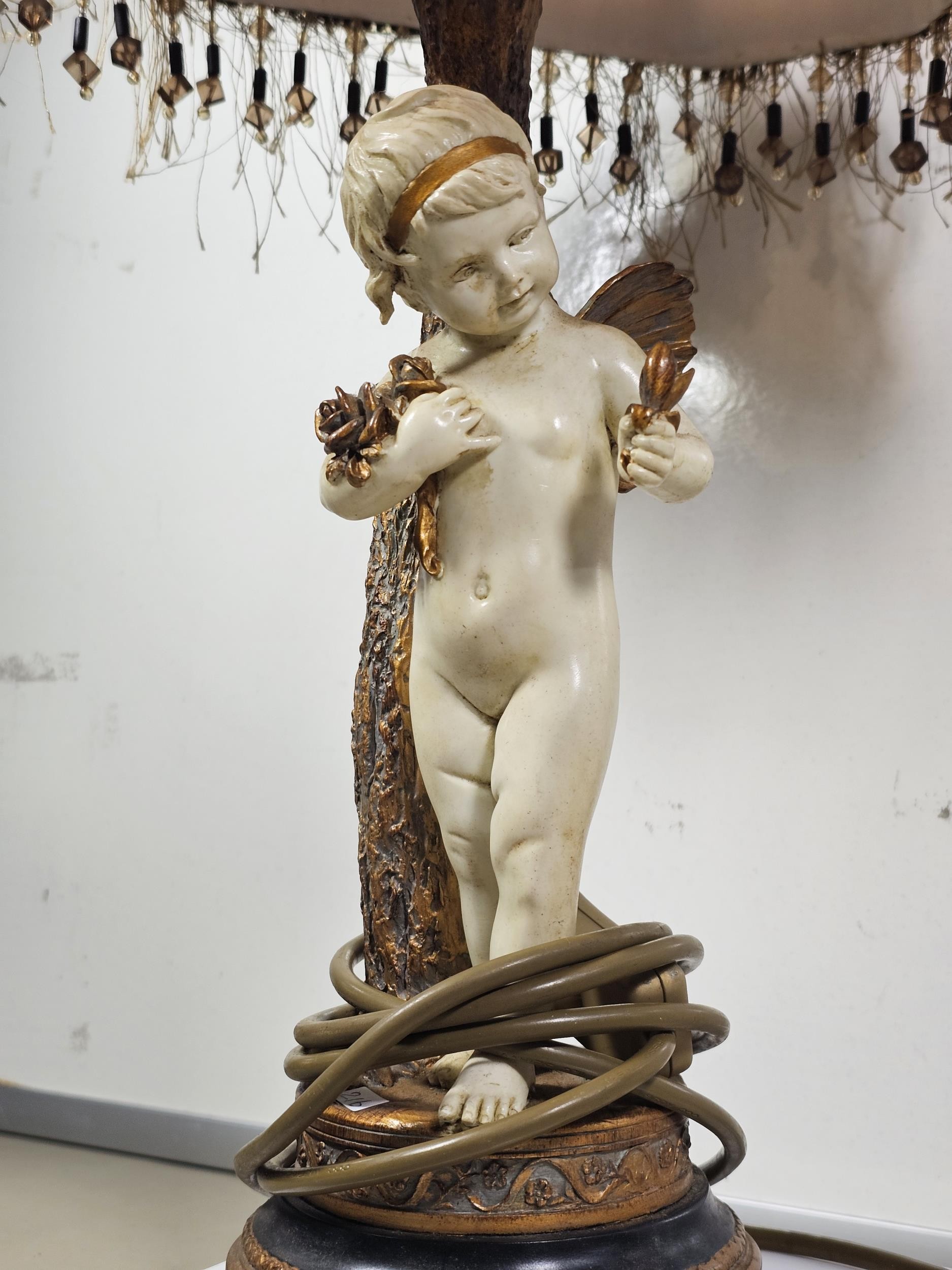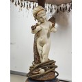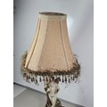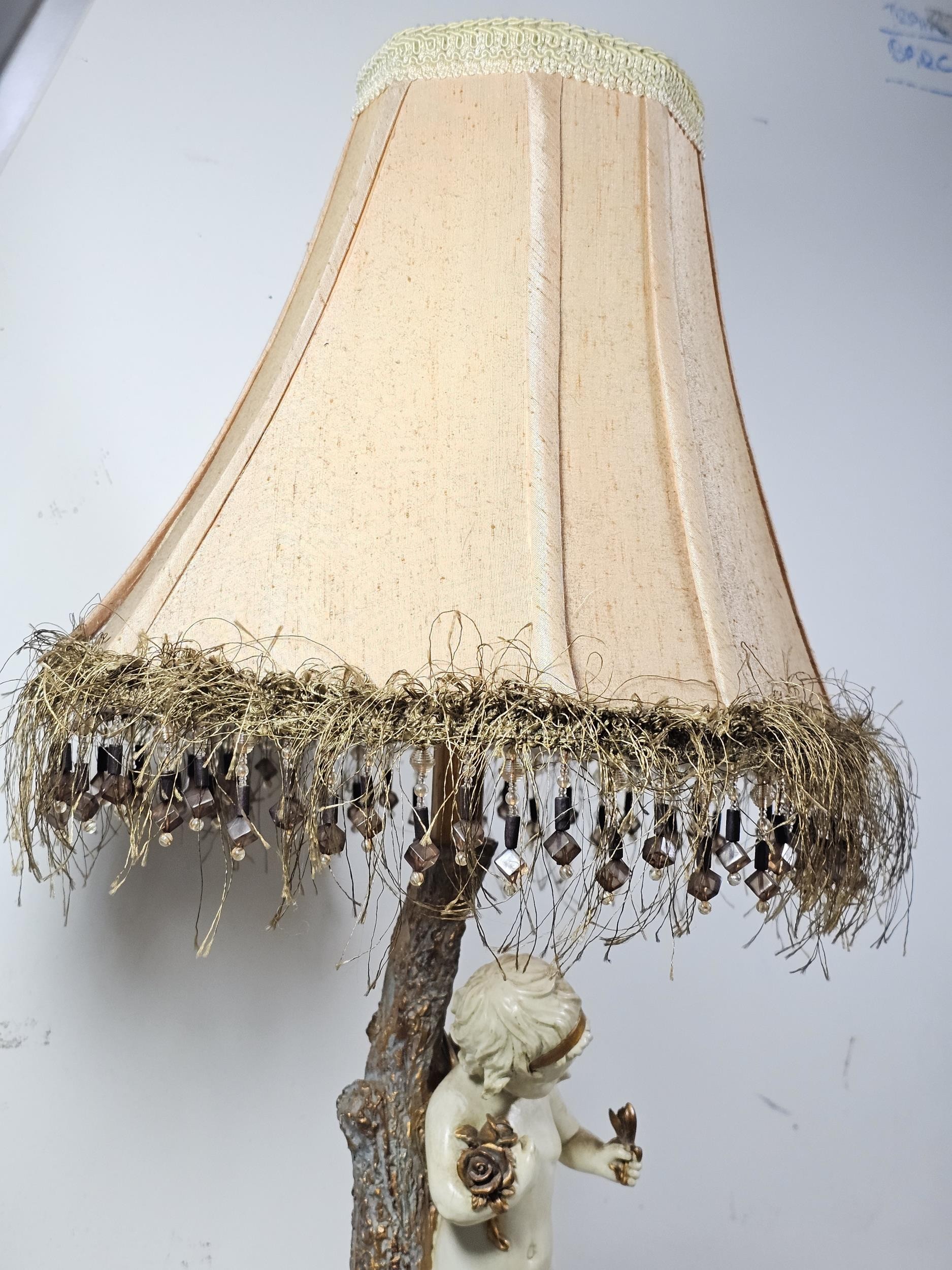 A vintage resin figural lamp with a cherub to the base and an original vintage lampshade decorated with sequins. The lamp is in good order with a height including shade of 59cm. the Base diameter is 14cm