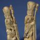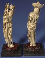 2 early signed ivory figures of bearded gents with staffs - one with a child at foot (a/f - staff broken, H21cm) and the other with a deer at foot (H22cm) -