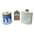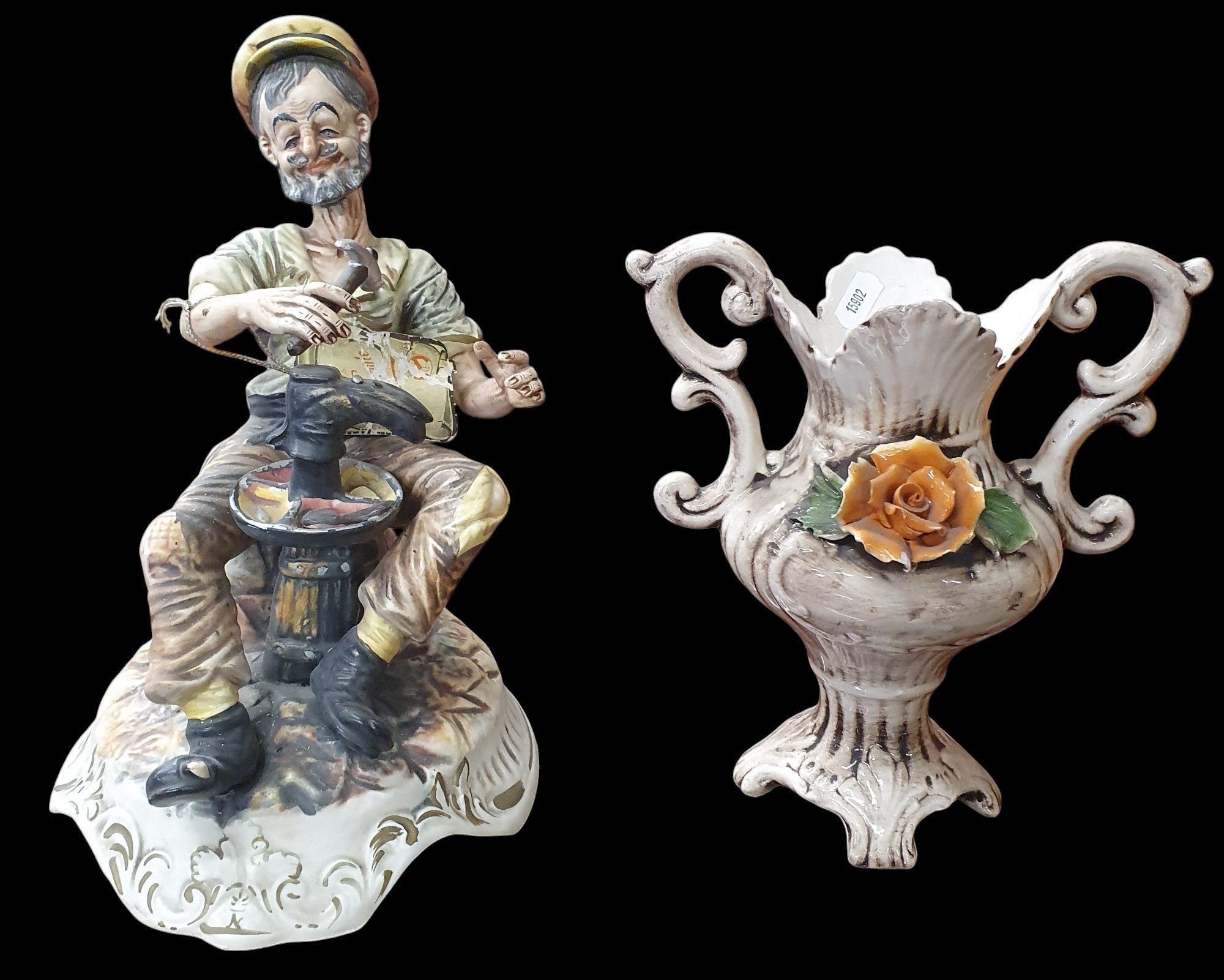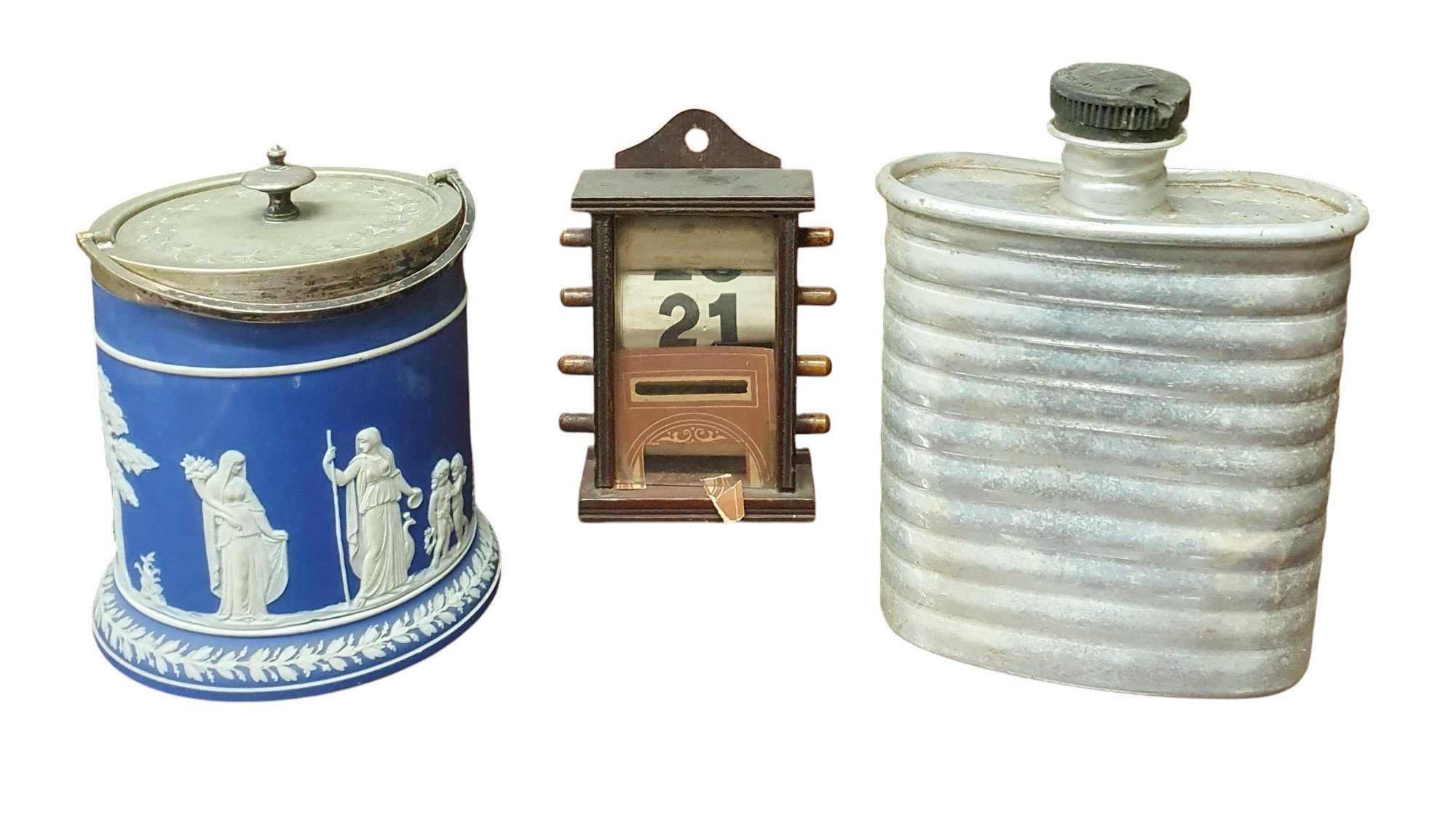A good quantity of items to include a Wedgewood Jasperware Biscuit Barrell, a Vintage desk top Date Changer, a Hip Flask and a quantity of Animals to include Capodimonte Figure of a cobbler with Certificate of authenticity, .