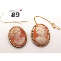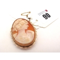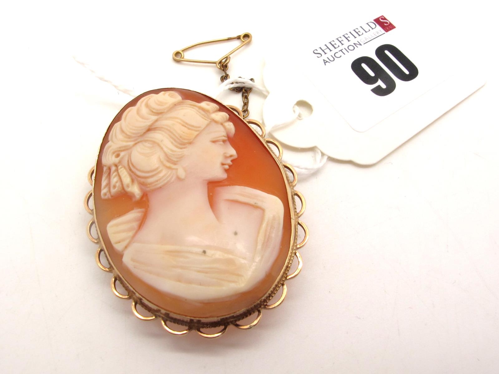 A 9ct Gold Oval Shell Carved Cameo Brooch, depicting female profile, collet set within openwork setting.