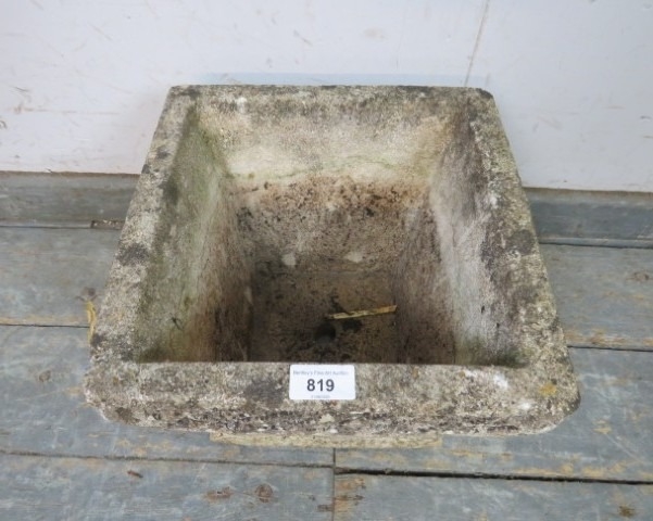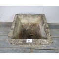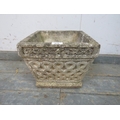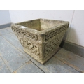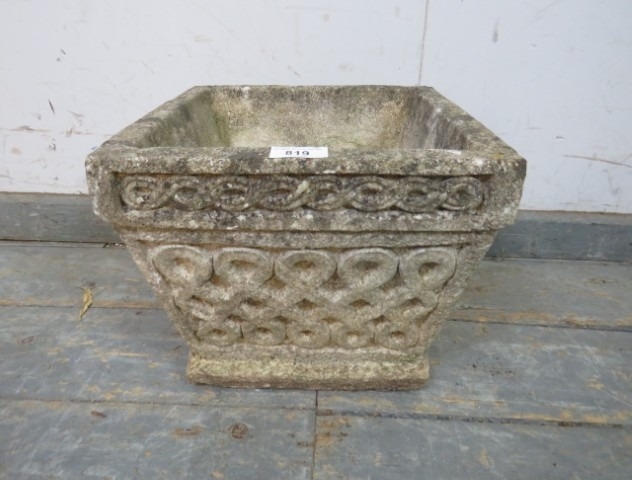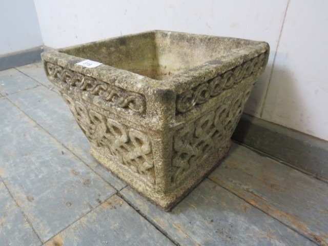 A square reconstituted stone garden planter decorated with Celtic knot patterns. H25cm x W30cm x D30cm approx.