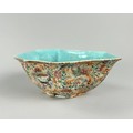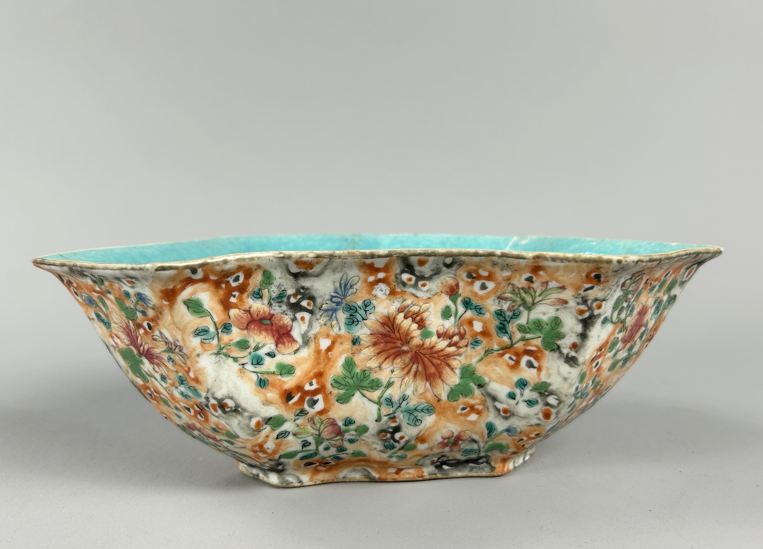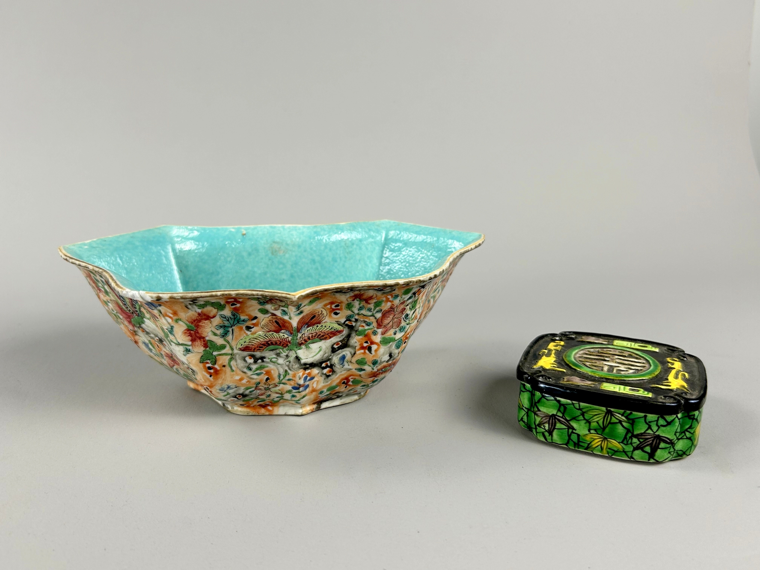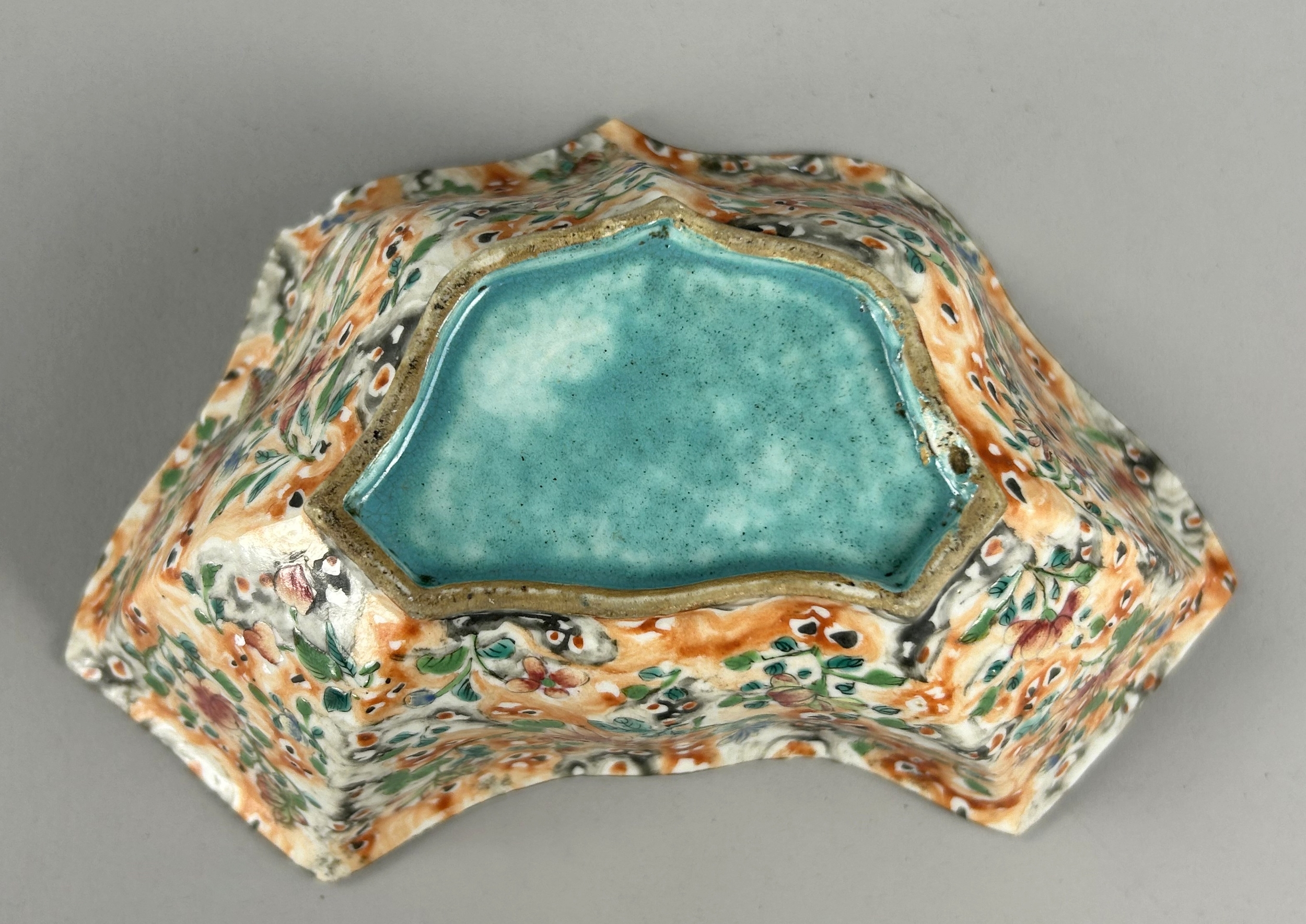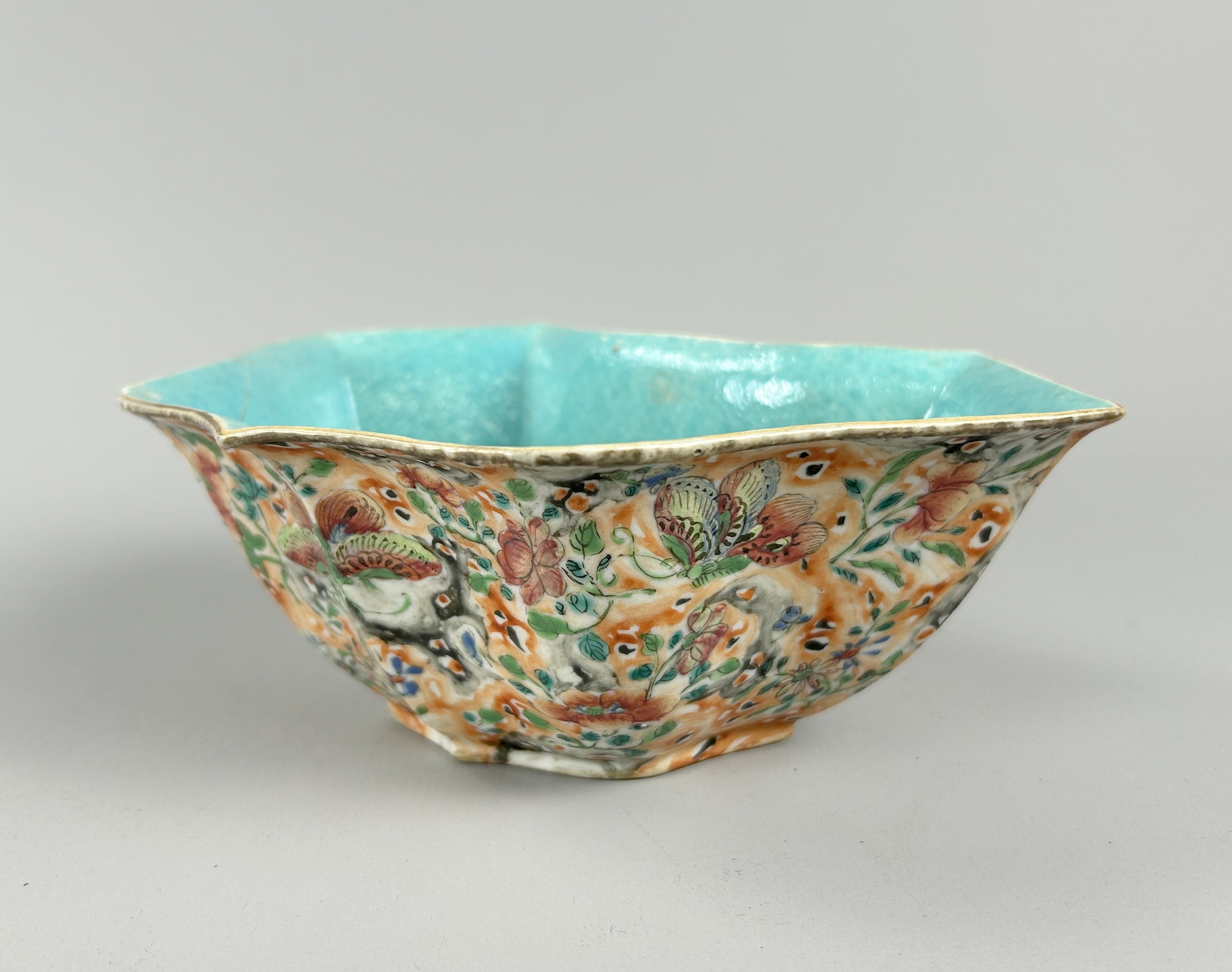 Hand painted overglaze enamels depicting Butterflies & flowers against an orange ground. Turquoise interior.