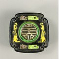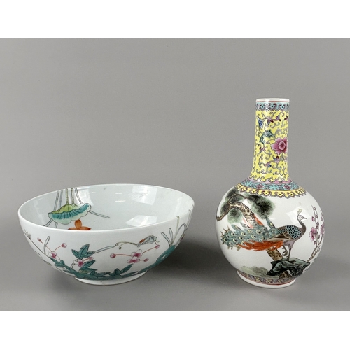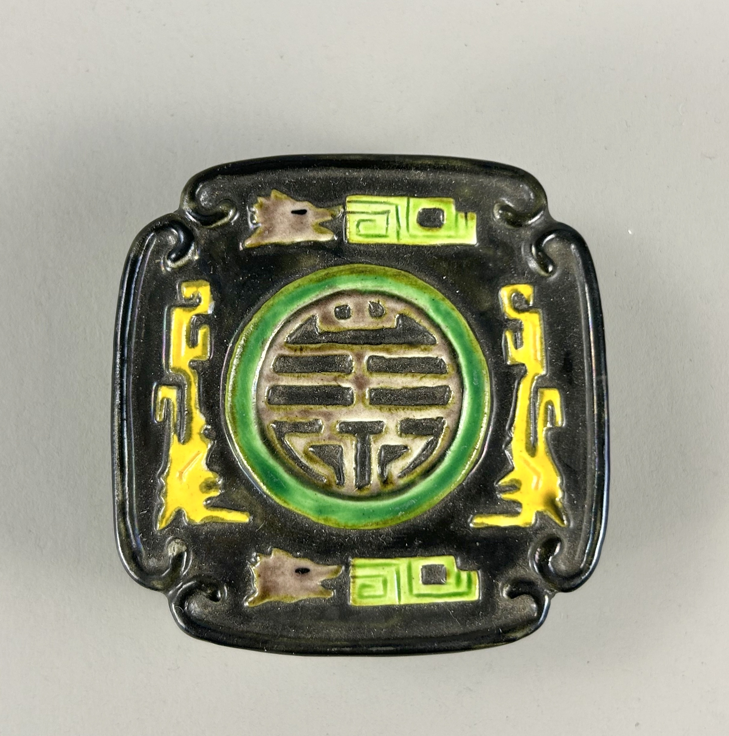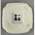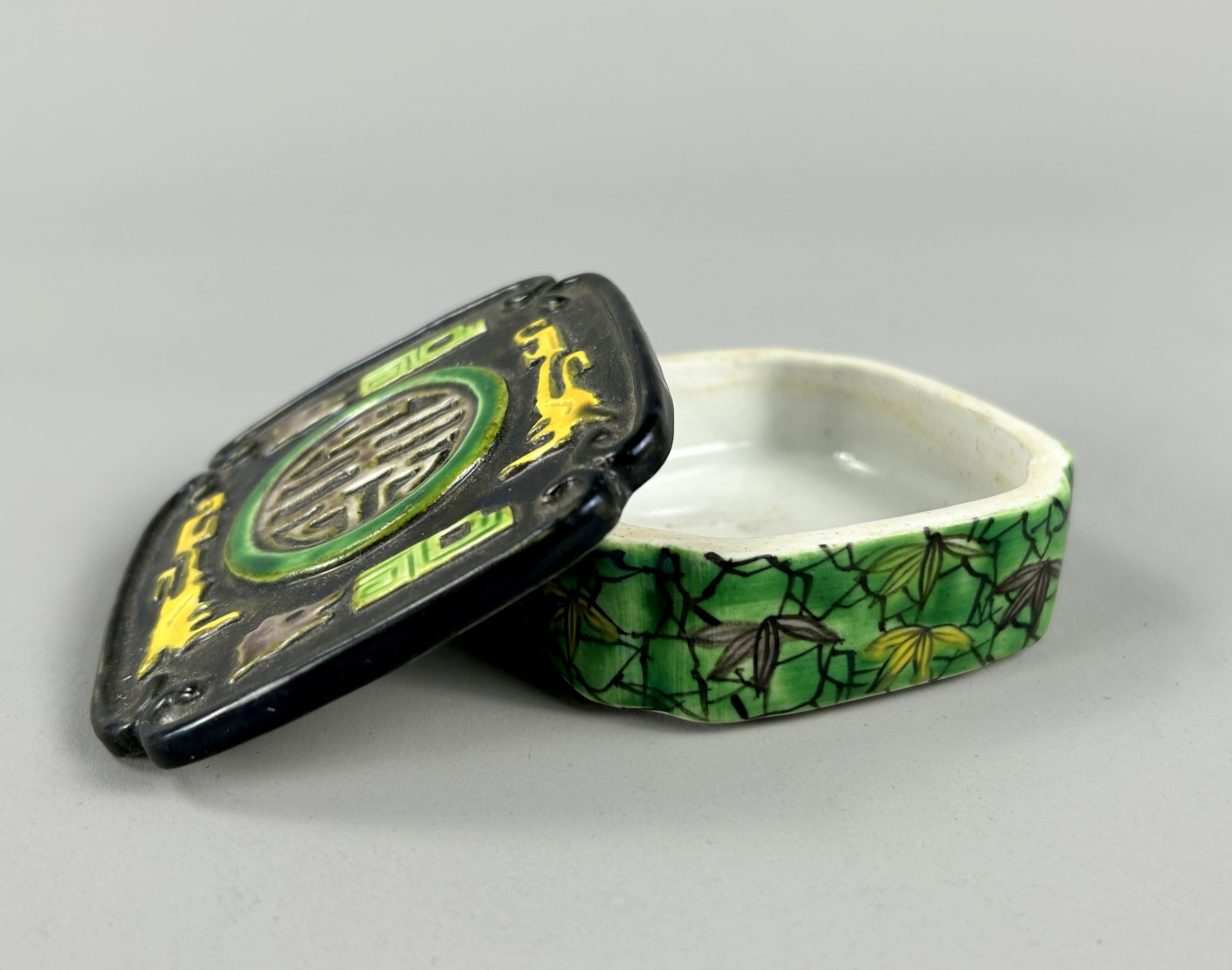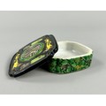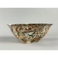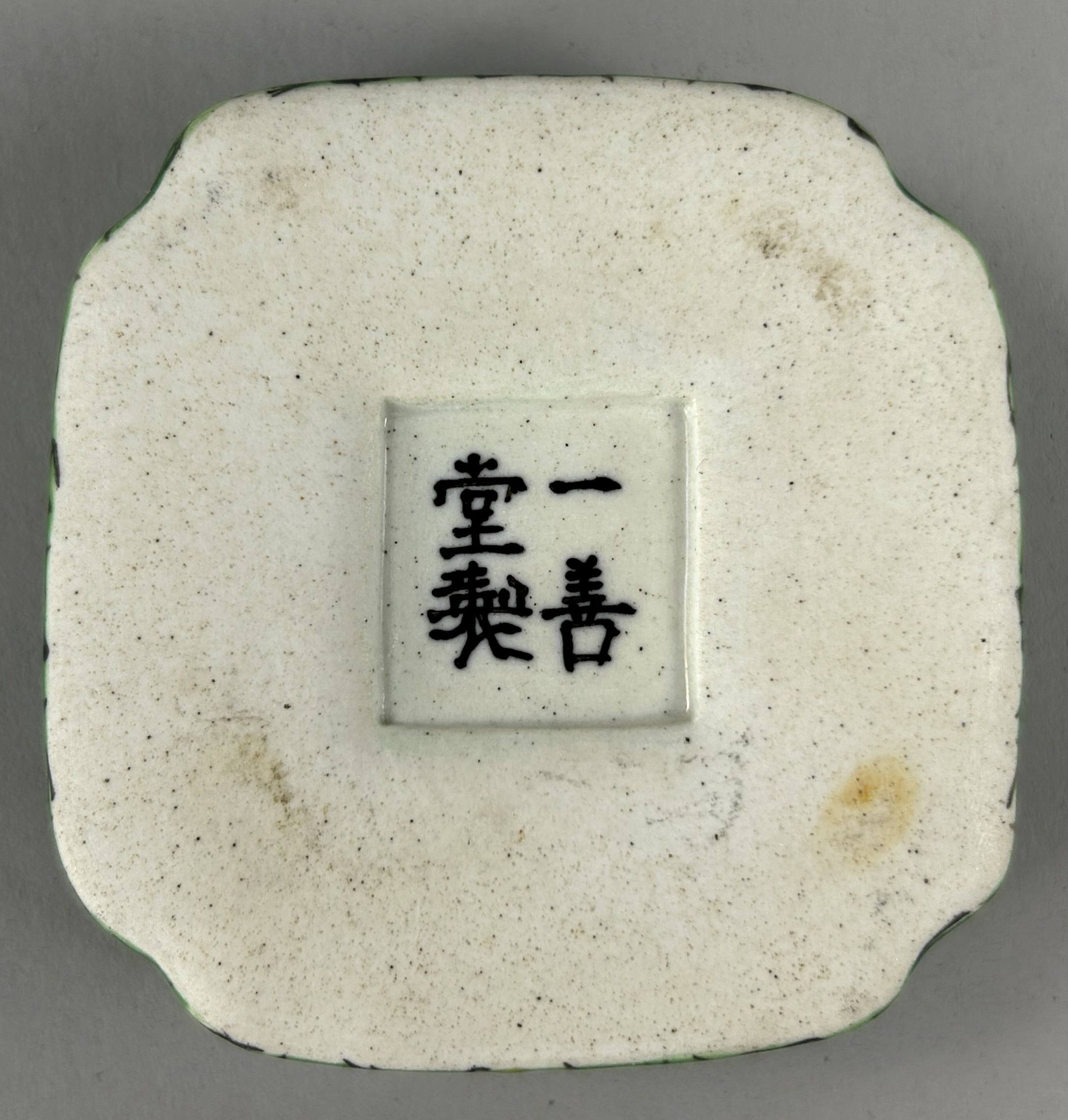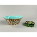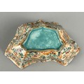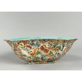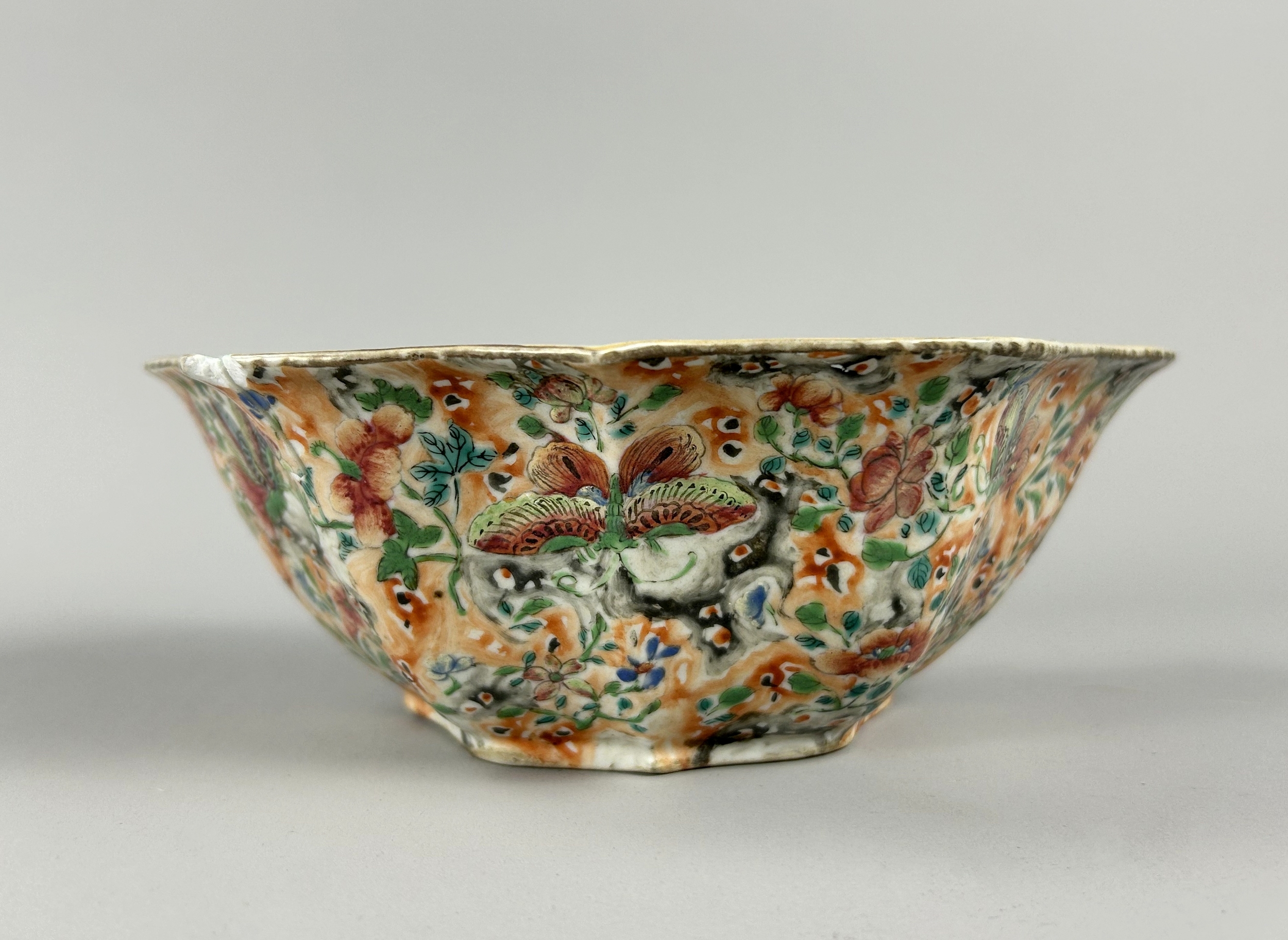 Hand painted overglaze enamels depicting Butterflies & flowers against an orange ground. Turquoise interior.