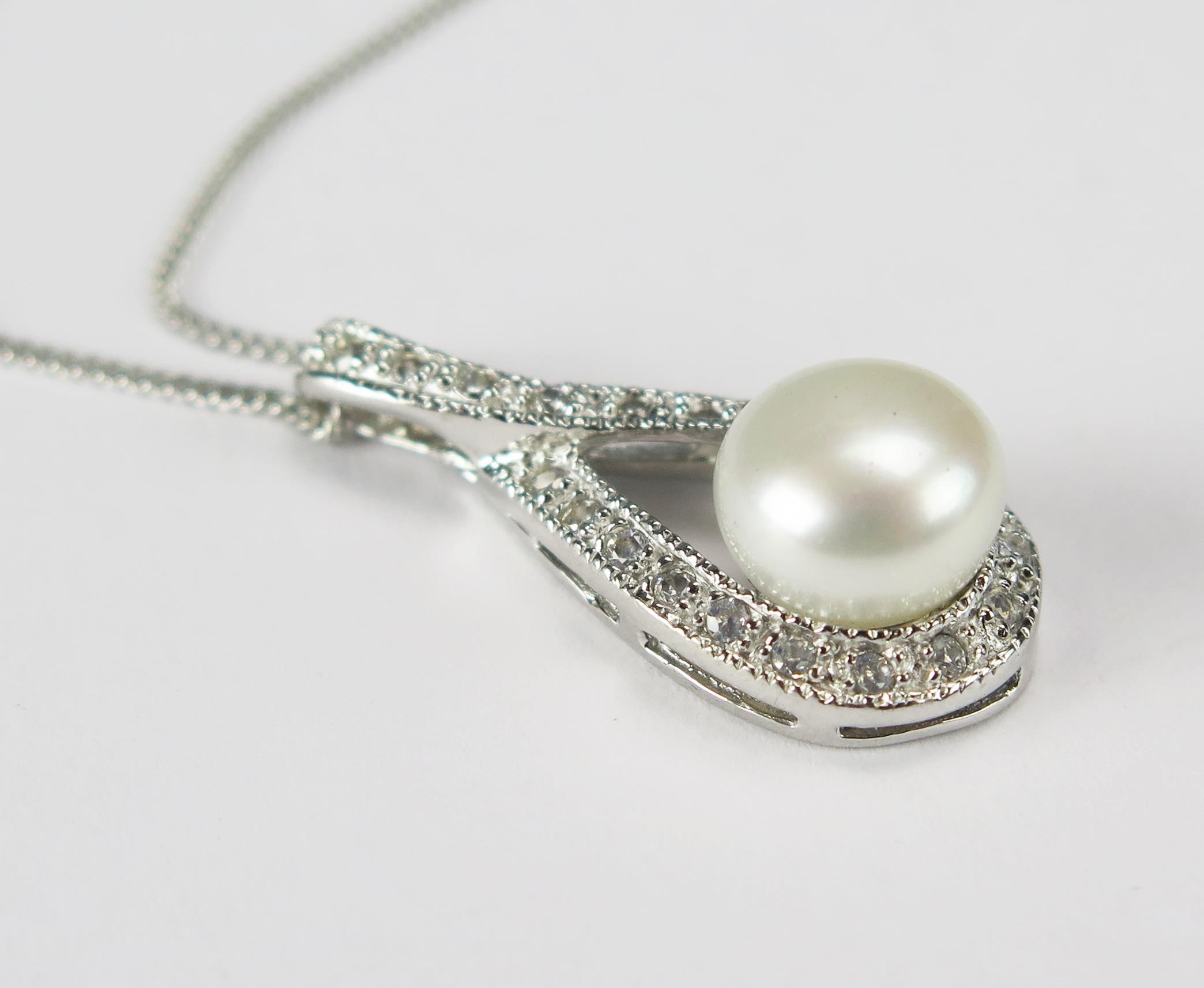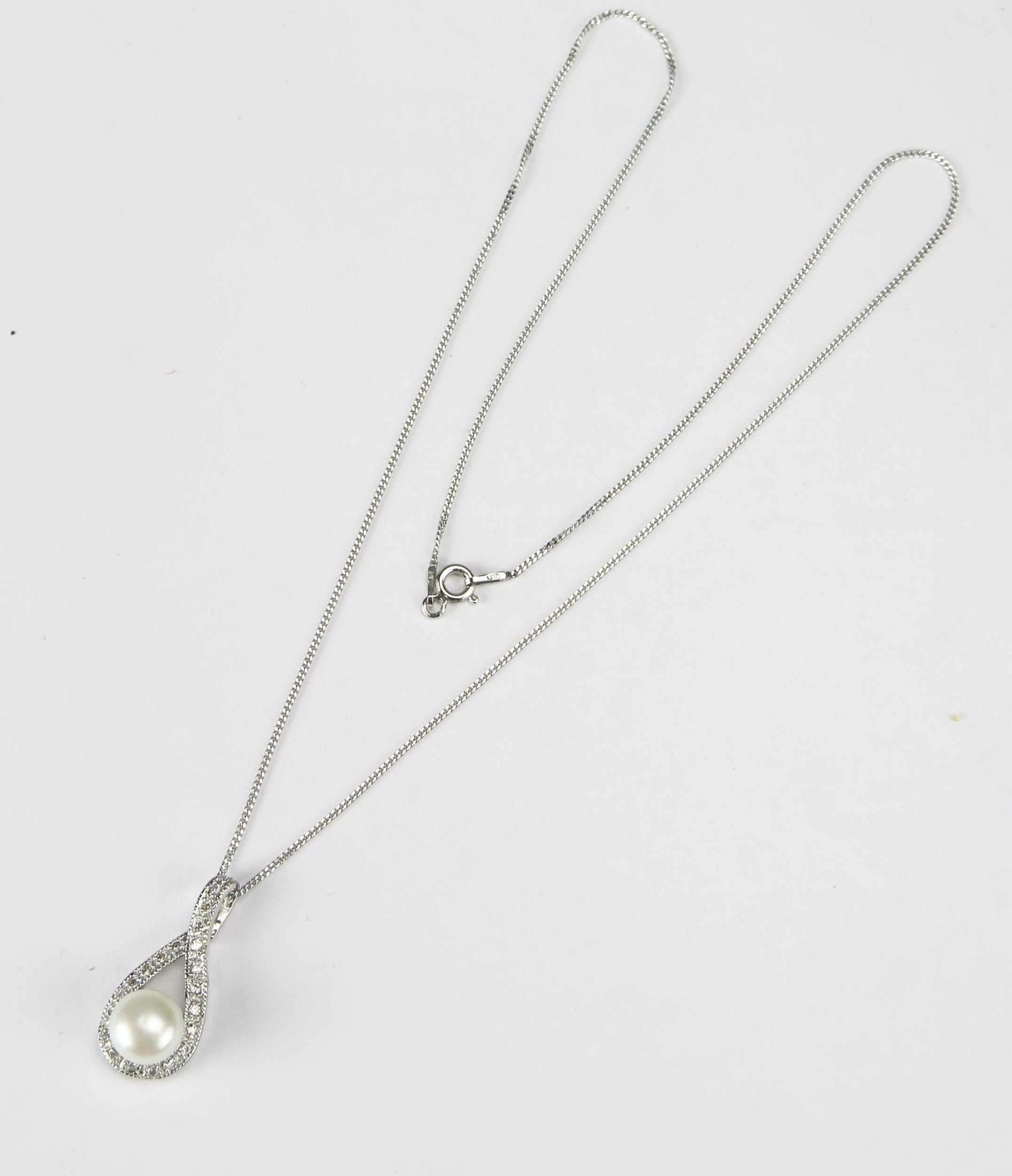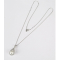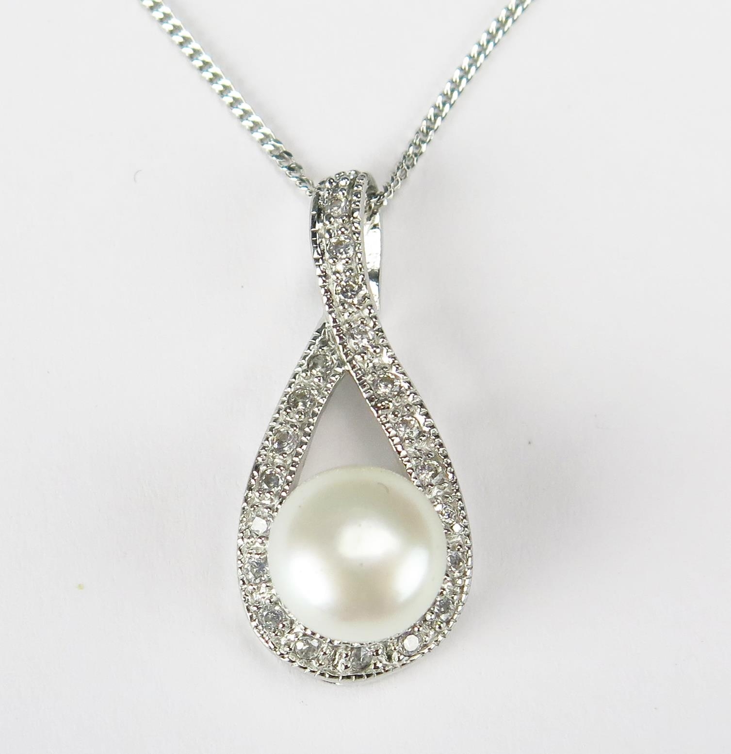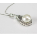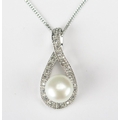 A Silver Pear Shaped Pendant set with cultured pearl and cubic zirconia on a silver chain