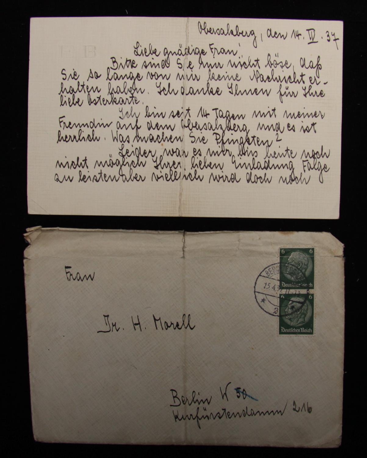 Eva Anna Paula Hitler ne Eva BRAUN, (6 February 1912 - 30 April 1945), Eva Braun married Adolf Hitler shortly before their joint suicides and was a woman almost unknown to the German people until after her death; her importance to Hitler is often underestimated and he remained loyal to her for many years. Braun was employed by Heinrich Hoffmann, the official photographer for the Nazi Party, and through him met Hitler. After the death of Geli Raubal Hitler and Braun became close and were together at the end. By 1936 she was part of Hitler's household at the Berghof near Berchtesgarten whenever he was in residence and in 1938 Hitler named her as his heir. The correspondence in the following two lots relate to Hanni Morell, (ne Hannelore ''Hanni'' Moller, a former actress), the wife of Theodor Morell, who was to become Hitler's personal physician. Theodor Gilbert Morell (July 22, 1886 - May 26, 1948) well known in Germany for his unconventional and alternative treatments. It is suggested that Eva Braun introduced Hitler to Dr. Theordore Morell in 1936. Morell gave Hitler questionable medication and in doing so may have considerably altered his state of mind. It could be said that without Morell the course of the war might have been drastically altered. The two lots here, a personal card from Braun to Hanni Morell and a handwritten letter provide clues to a friendly relationship between Braun and Mrs. Morell. These two lots were brought into a valuation day by a local woman who wishes to remain anonymous; her mother married a man from Nottingham who had acquired the correspondence towards the end of the war. Eva BRAUN, Germany, the Third Reich, 14th April 1937, her personalised folded EB card c7''x4.5'', in Braun's hand and signed by her, to Hanni Morell, wife of Doctor Theodor MorellÂ… in which Braun apologises for not replying earlier and refers to her visit to Obersalzberg with an un-named female friend. Clearly from the text Morell had extended several invitations to Braun. Braun continues that they will meet in Bavaria and ends with hearty greeting to Doctor Morell; with envelope addressed Dm H. Morell, Berlin W50, Kurfurstendamm 216, and to back the printed initials EB, and the handwritten return address E Braun, Munchen, Wasserburgestr 12, postmaked Berchtesgarten 15/4/37, the envelope complete but only fair, the card good