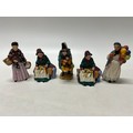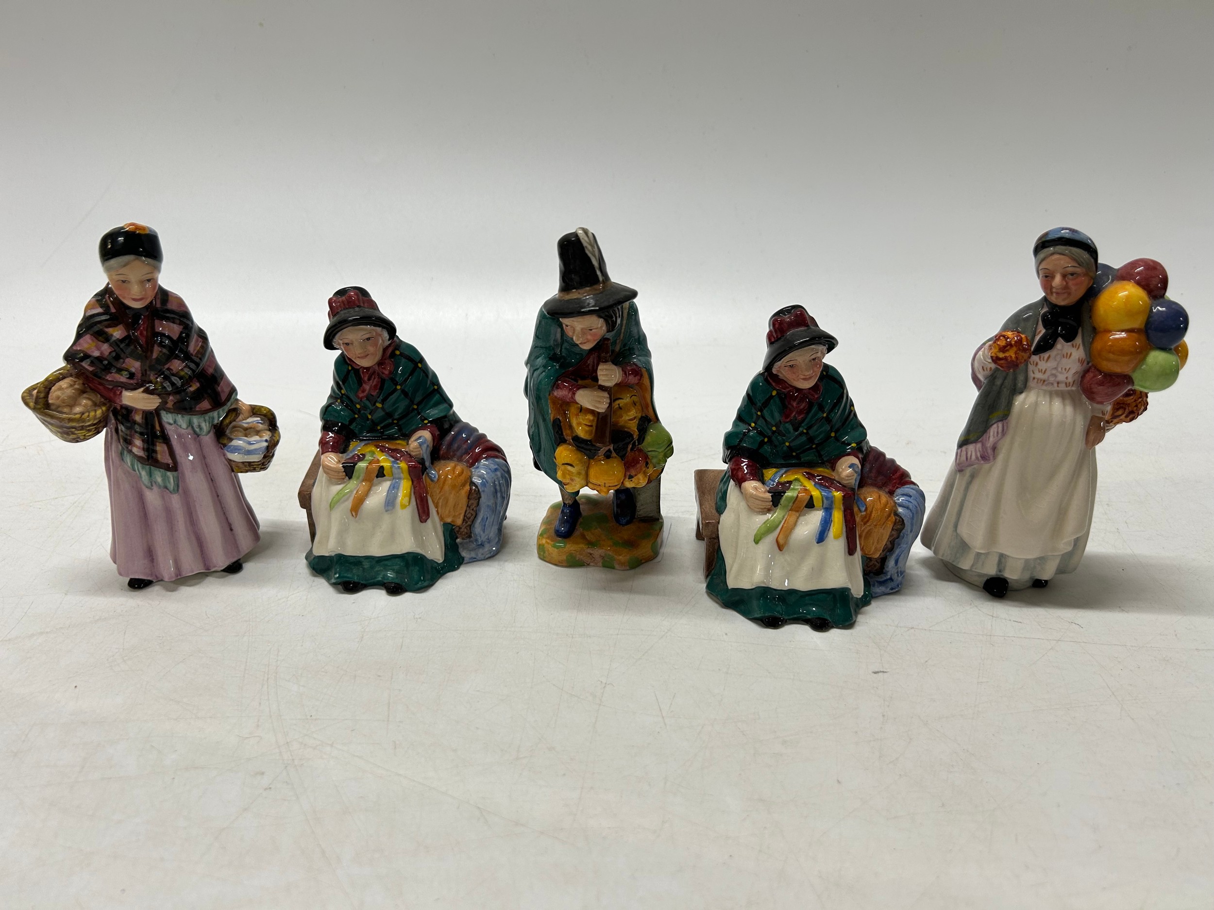 Five Royal Doulton figures - The Orange Lady HN4810, Silks and Ribbons (2) HN4808, Biddy Penny Farthing HN4933 and Mask Seller HN4934