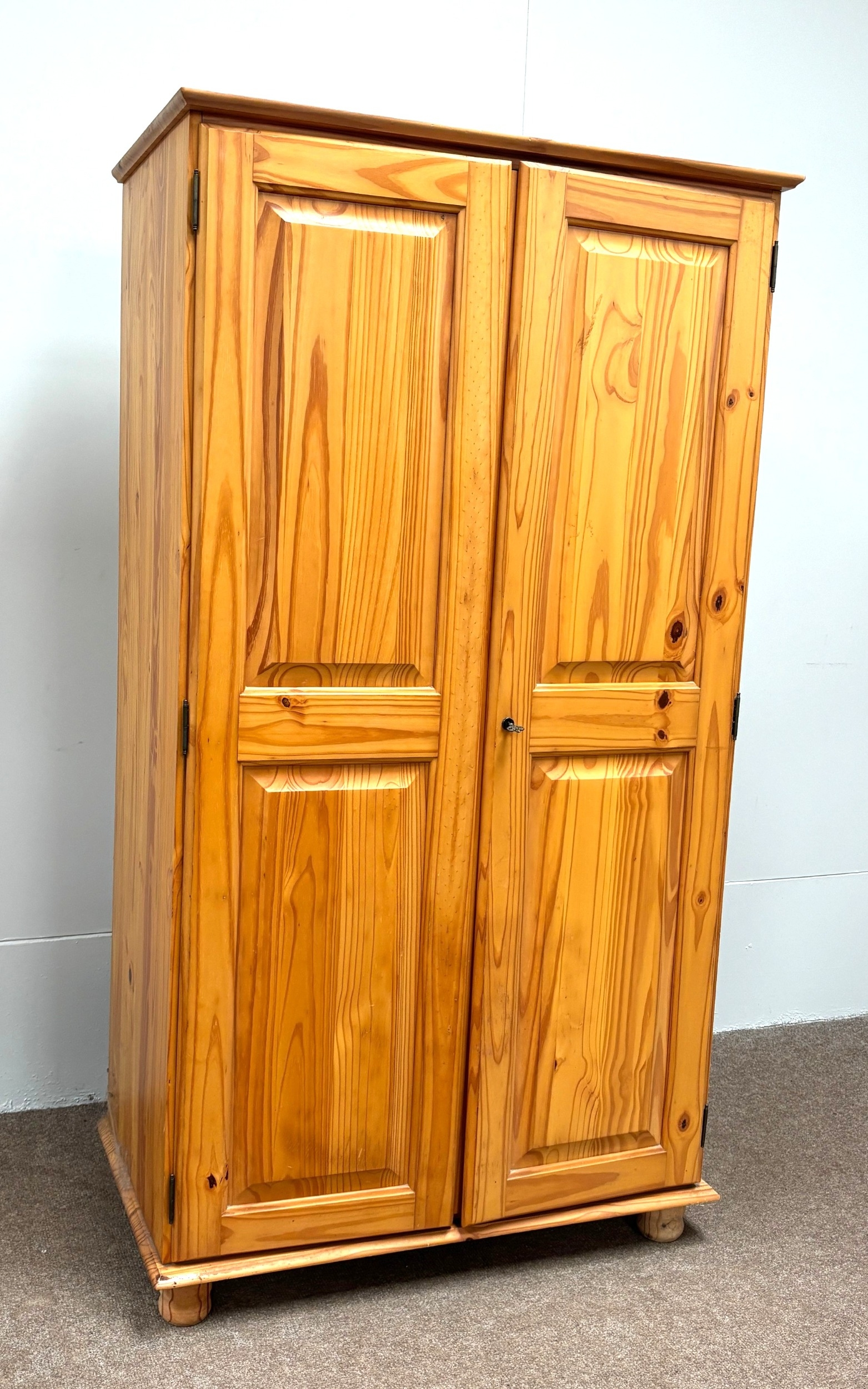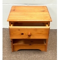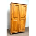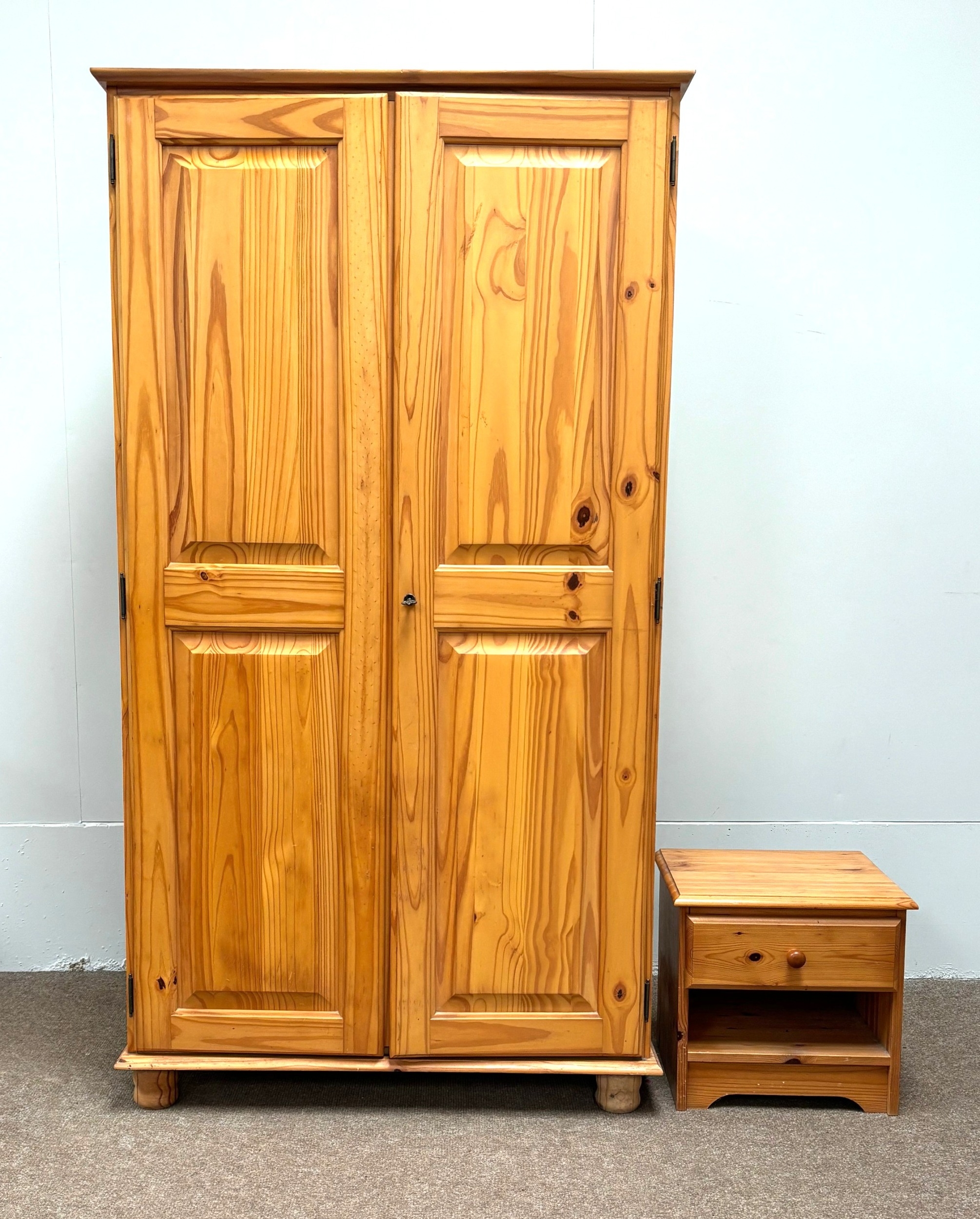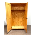 A modern pine two door wardrobe; with a small bedside chest (2).