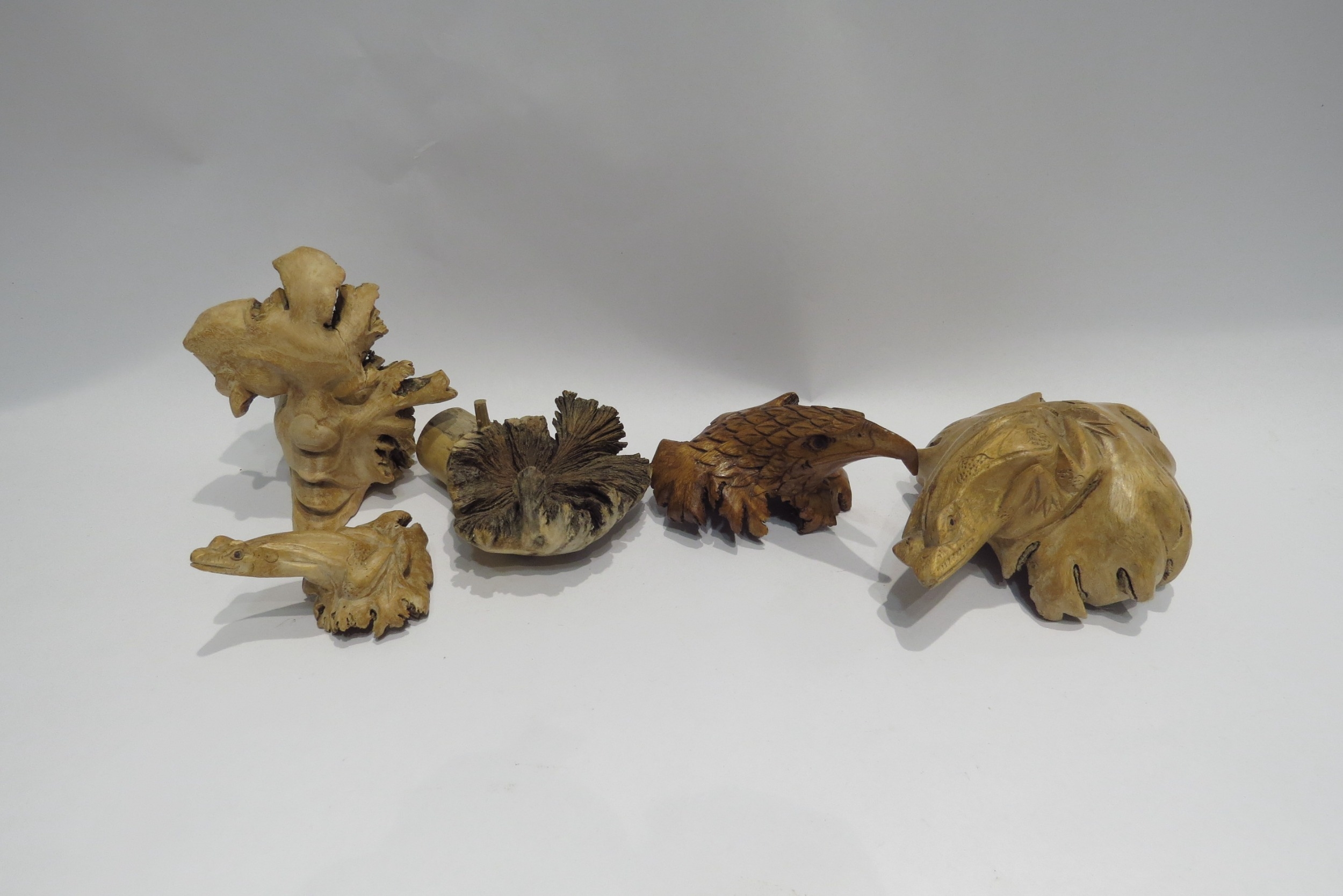 Five wooden tree stump carvings including frog and eagle's head