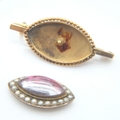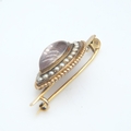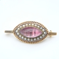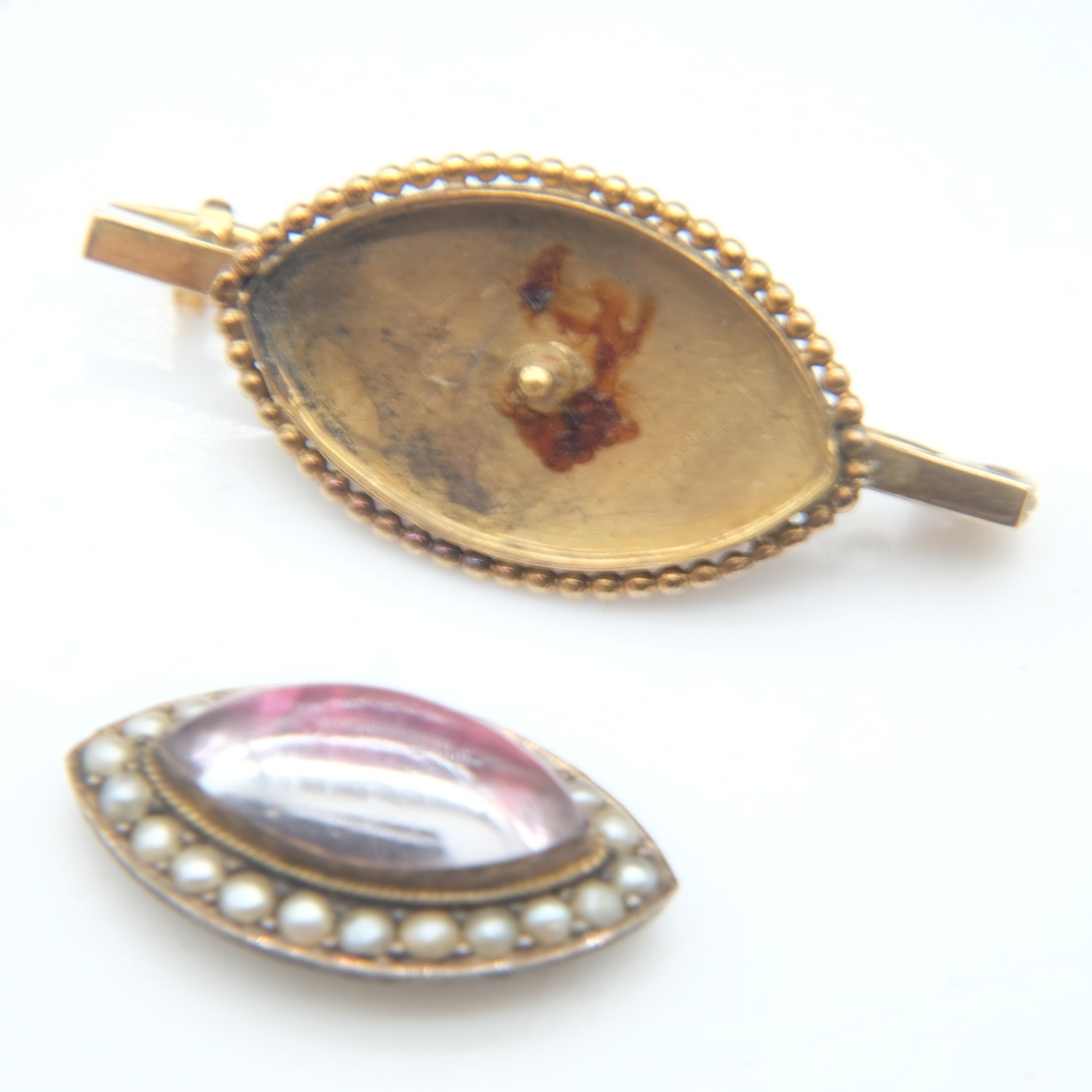 19th Century unmarked gold brooch, with a domed marquis-shaped glass cabochon with red foiled back surrounded by split pearls, brooch L: 40 mm, 5.5g combined, central setting loose in frame. UK P&P Group 0 (£7+VAT for the first lot and £1+VAT for subsequent lots)