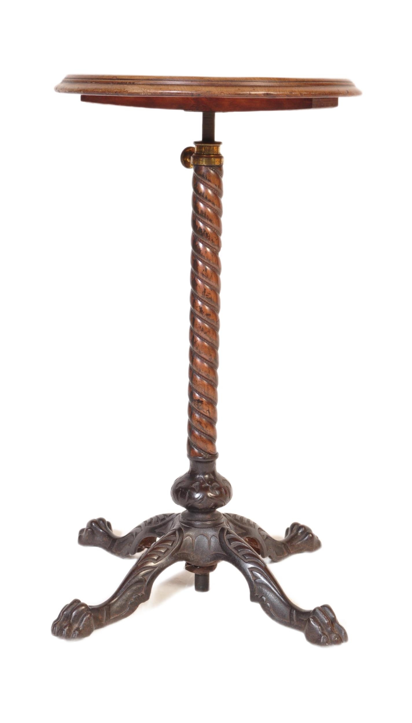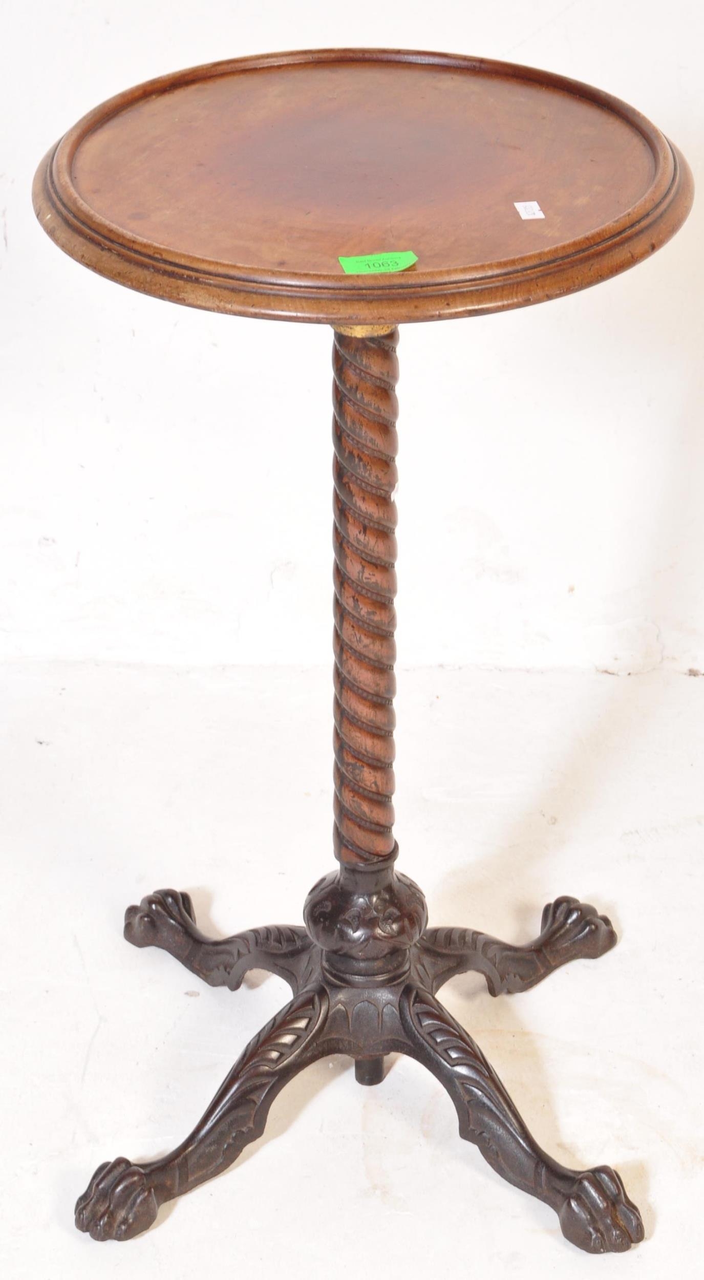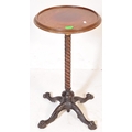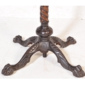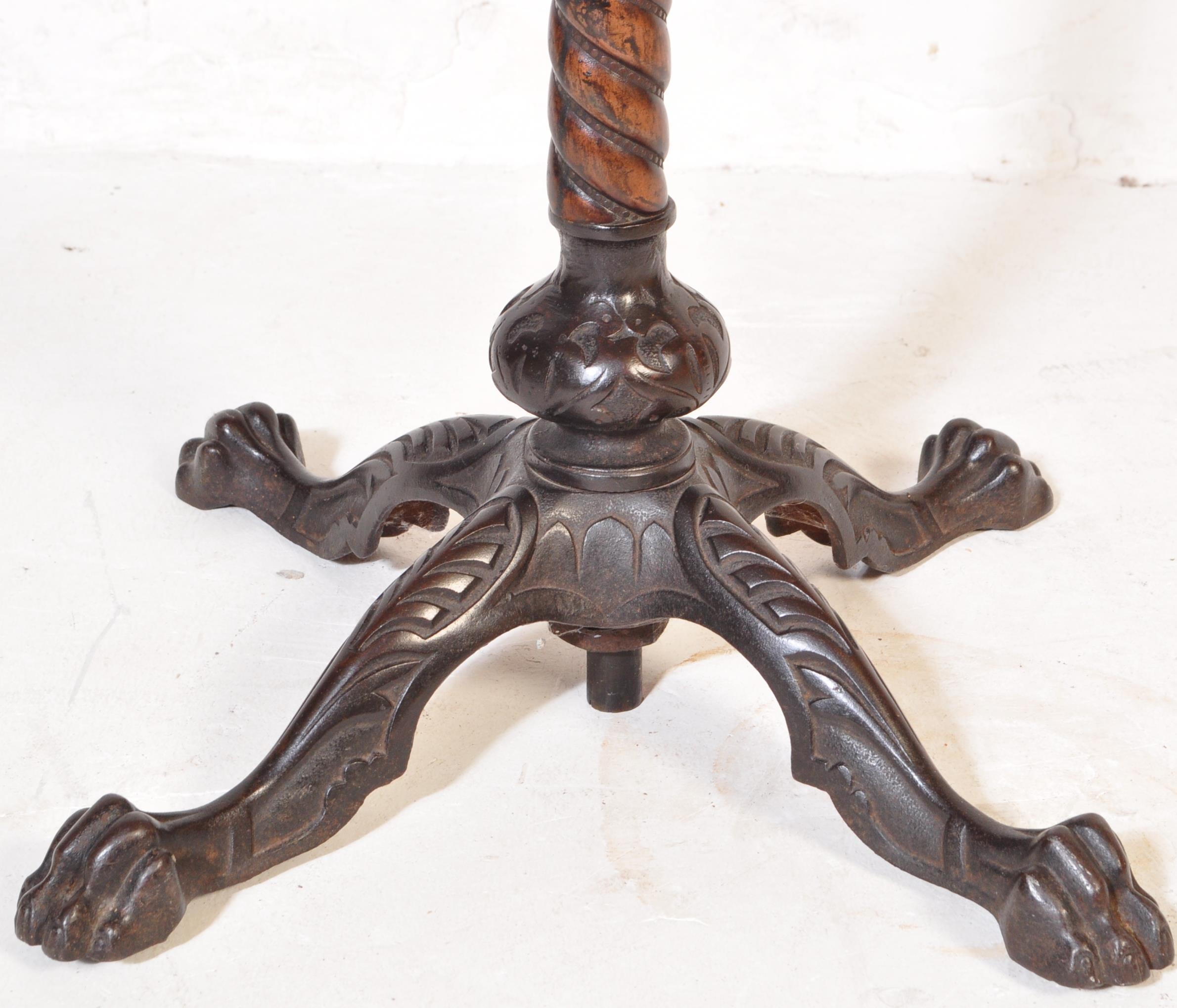 Victorian 19th century cast iron and mahogany pedestal wine table. The cast iron base in the manner of coalbrookdale being raised on hairy paw feet with twist column to circular mahogany table top above