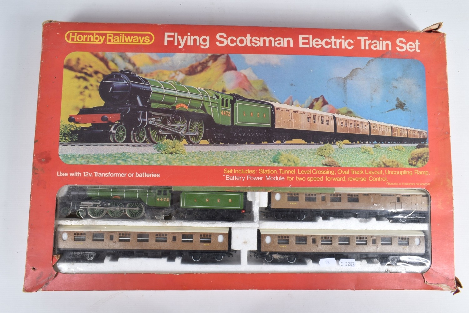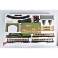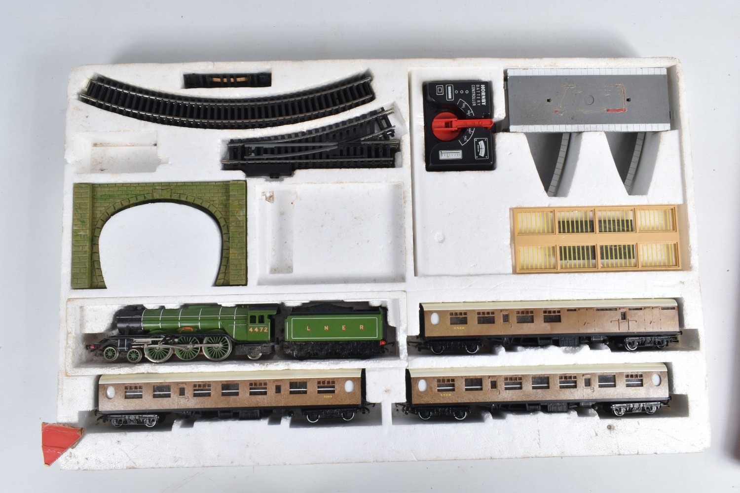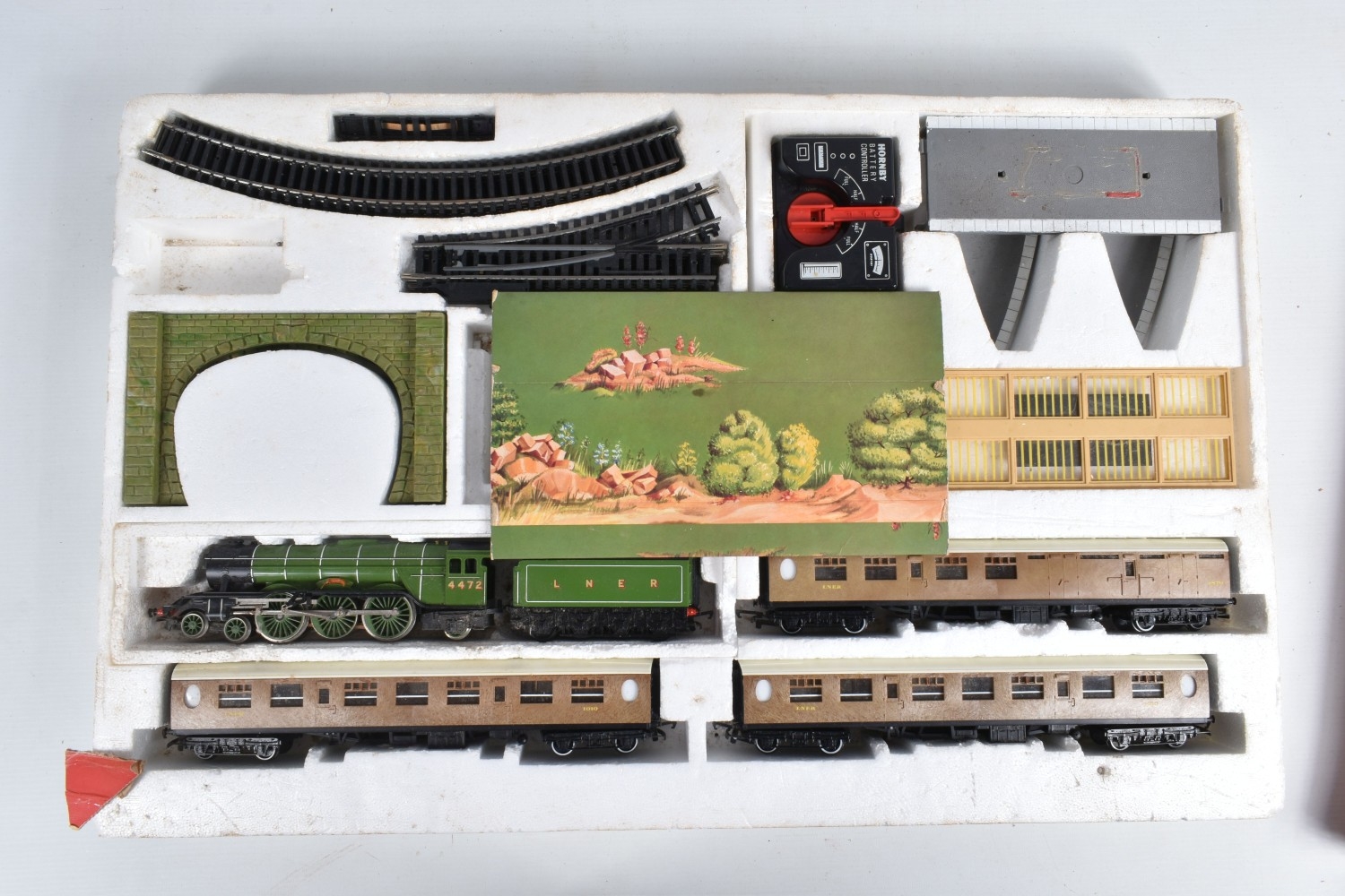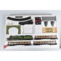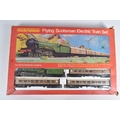 A BOXED HORNBY RAILWAYS OO GAUGE FLYING SCOTSMAN TRAIN SET, No.R549, comprising said locomotive and corridor tender, L.N.E.R. green livery, missing nameplate from side and other one damaged, three Thompson coaches, quantity of track, missing some accessories, box with damage and wear