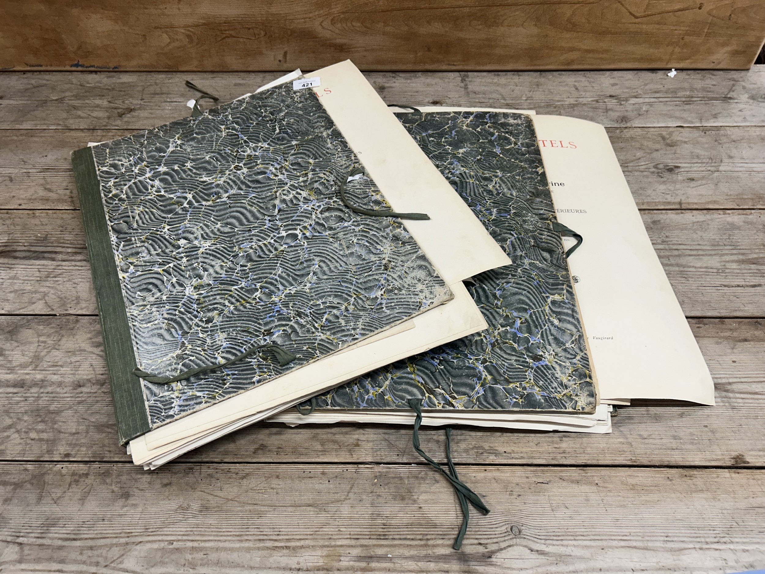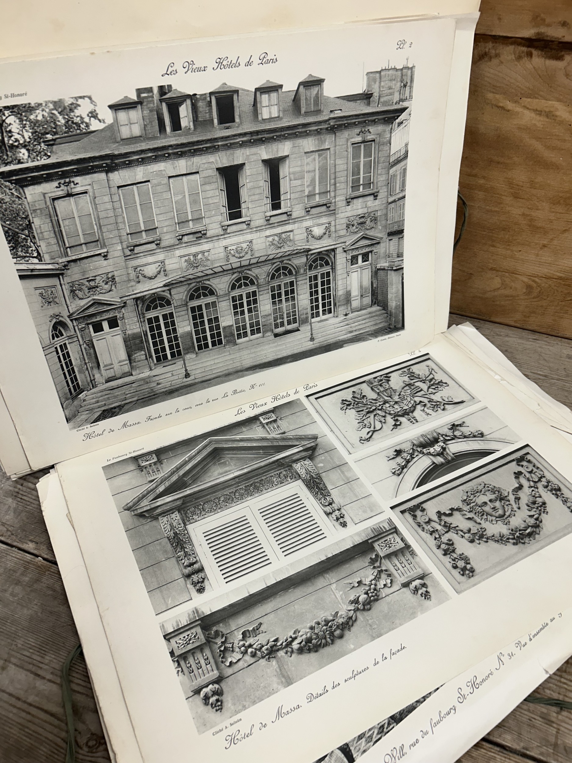 Two French 'Les Vieux Hotels De Paris' folders, containing a series of architectural themed plates depicting an assortment of Paris residencies, each with marbled board covers (2)
