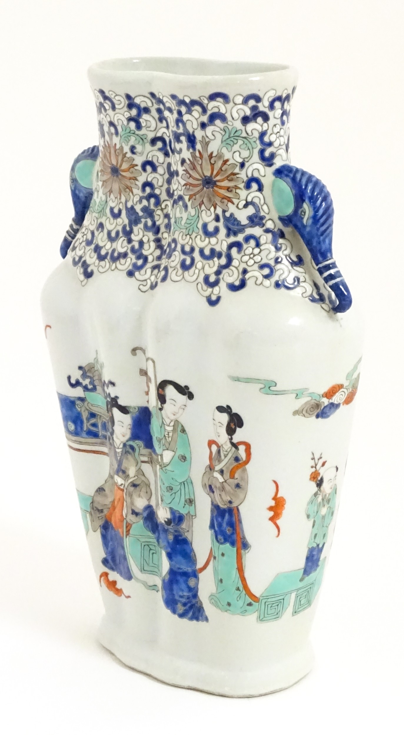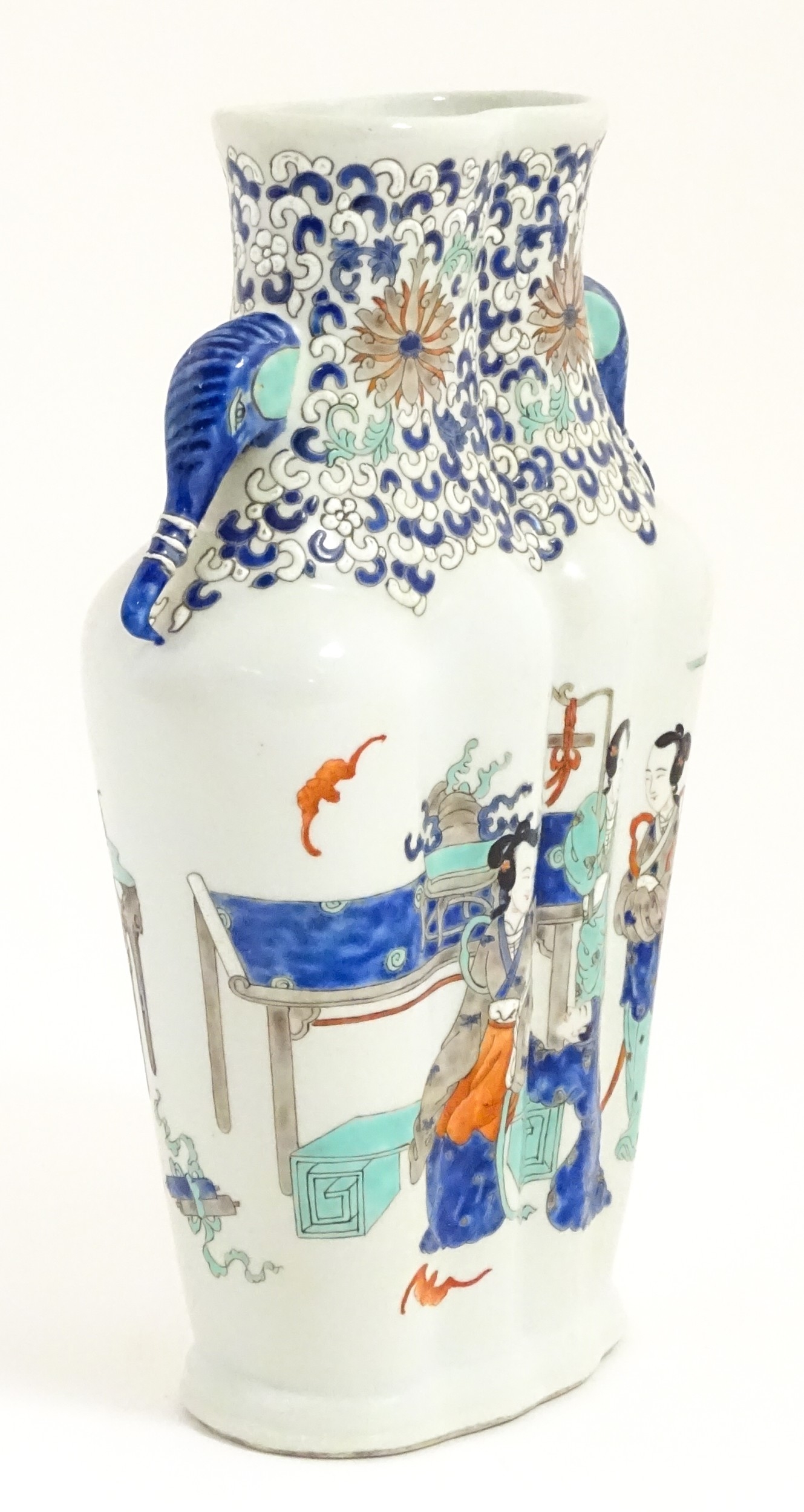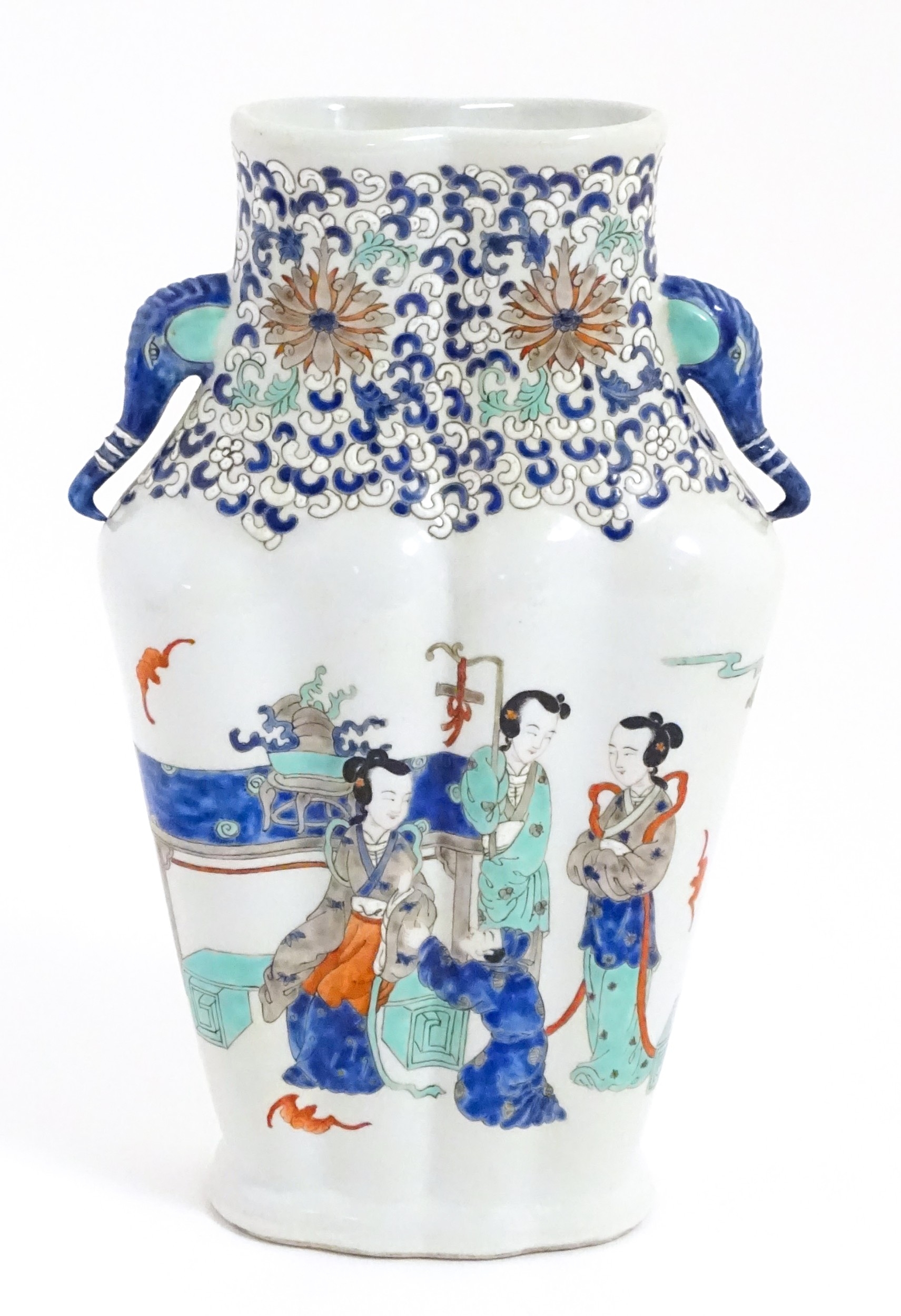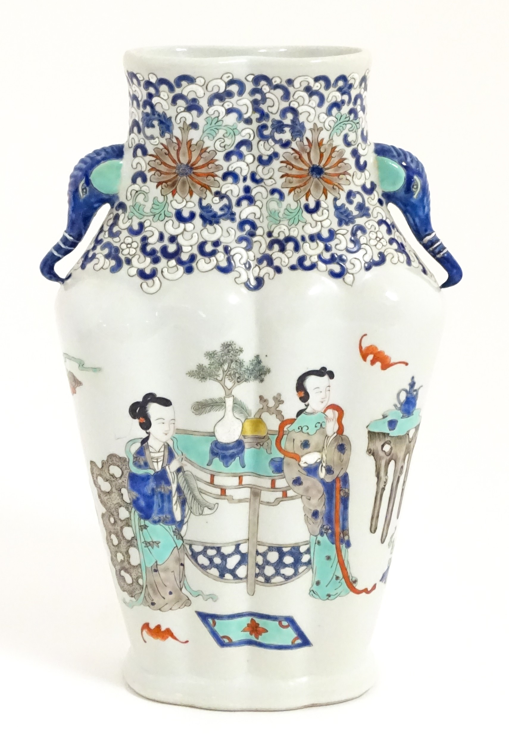 A Chinese famille rose vase with twin elephant mask handles decorated with figures. Character marks under. Approx. 9 3/4" high