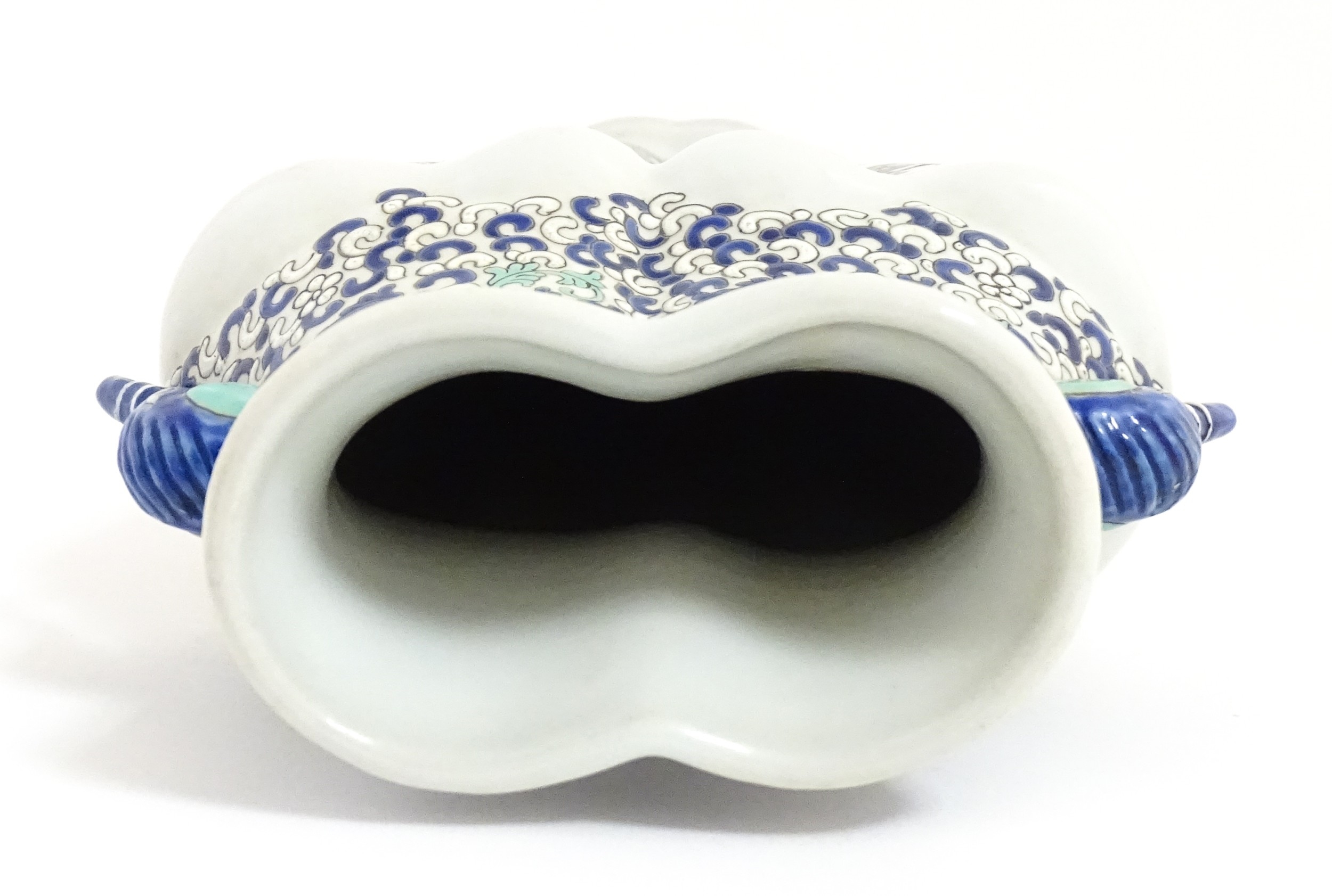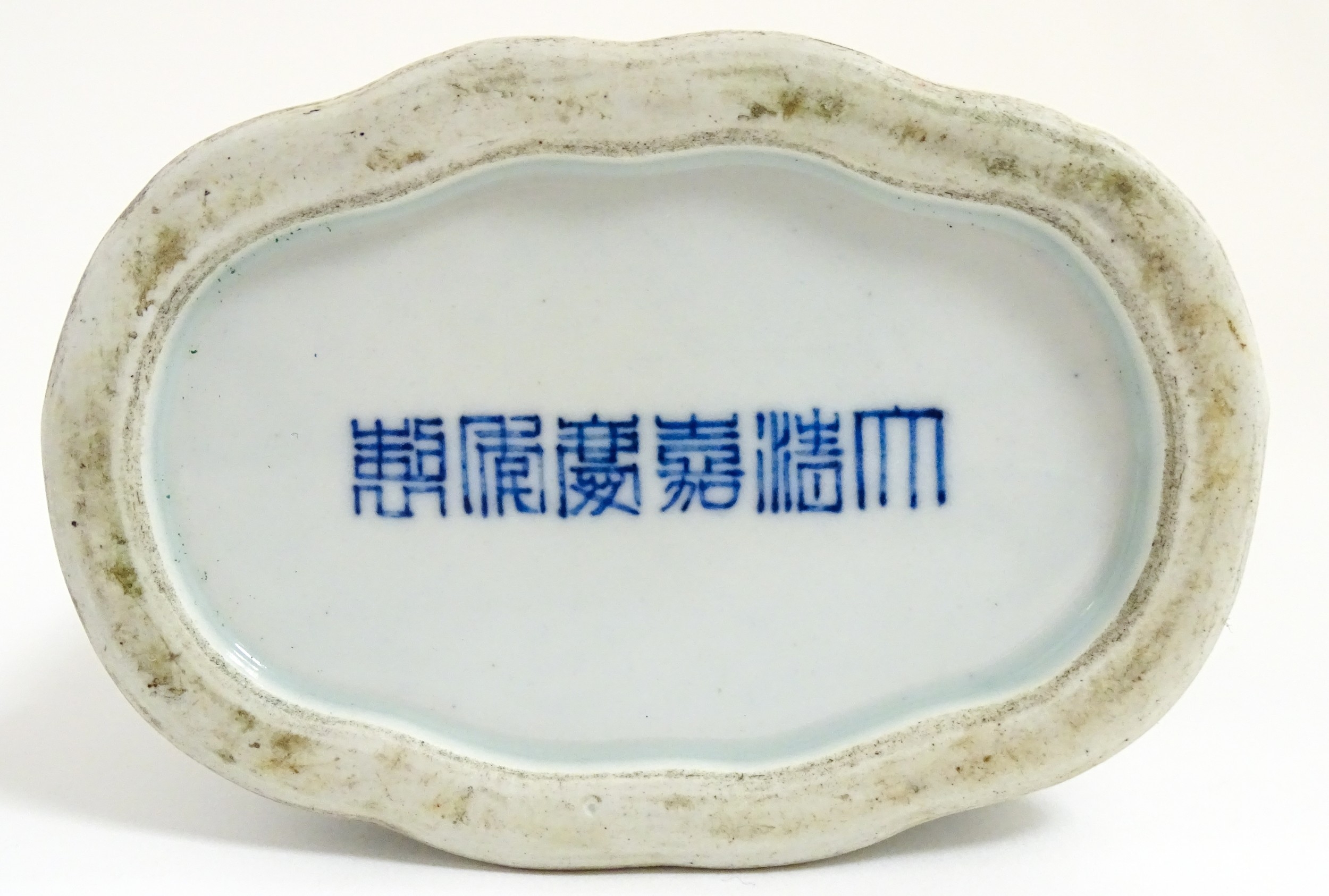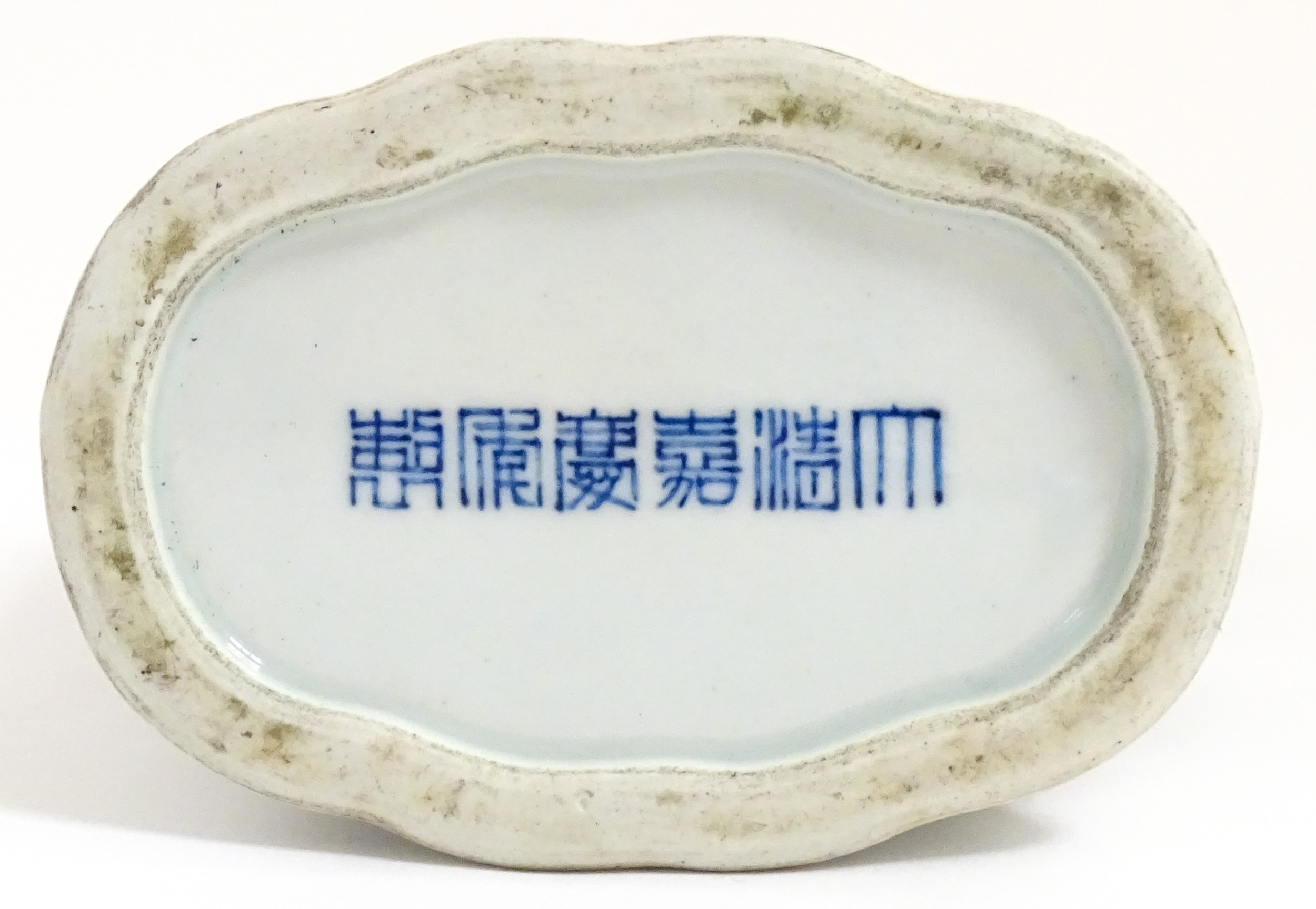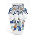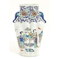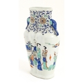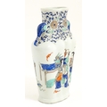 A Chinese famille rose vase with twin elephant mask handles decorated with figures. Character marks under. Approx. 9 3/4" high