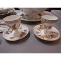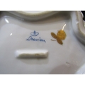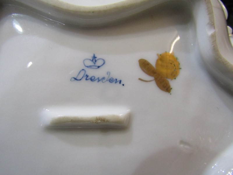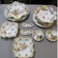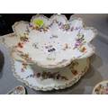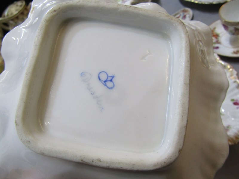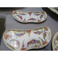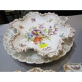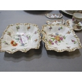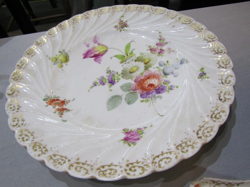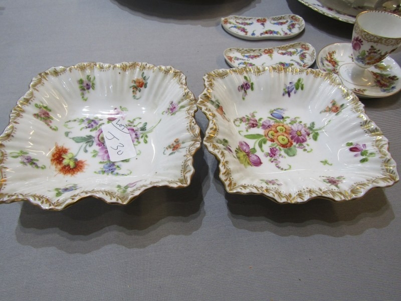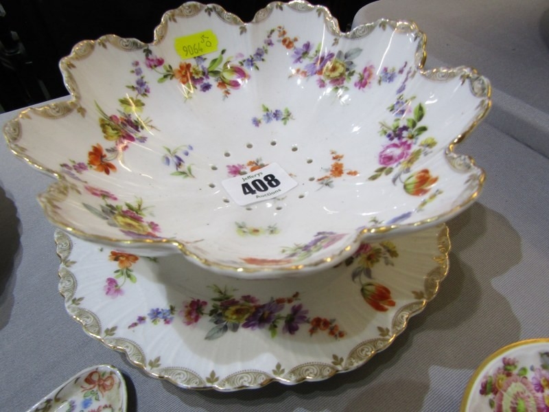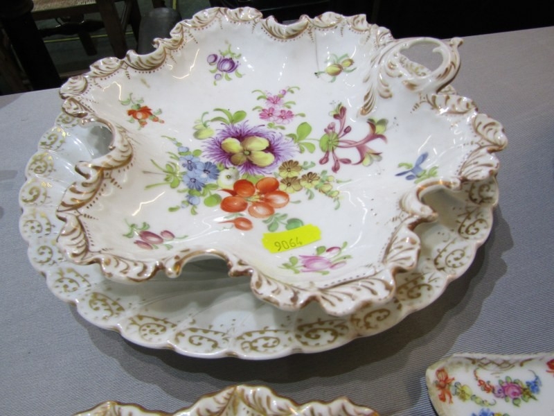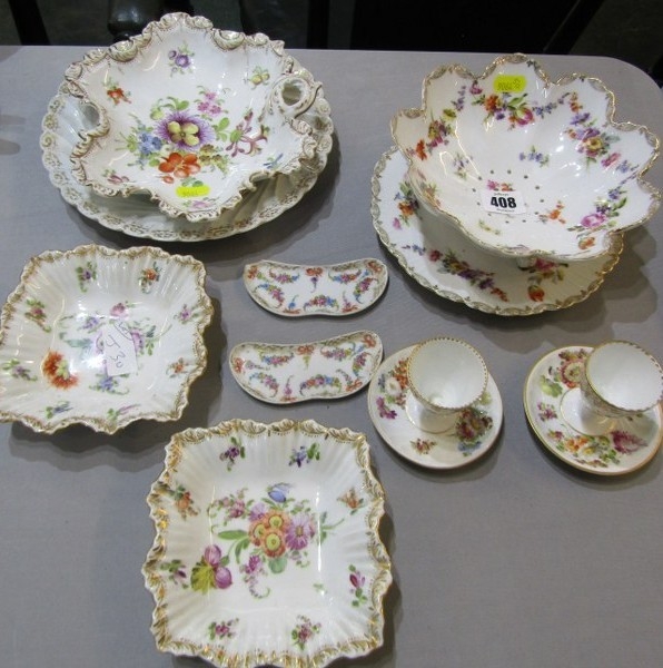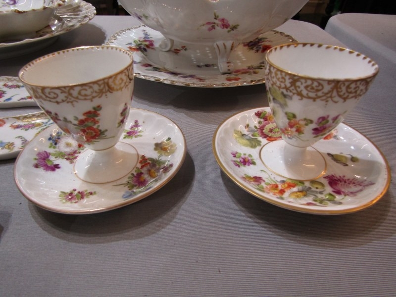 DRESDEN, collection of gilt and floral decorated tableware, including pair of egg cups, scallop edge strainer and serving dishes
