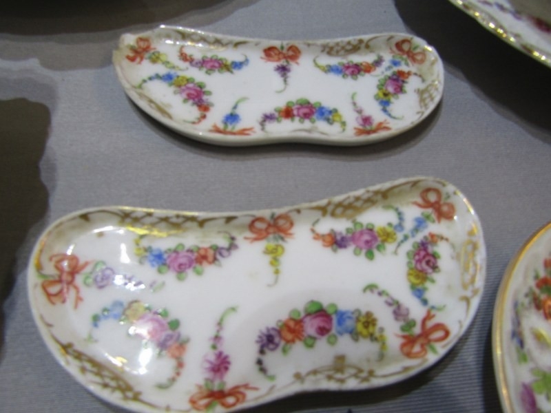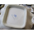 One handled dish with hairline crack and rim chips. One square dish with rim chip. One small dish with rim chips. All other pieces in good condition. See photos.