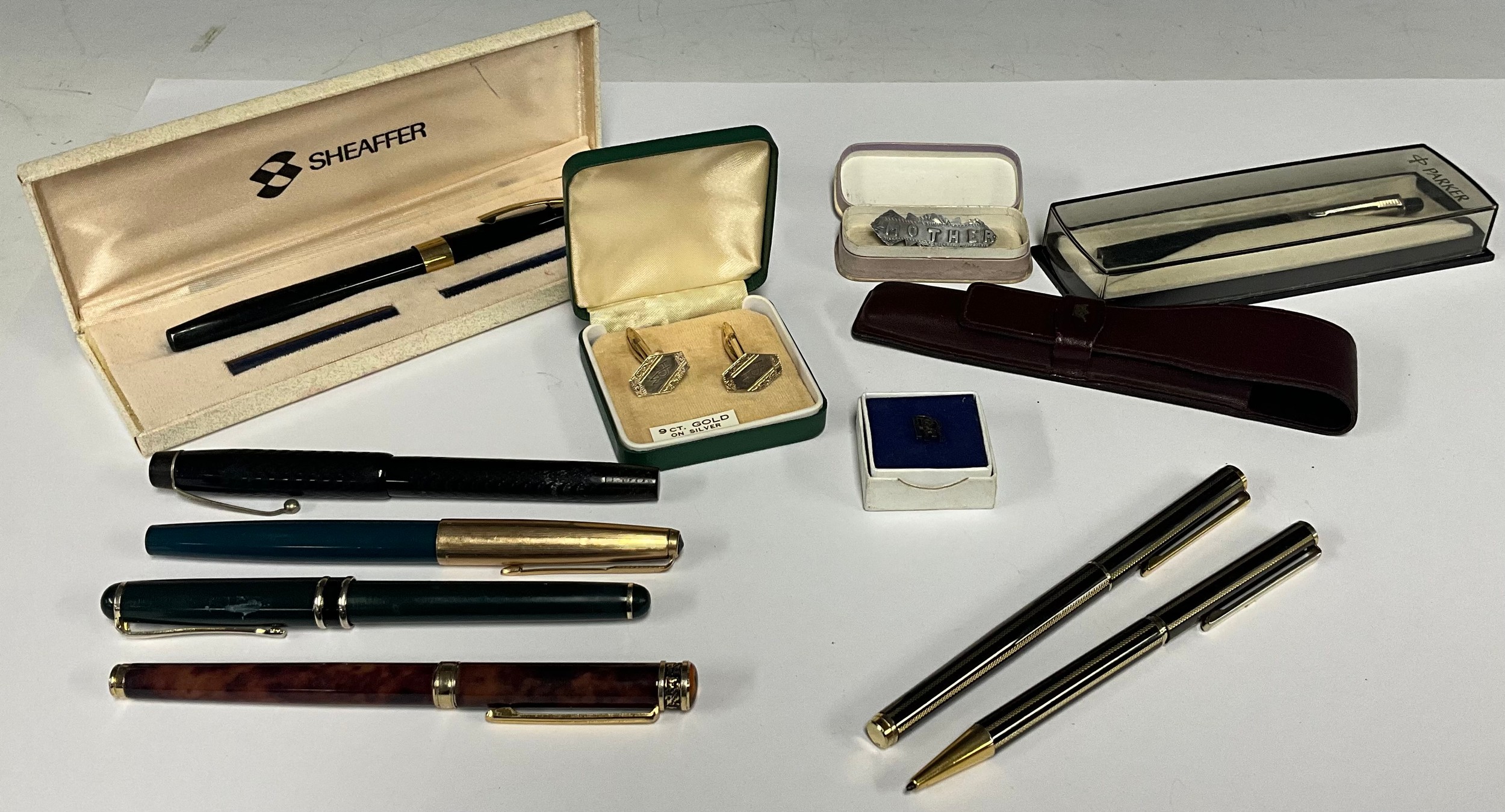 A Rolls Royce RR silver tie pin, boxed; Mother brooch; pair of 9ct gold on silver cufflinks, fountain pens, roller balls etc inc Parker rolled gold and blue fountain pen, De La Rue & Co Onoto, Sheaffer etc, part boxed
