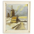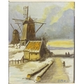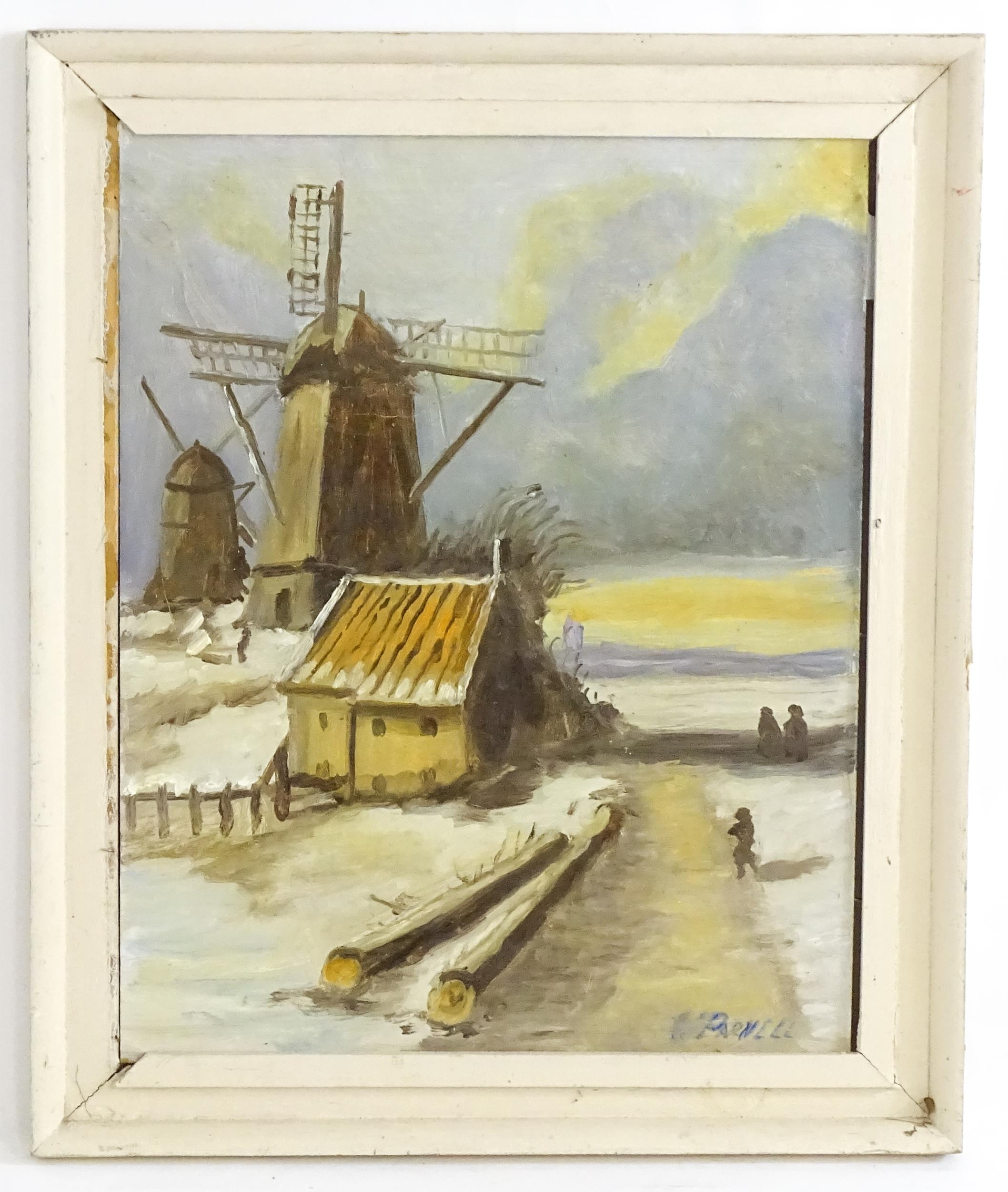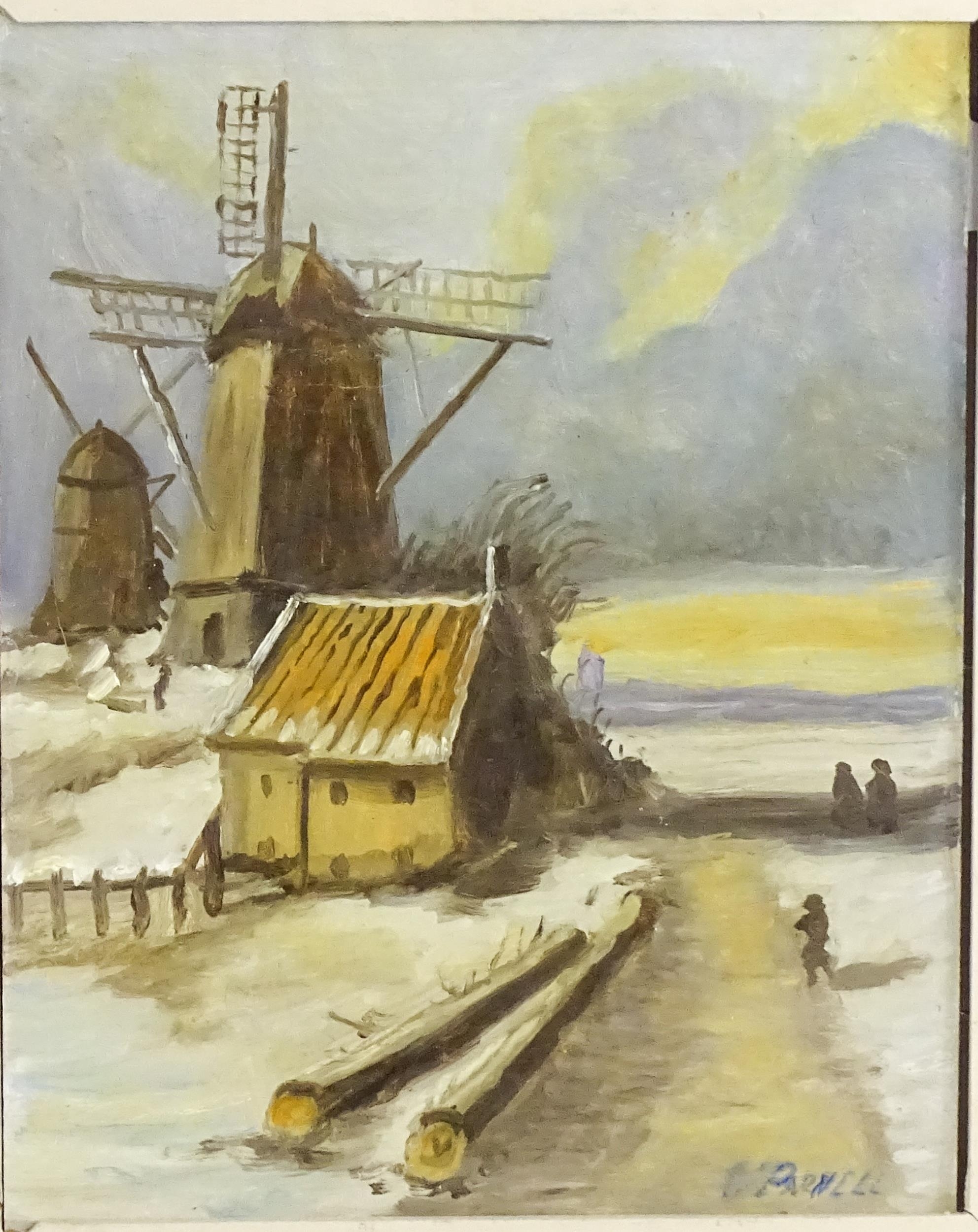 Parnell, Continental School, 20th century, Oil on board, A winter landscape with windmills and figures. Signed lower right. Approx. 18 1/2" x 15"