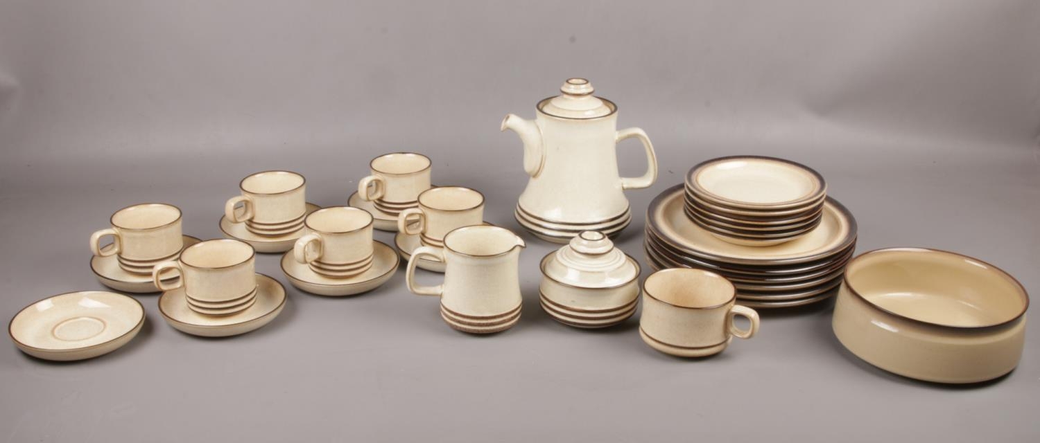 A Denby "Sahara" dinner & tea set consisting of, six dinner plates, six tea cups and seven saucers, teapot, milk jug and sugar bowl etc.