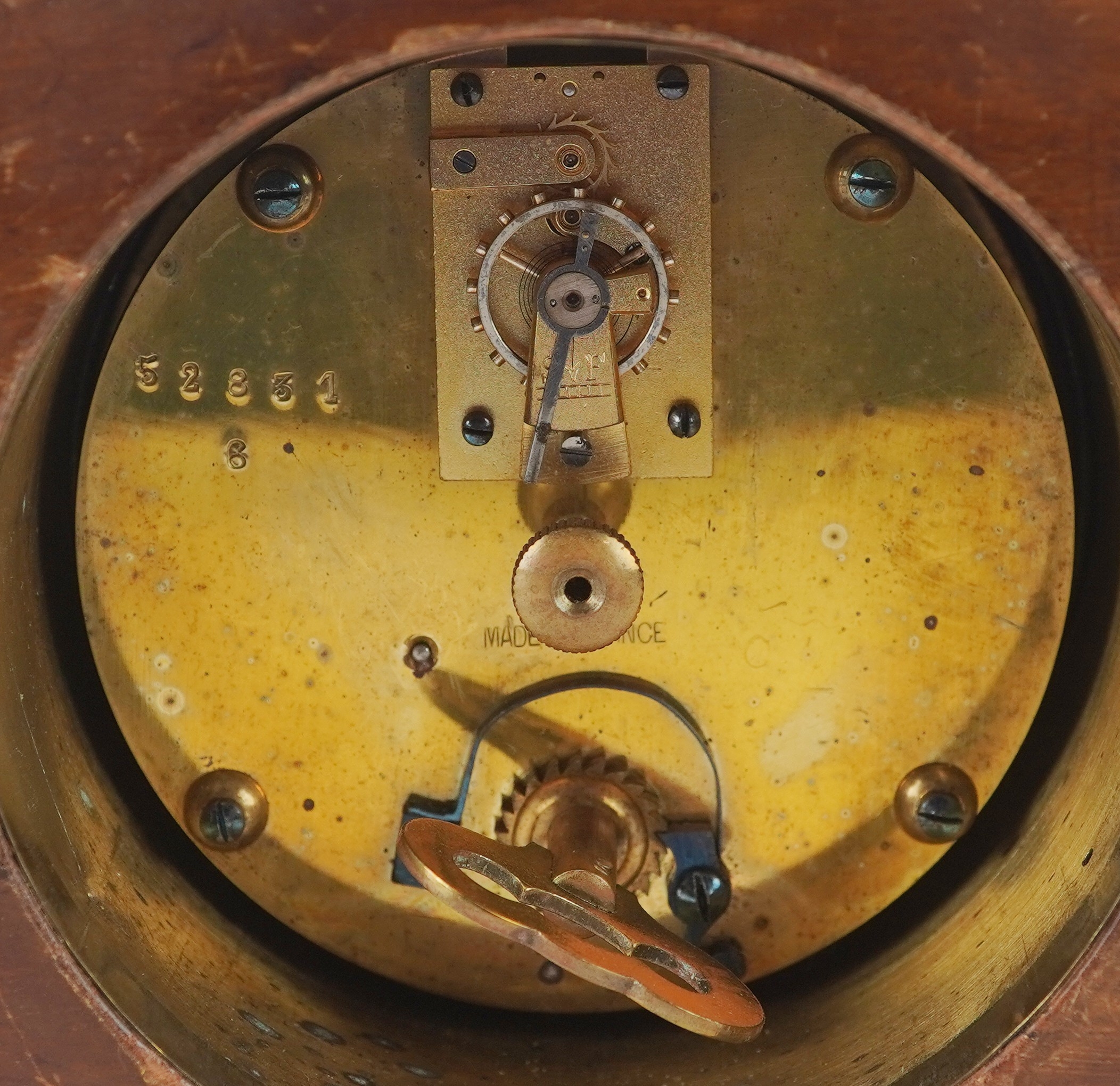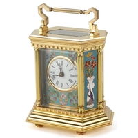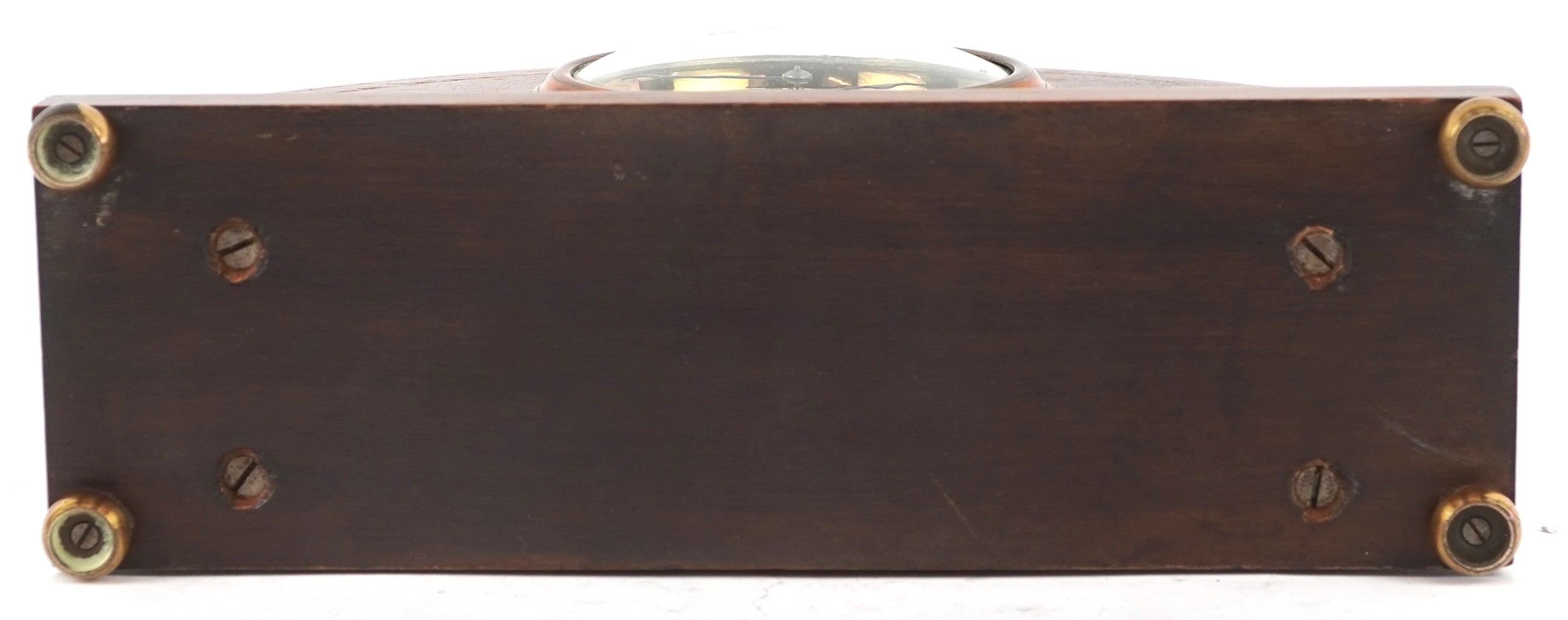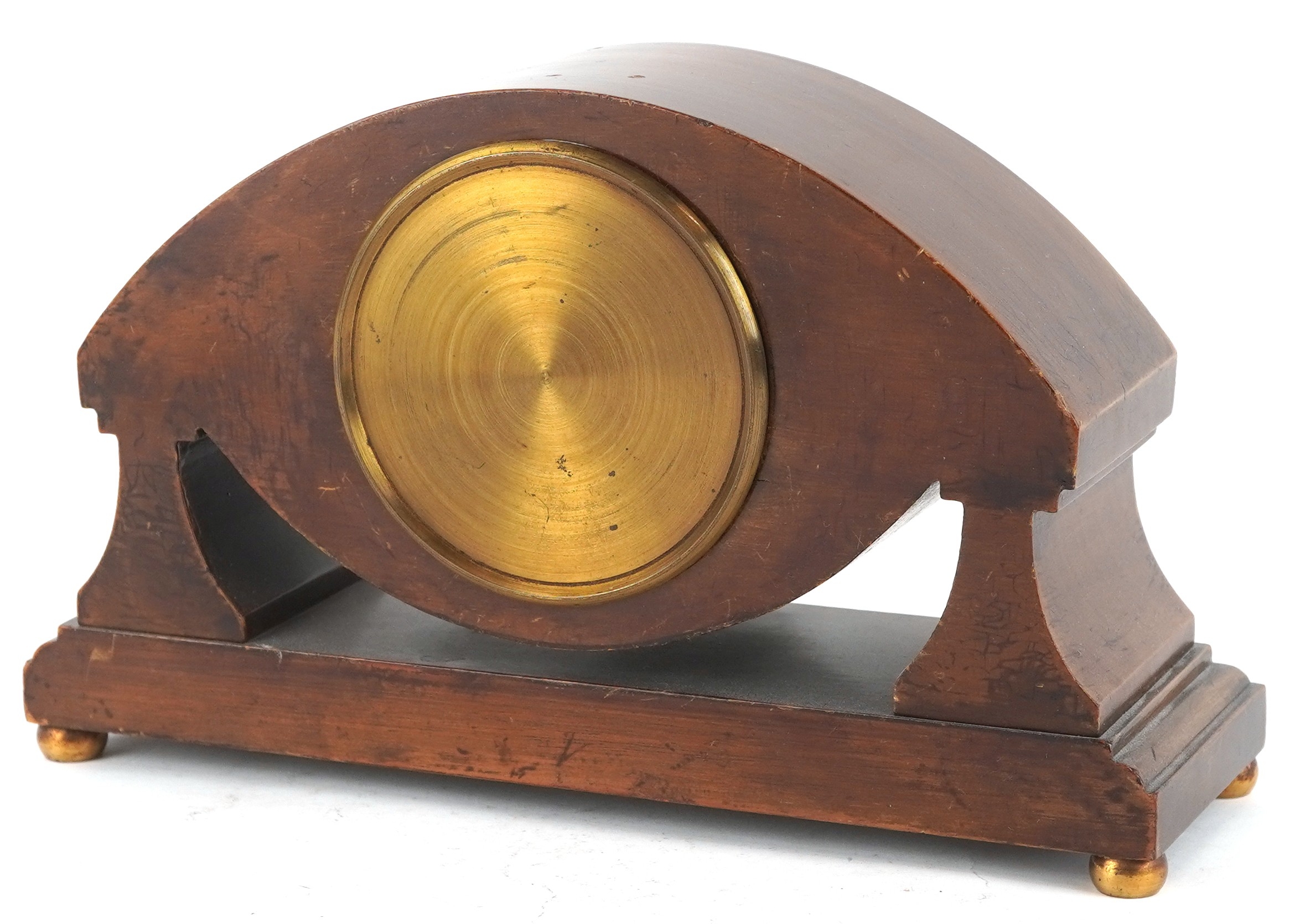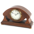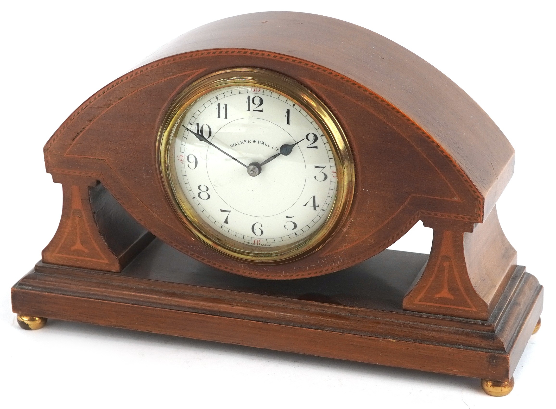 An Edwardian mahogany cased mantle clock with chequer stringing, the white enamelled dial inscribed Walker & Hall, with French movement, raised on gilt metal bun feet, 15cm high.