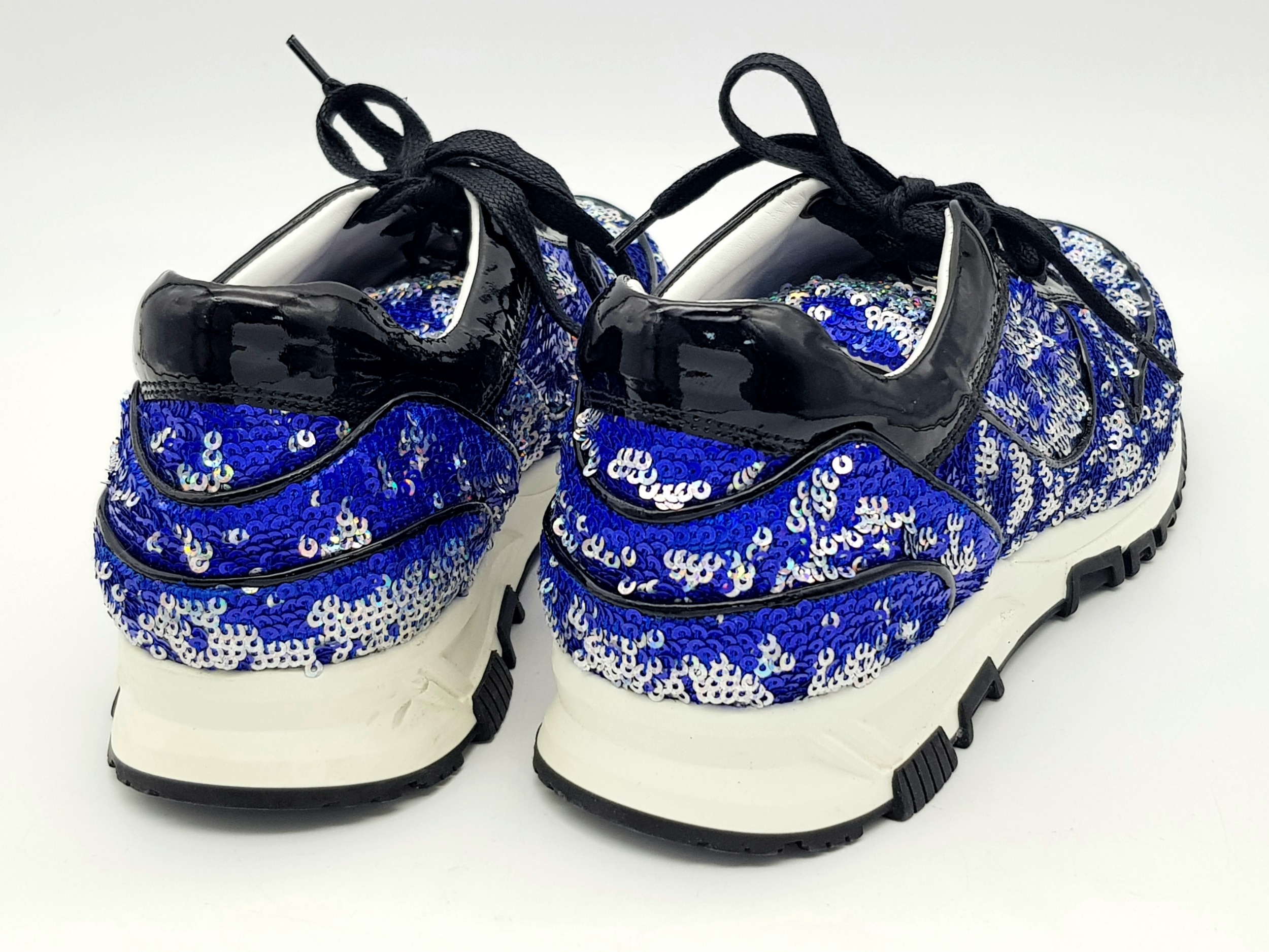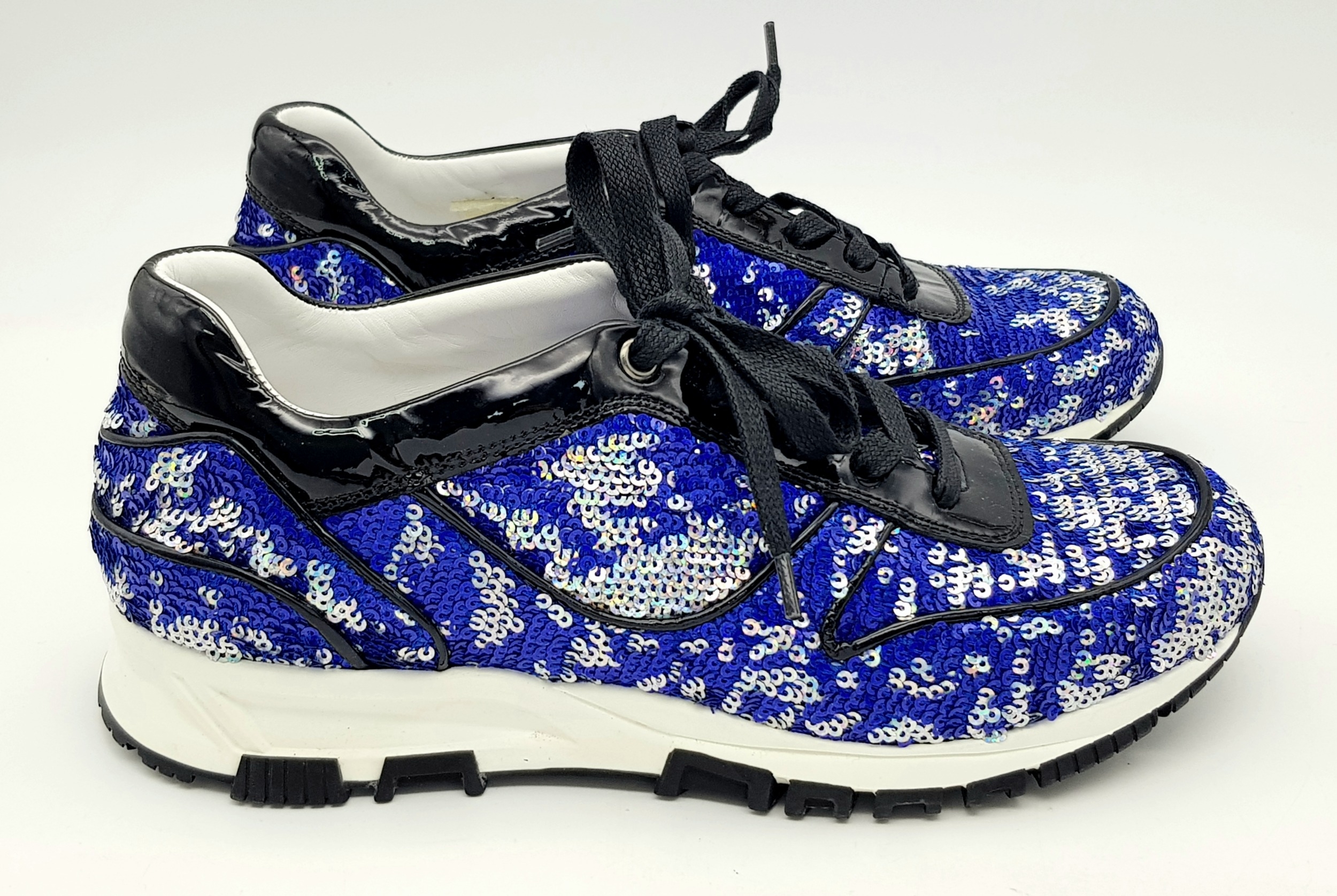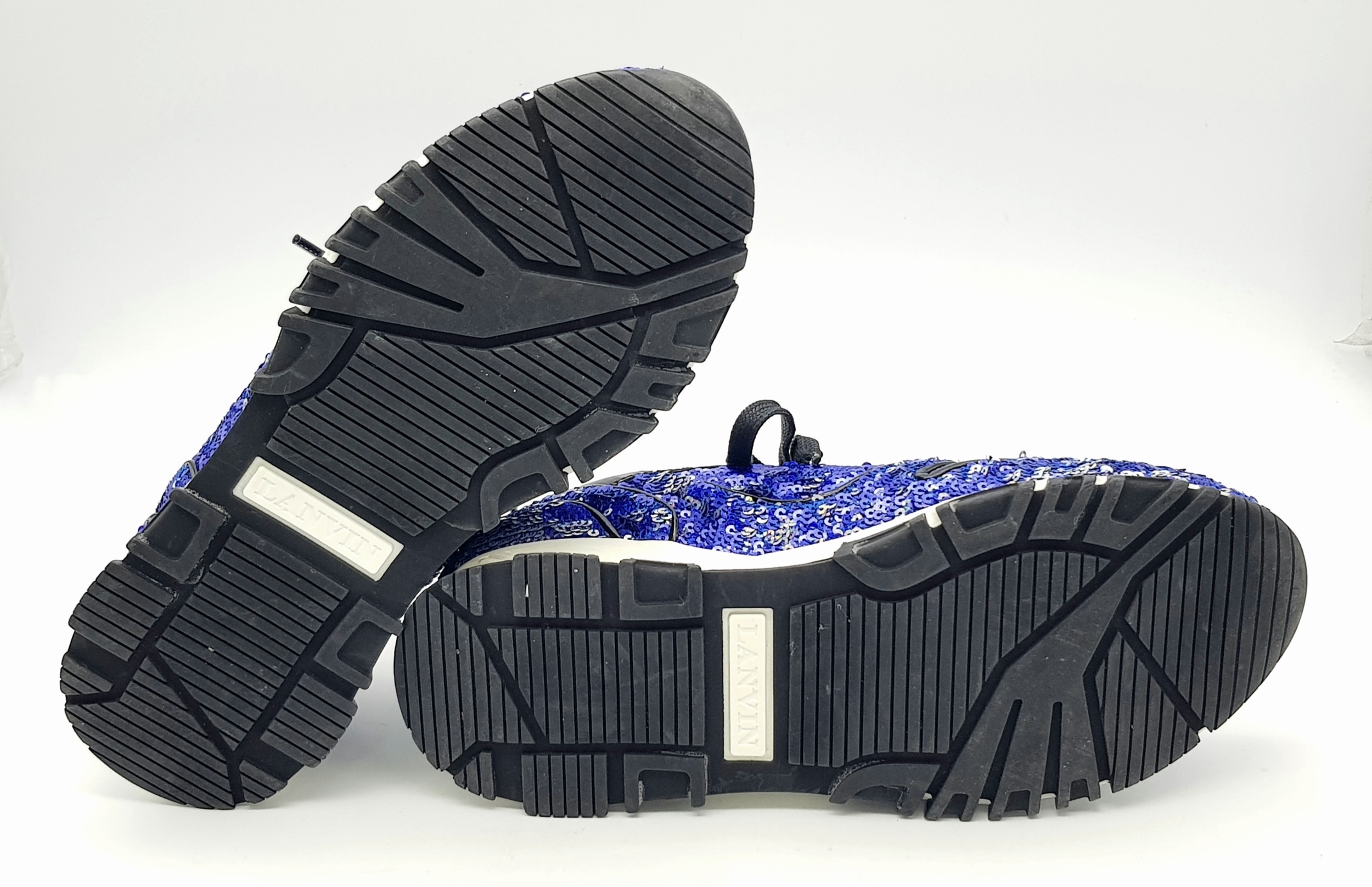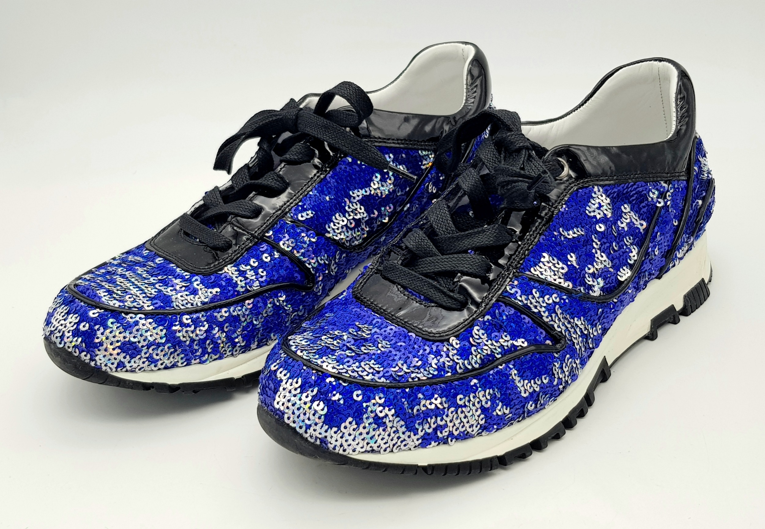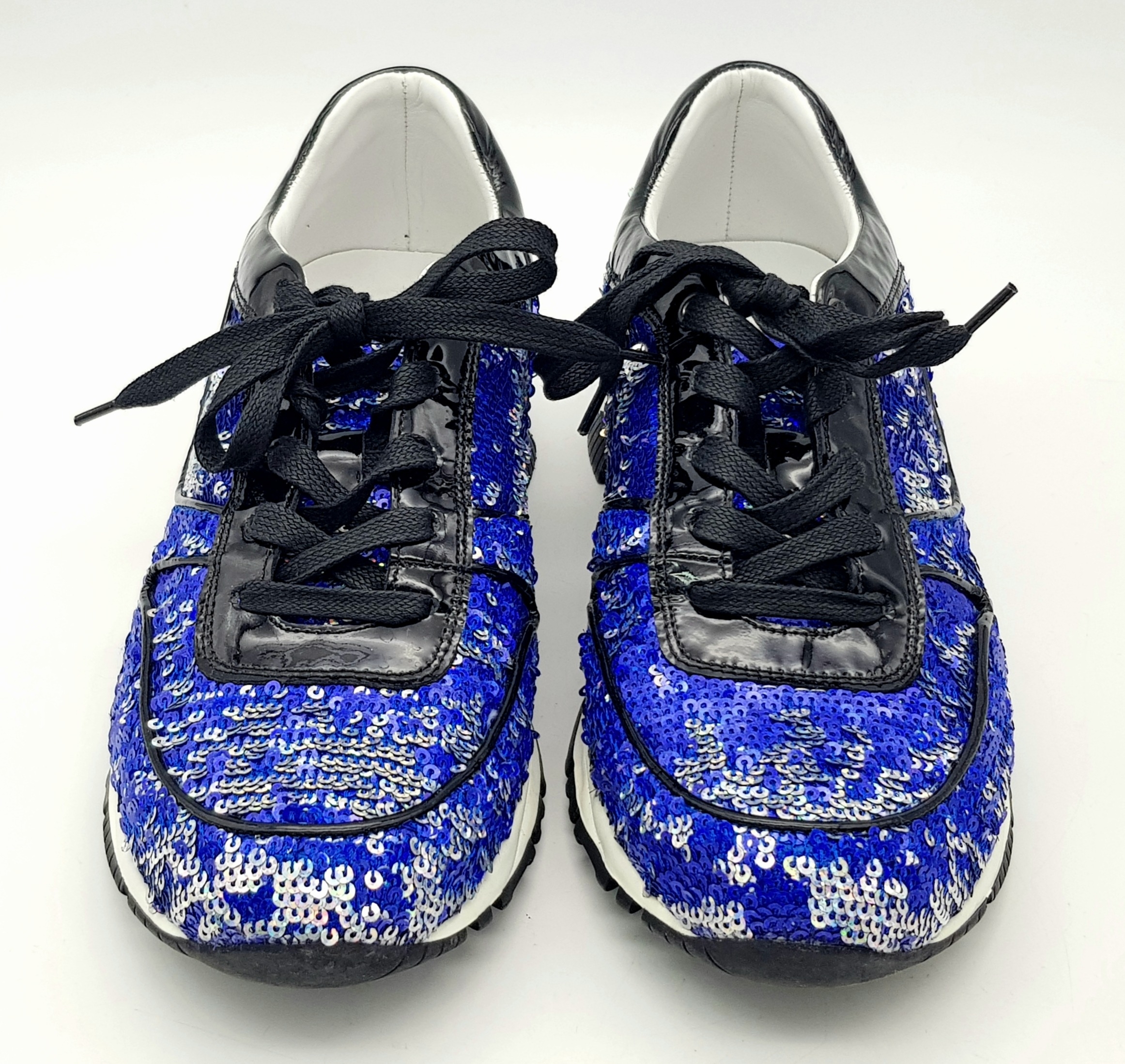 A Pair of Lanvin Blue Sequin Trainers/Sneakers. Patent leather, leather and sequins with laces. European size 38/UK size 5. A few scuffs but in good condition overall - please see photos for conditions or request a condition report.