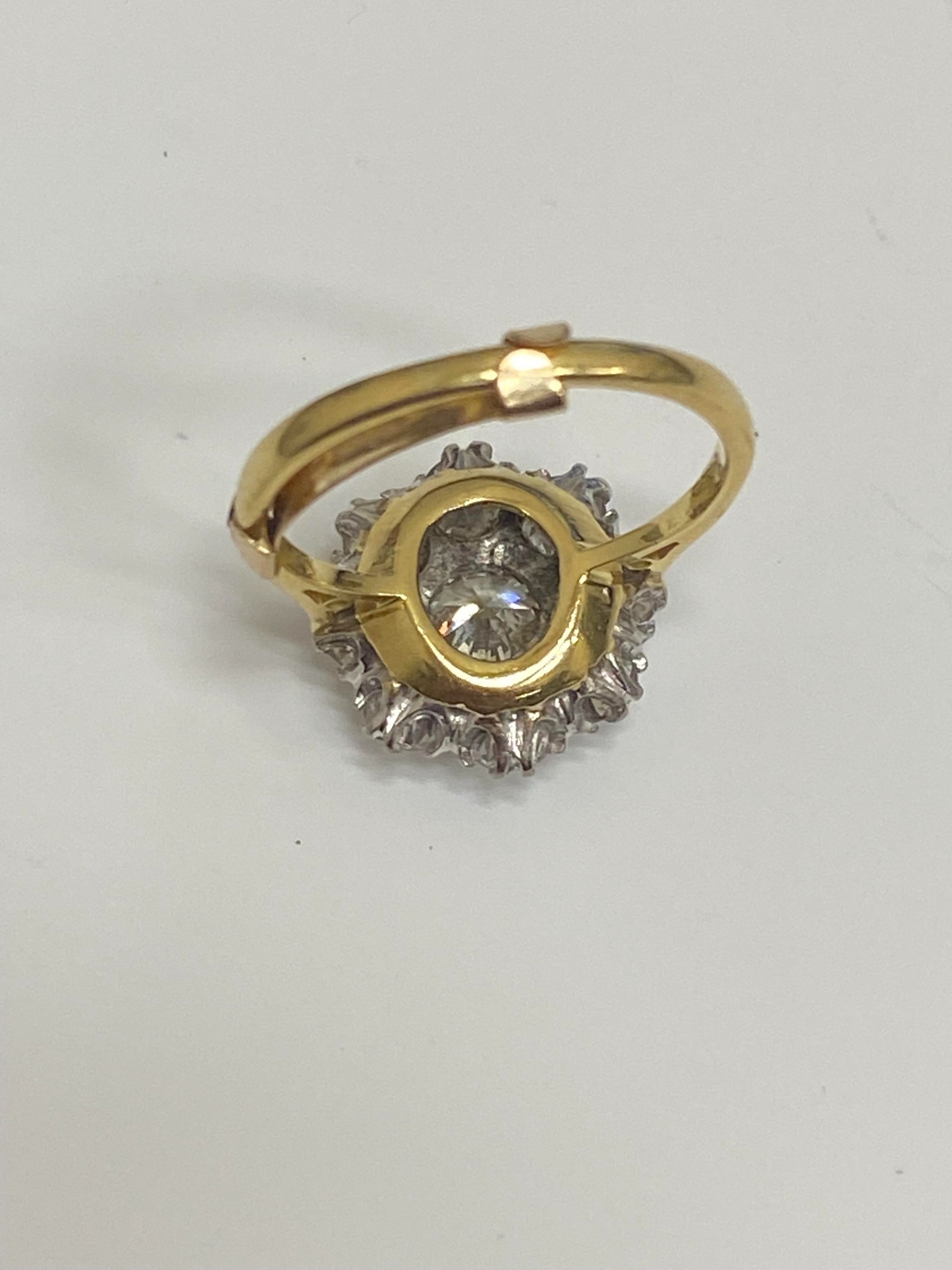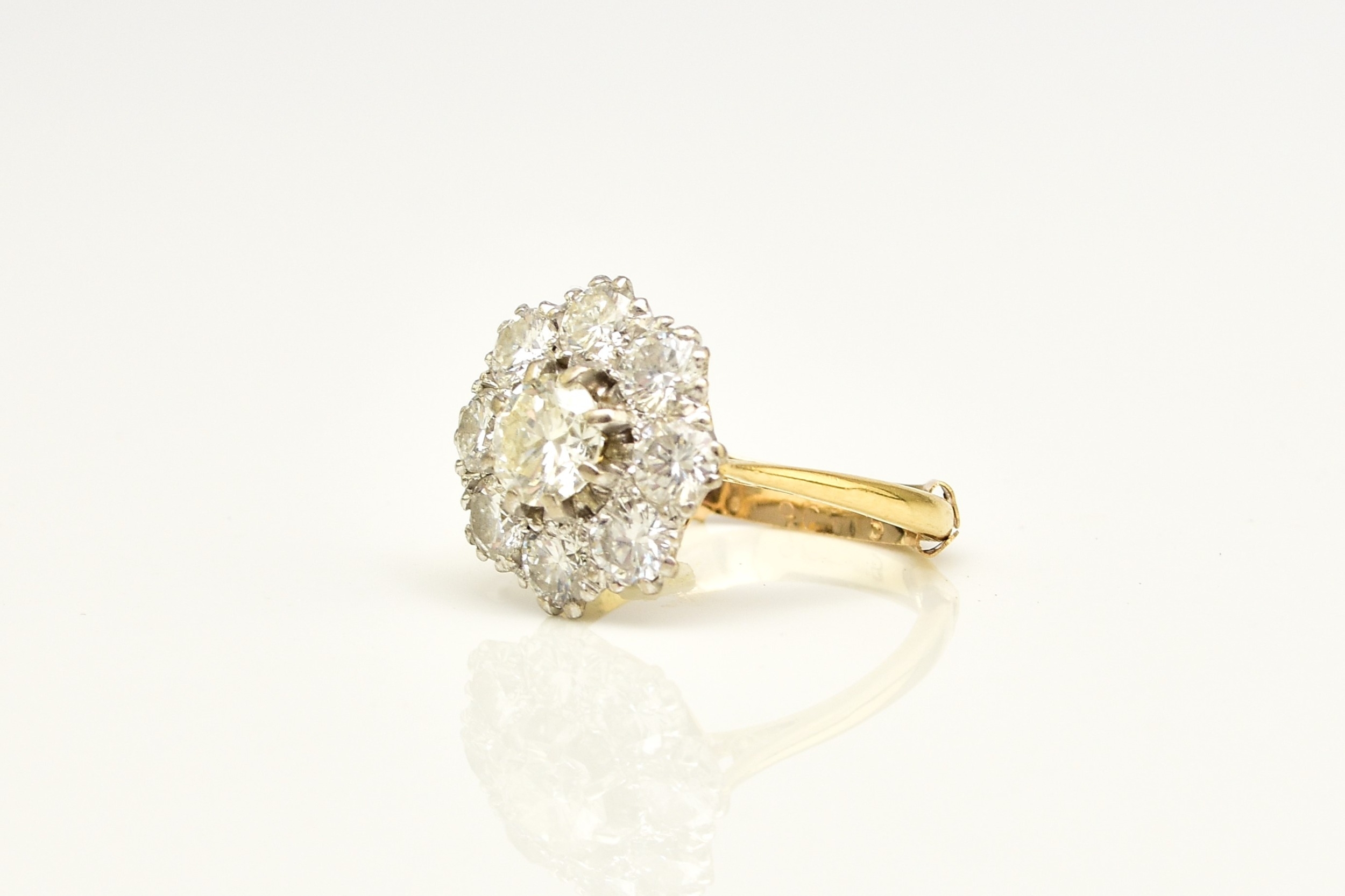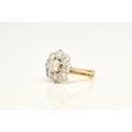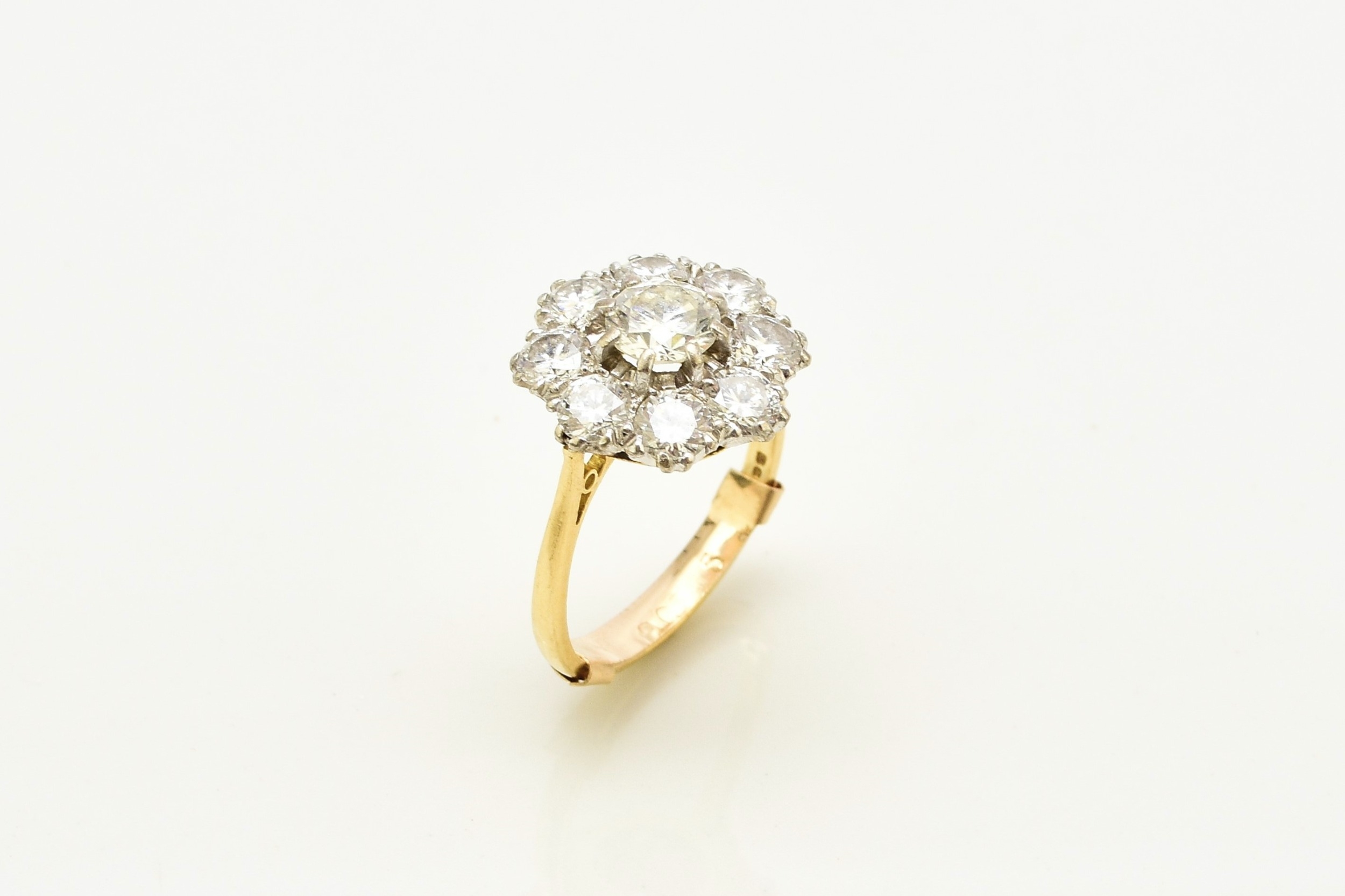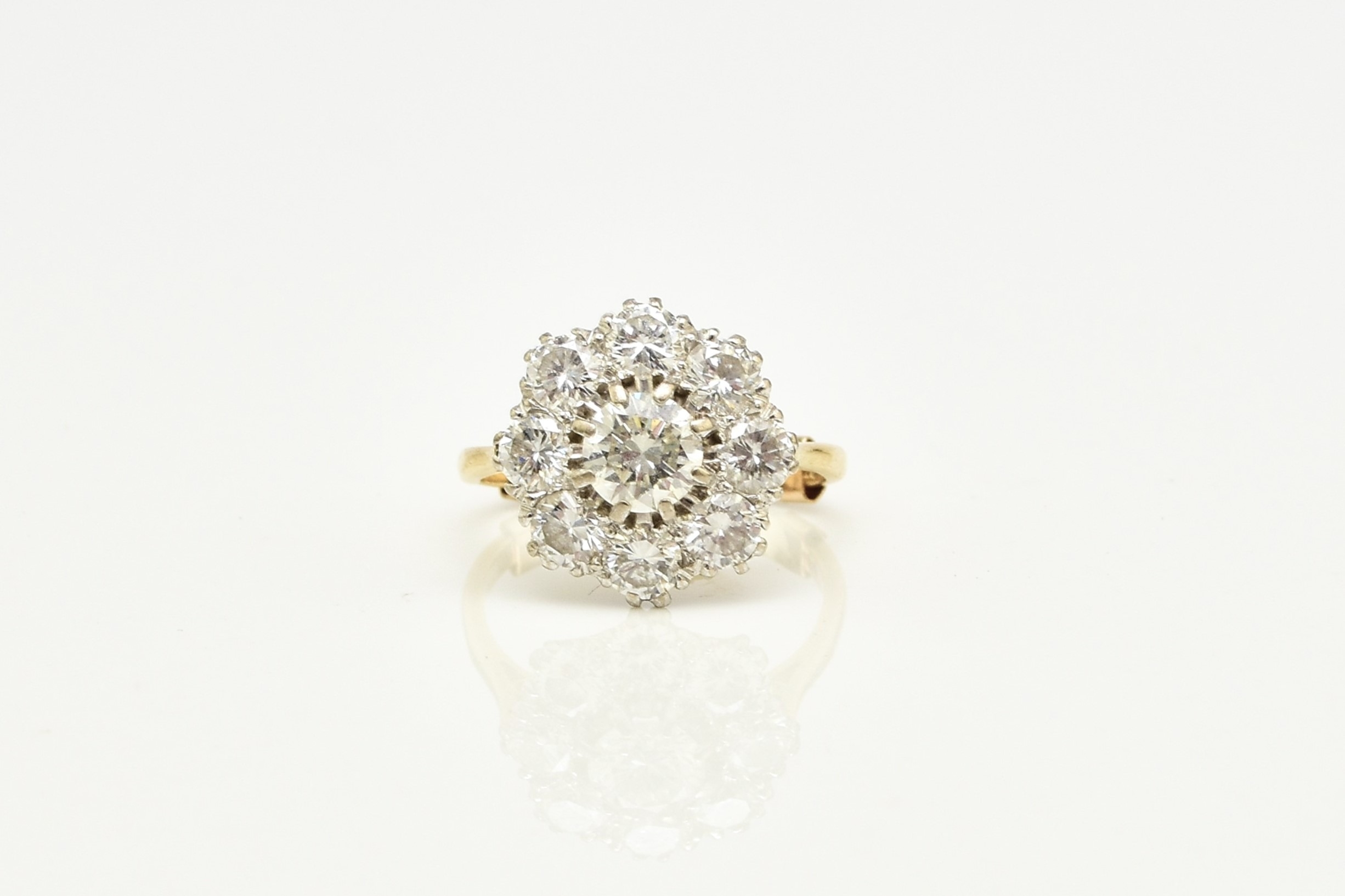 An 18ct gold diamond floral cluster ring, designed as a central brilliant cut diamond claw set in white gold within a border of eight brilliant cut diamonds, the yellow gold shank hallmarked London 1980, ring size K, weight approx 3.3g Condition:Central diamond measures approx 5mm diameter x 3.2mm deep, estimated weight approx 0.50cts, clarity estimated approx VS1-VS2, outer diamonds each measure approx 3.4mm diameter, each estimated to weigh approx 0.14cts, clarity range of smaller stones estimated approx VS2-SI1, colour range estimated approx H/I, hallmarks clear, general wear but no obvious damage, refer to images