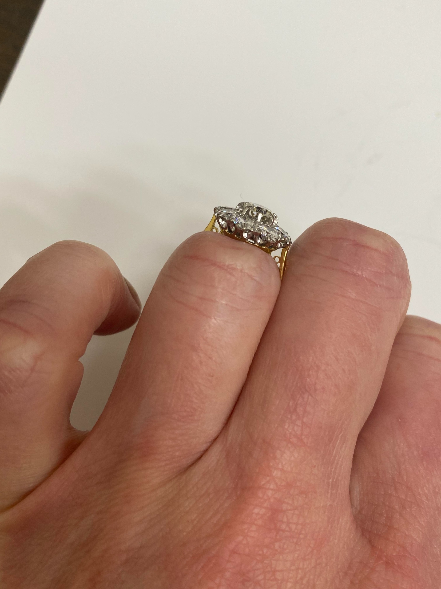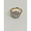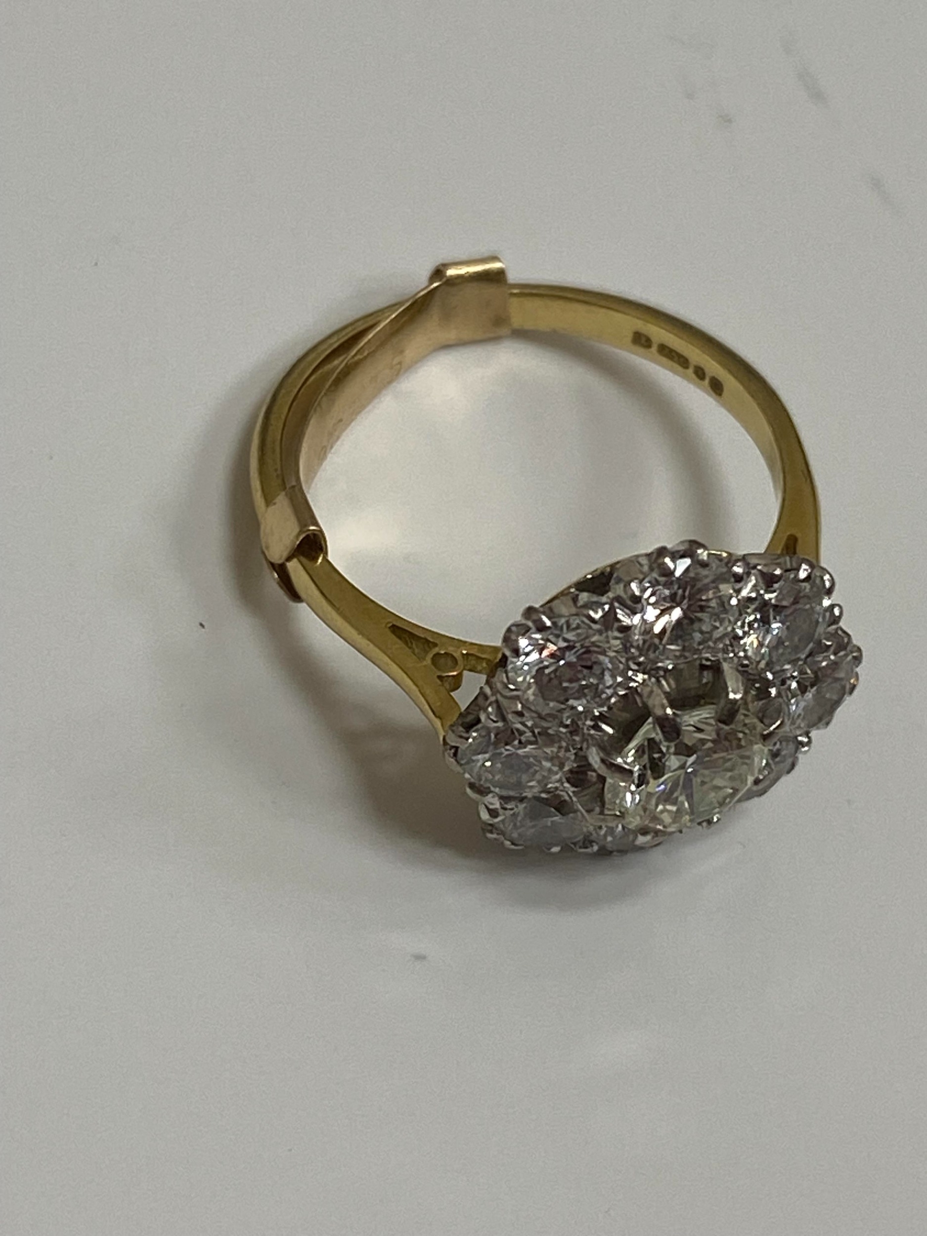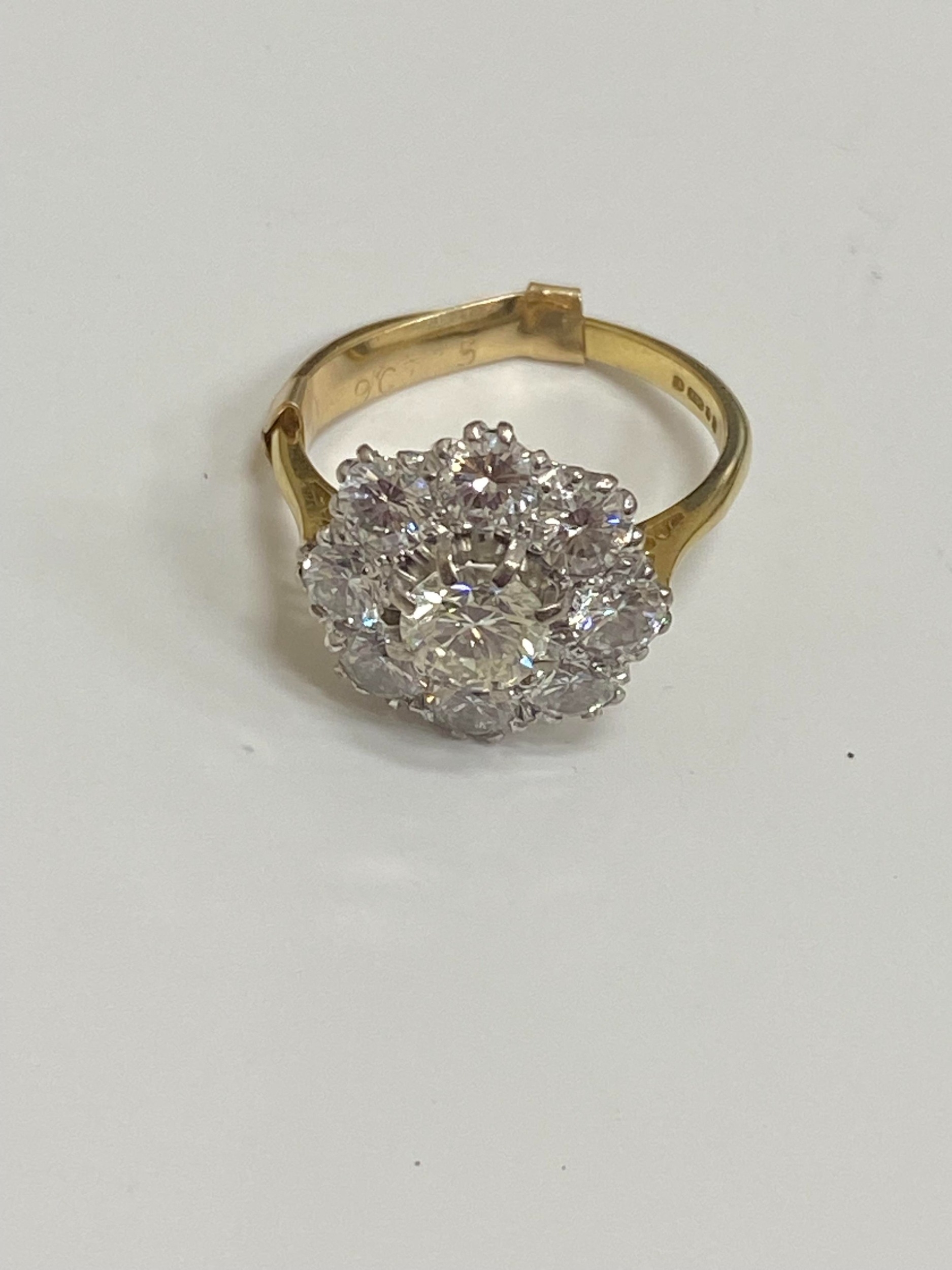 An 18ct gold diamond floral cluster ring, designed as a central brilliant cut diamond claw set in white gold within a border of eight brilliant cut diamonds, the yellow gold shank hallmarked London 1980, ring size K, weight approx 3.3g Condition:Central diamond measures approx 5mm diameter x 3.2mm deep, estimated weight approx 0.50cts, clarity estimated approx VS1-VS2, outer diamonds each measure approx 3.4mm diameter, each estimated to weigh approx 0.14cts, clarity range of smaller stones estimated approx VS2-SI1, colour range estimated approx H/I, hallmarks clear, general wear but no obvious damage, refer to images