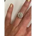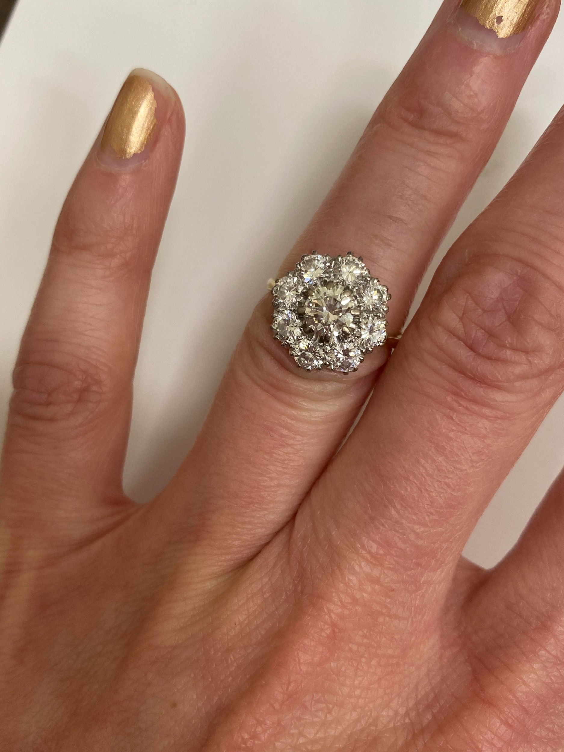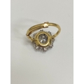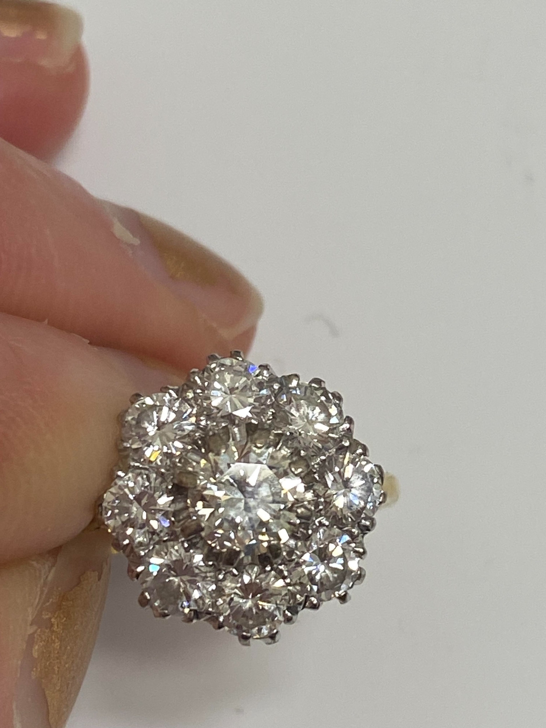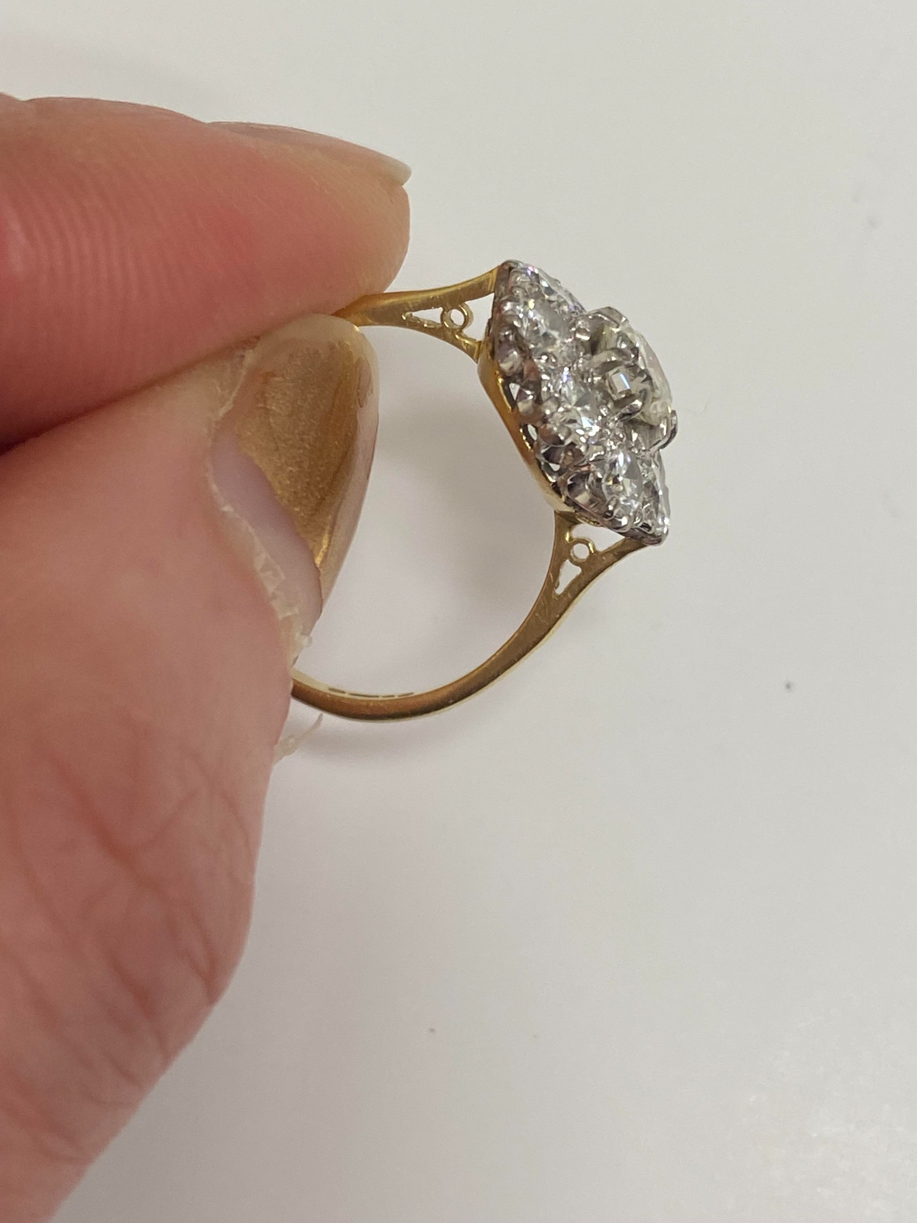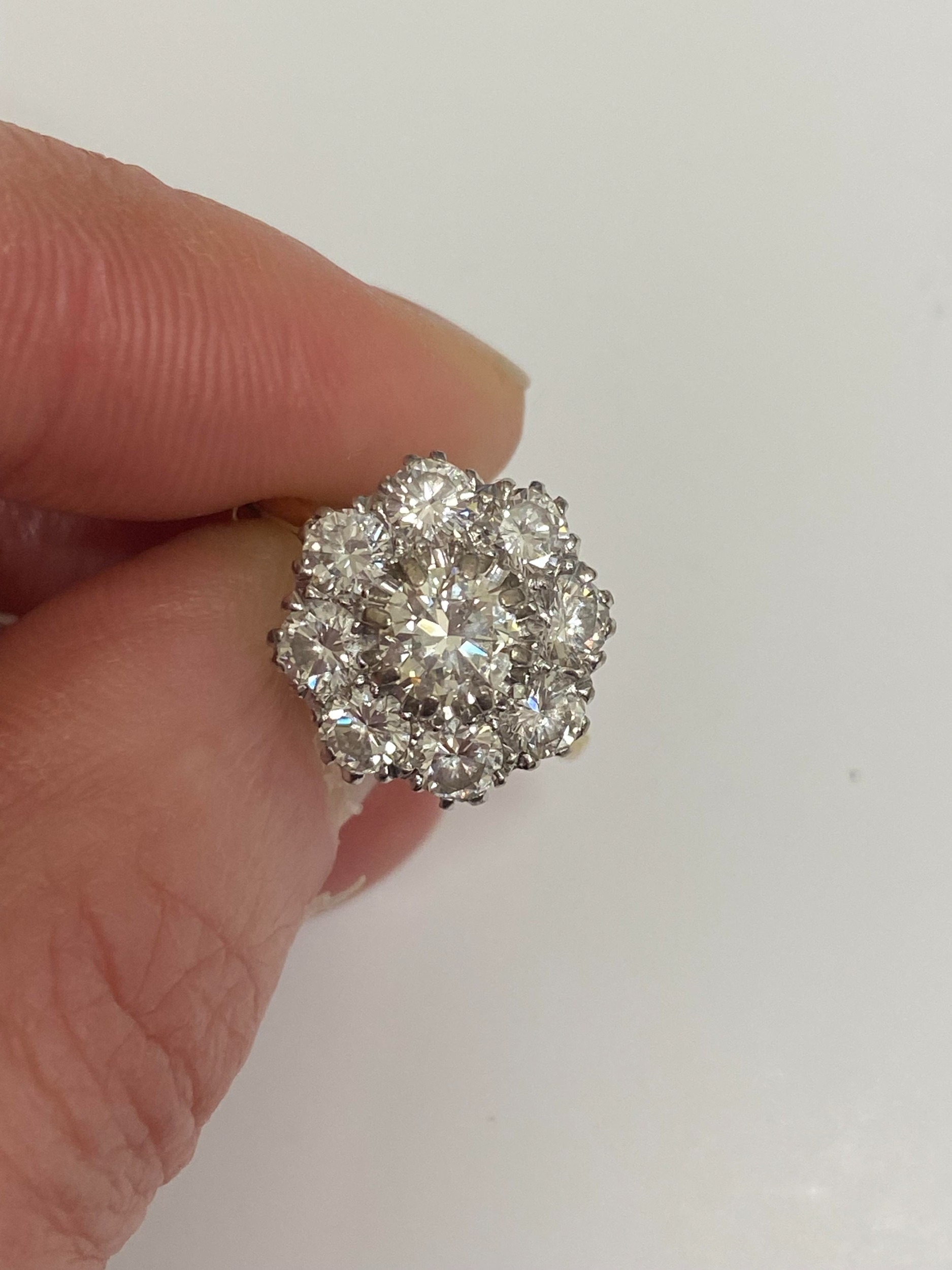 An 18ct gold diamond floral cluster ring, designed as a central brilliant cut diamond claw set in white gold within a border of eight brilliant cut diamonds, the yellow gold shank hallmarked London 1980, ring size K, weight approx 3.3g Condition:Central diamond measures approx 5mm diameter x 3.2mm deep, estimated weight approx 0.50cts, clarity estimated approx VS1-VS2, outer diamonds each measure approx 3.4mm diameter, each estimated to weigh approx 0.14cts, clarity range of smaller stones estimated approx VS2-SI1, colour range estimated approx H/I, hallmarks clear, general wear but no obvious damage, refer to images