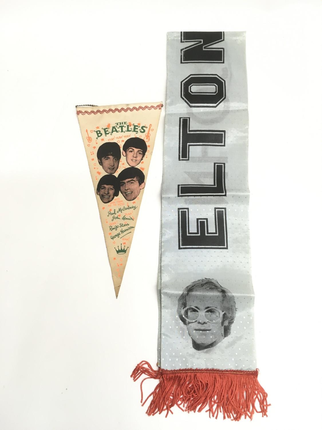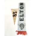 An original 1960s Beatles pennant, 1970s Elton John scarf and a vintage Reveille poster of Elvis Presley (3).