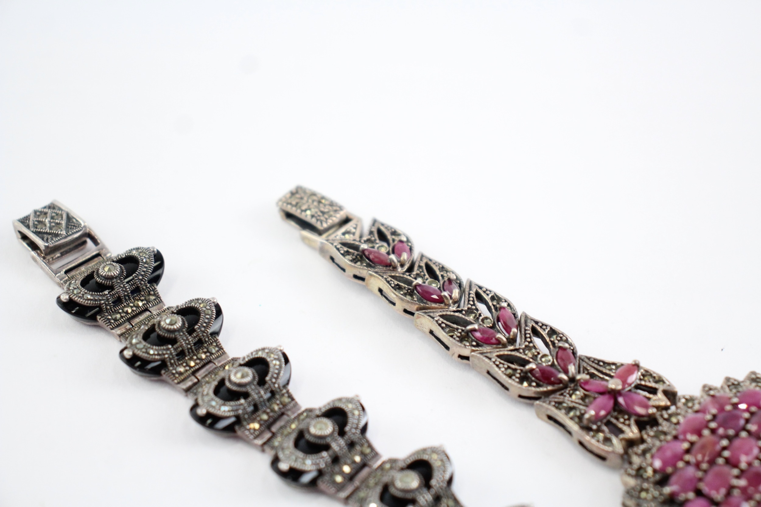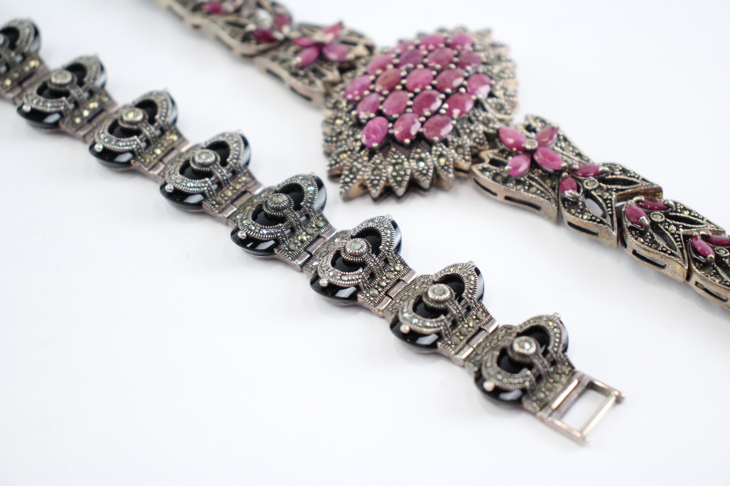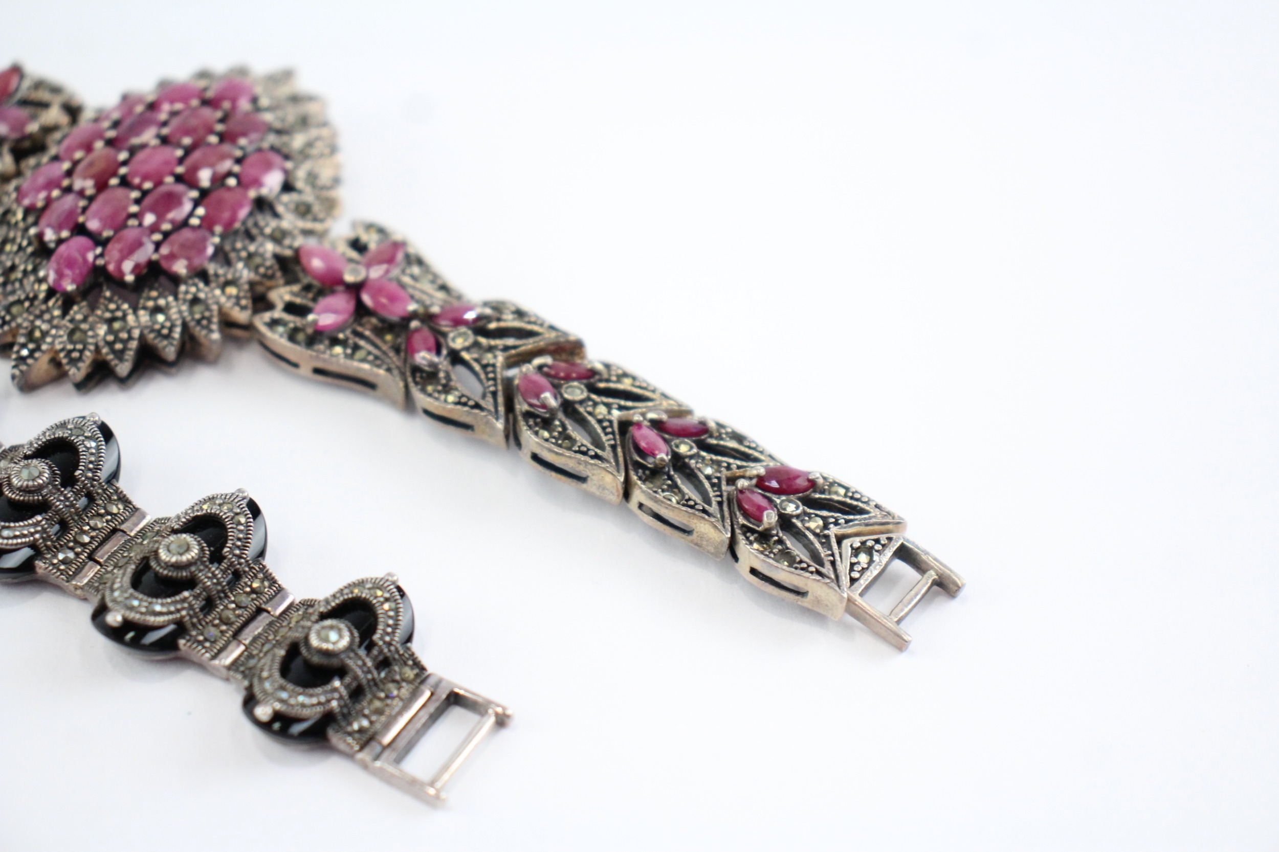 Collection of Sterling Silver Marcasite Bracelets, inc. Enhanced Ruby x 2 (114g)