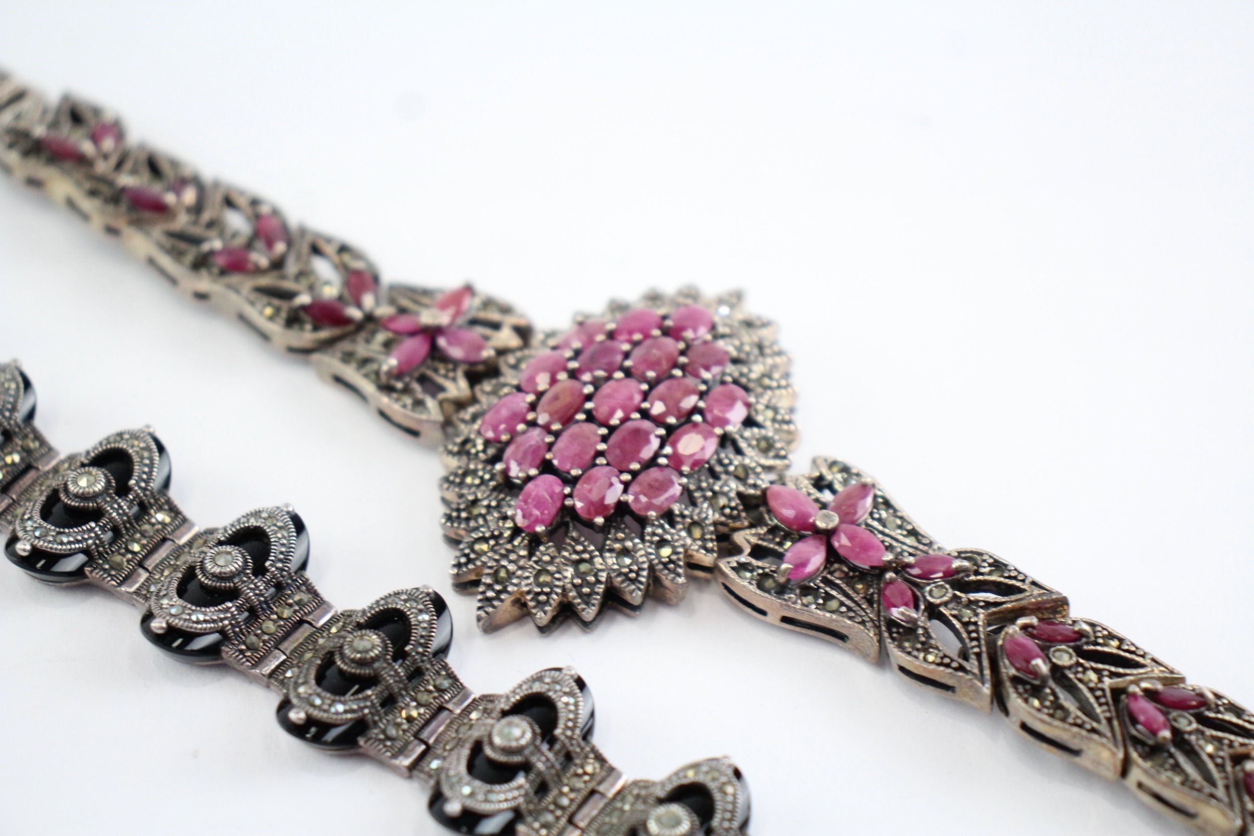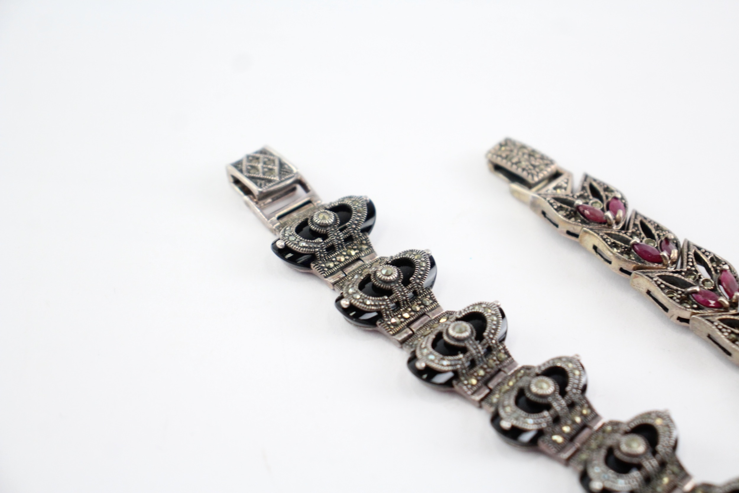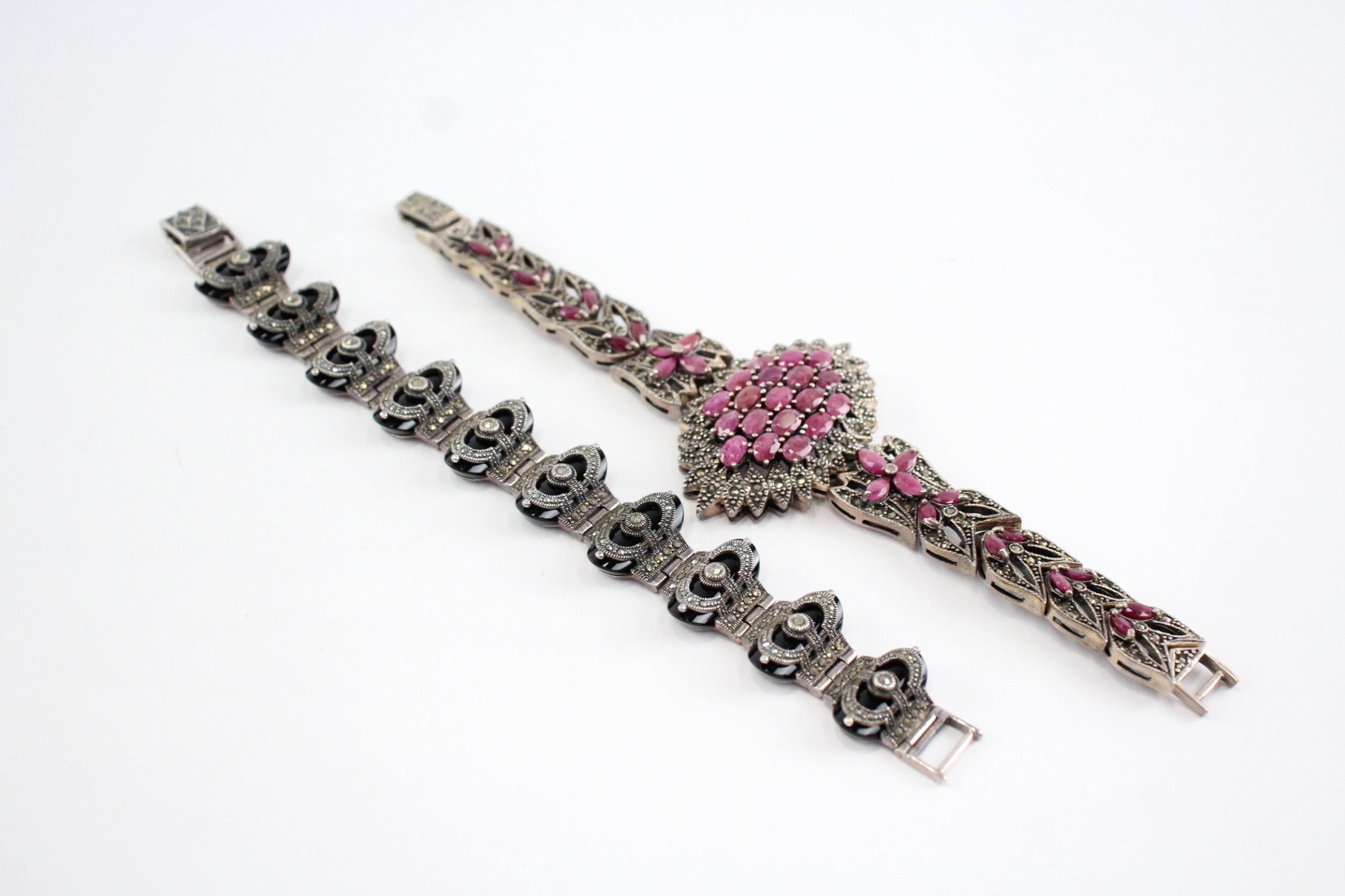 Collection of Sterling Silver Marcasite Bracelets, inc. Enhanced Ruby x 2 (114g)