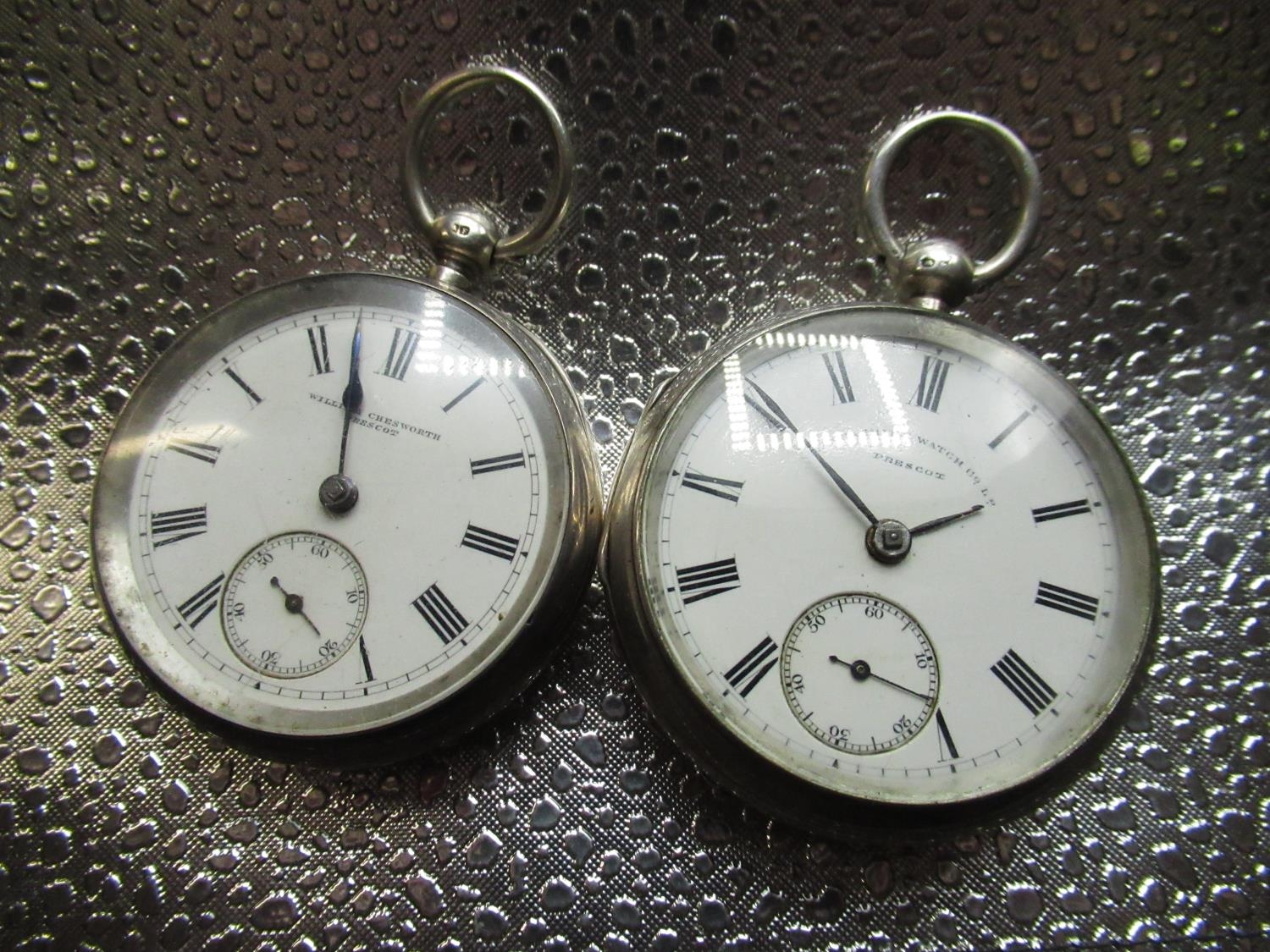 William Chesworth, Prescott, silver key wound open faced pocket watch, gilt full plate fusee lever movement signed and numbered 28398, Chester 1894, and a Lancashire Watch Co. Ltd, Prescot, silver key wound open faced pocket watch, gilt full plate fusee lever movement numbered 19577 Chester 1894 (lacking dust cap, rear cover hinge AF) (2)