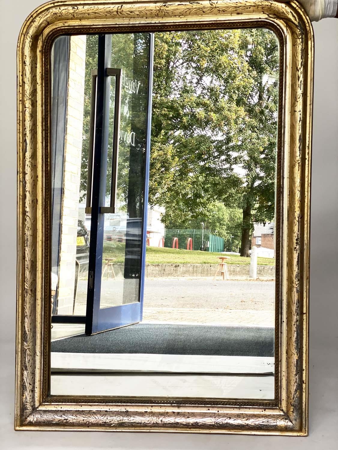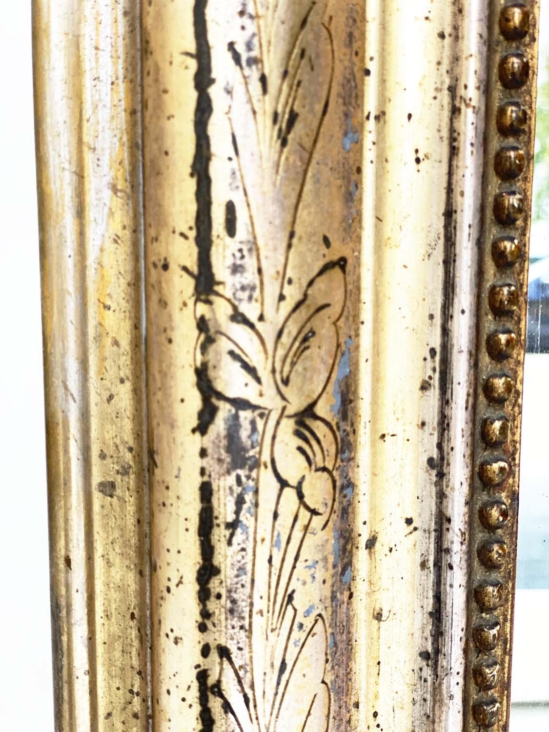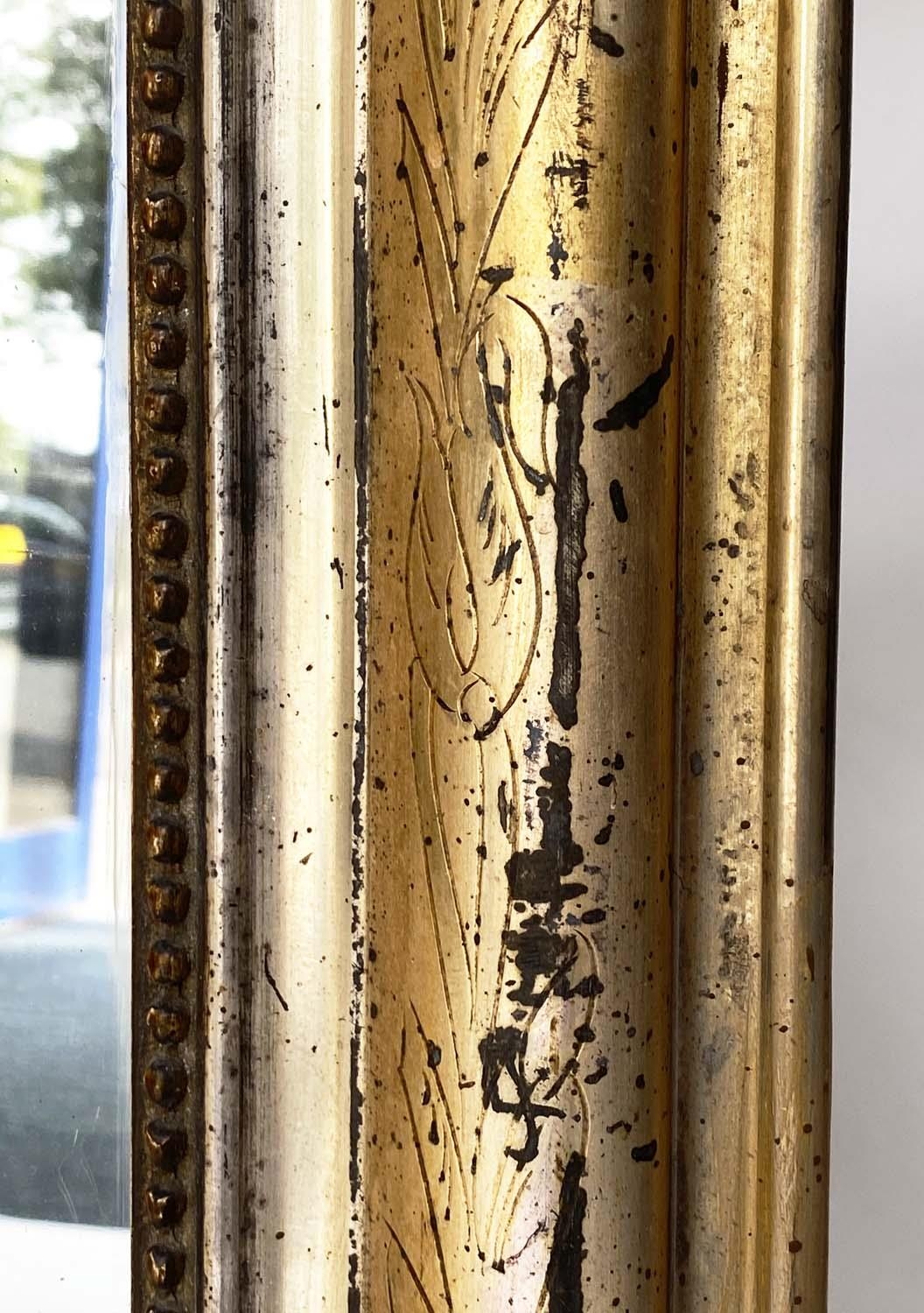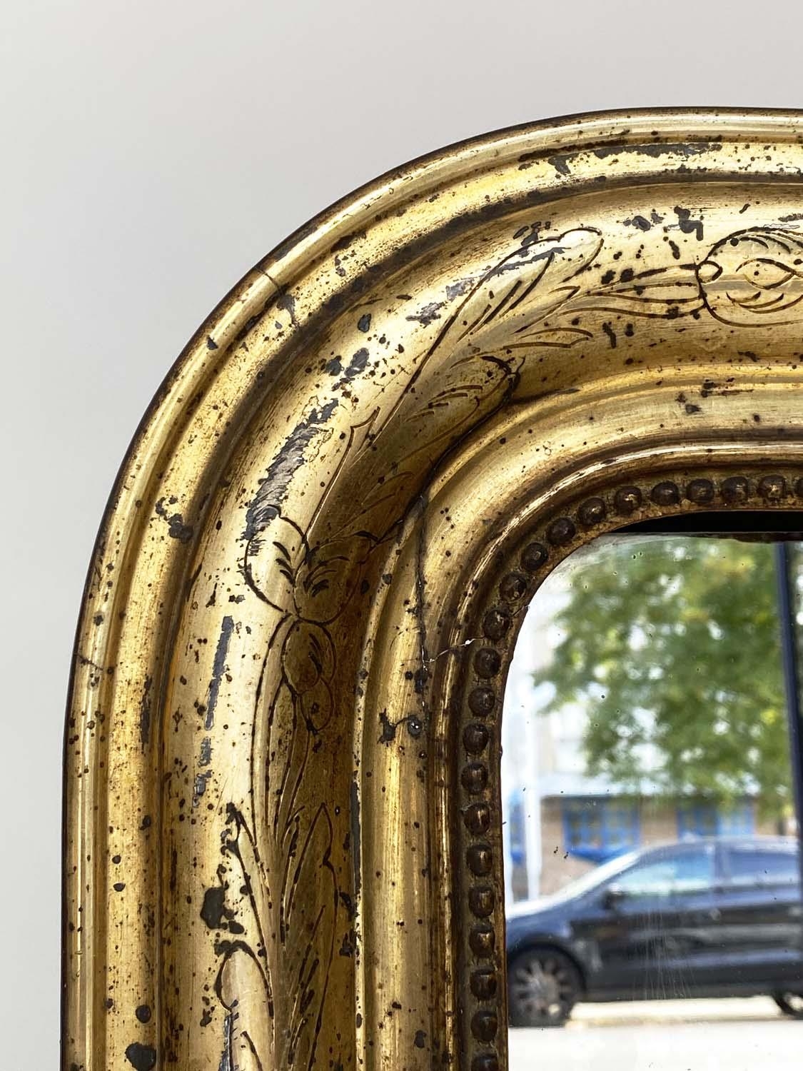 OVERMANTEL MIRROR, 19th century French arched giltwood and composition incised moulded and beaded frame, 84cm W x 120cm H.