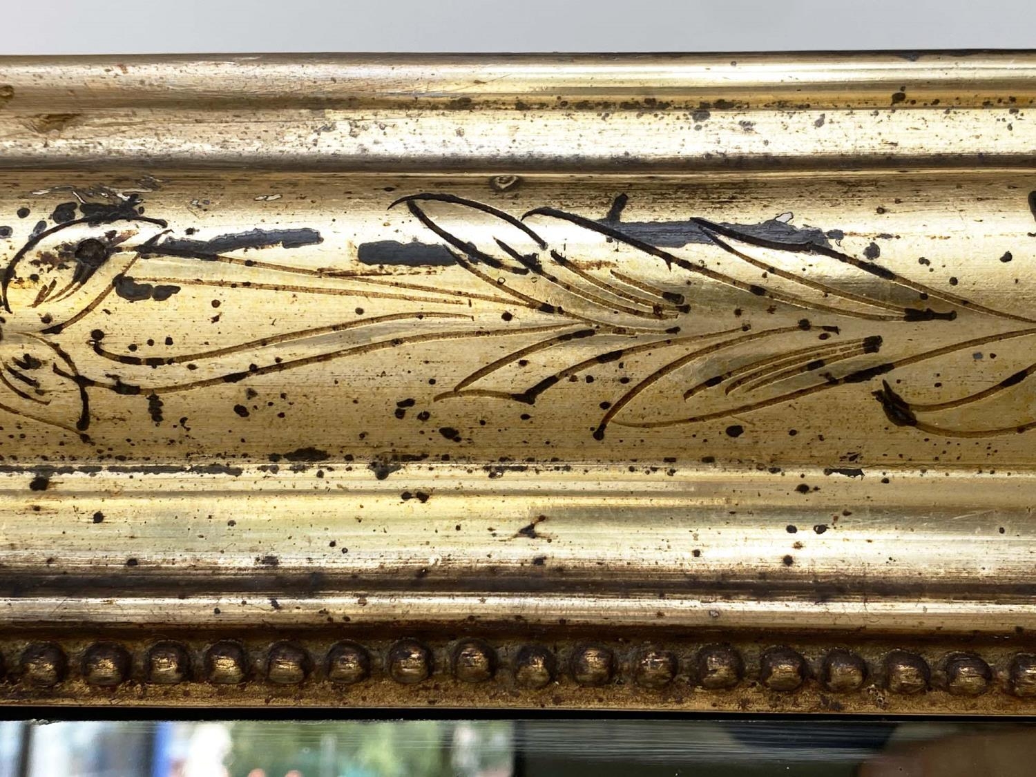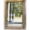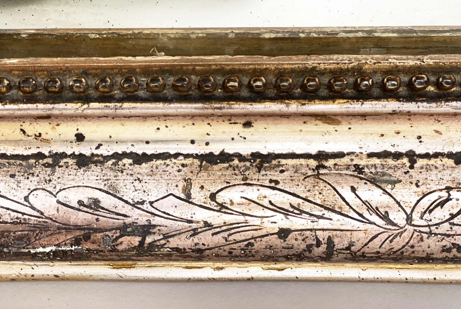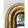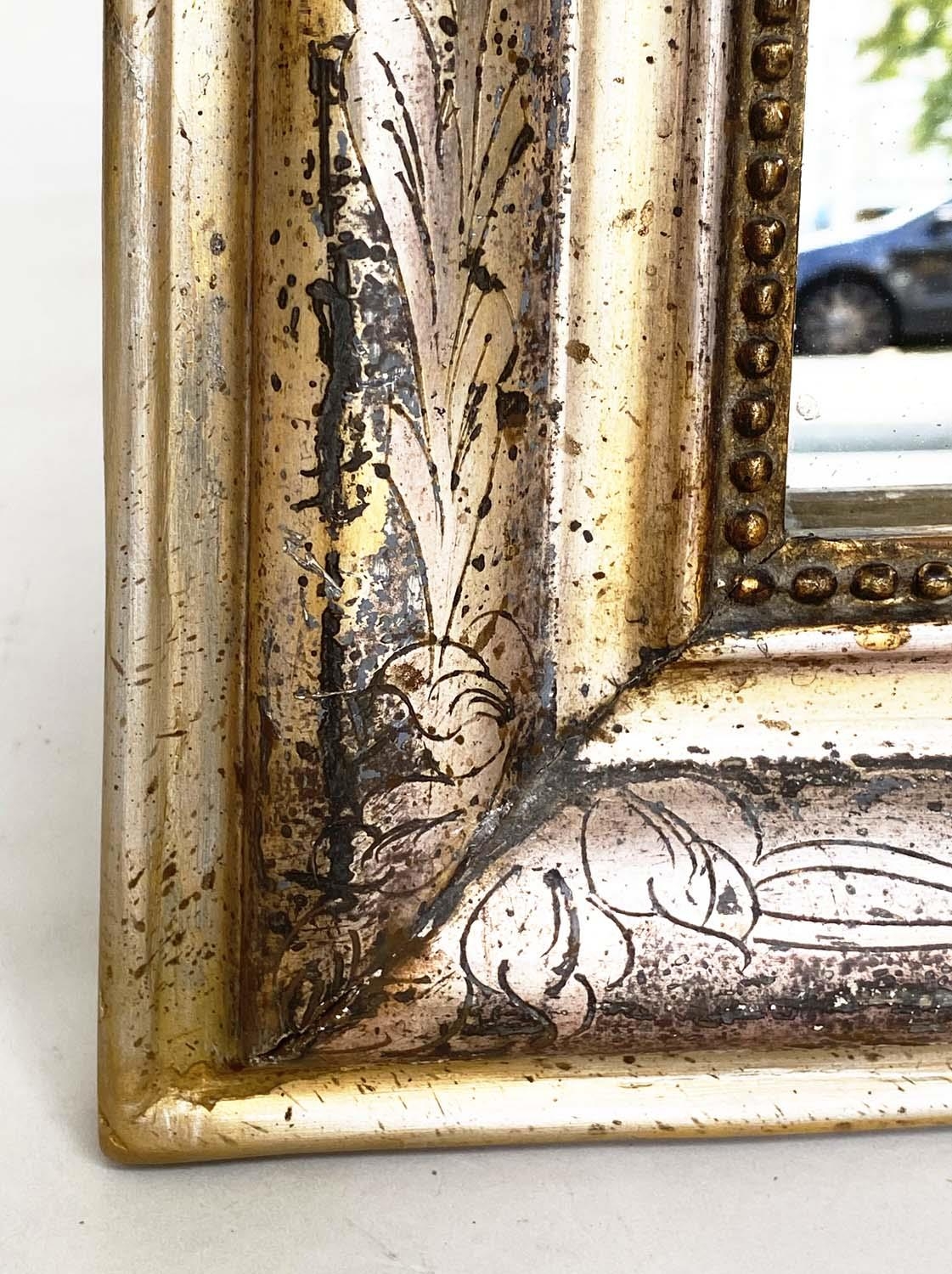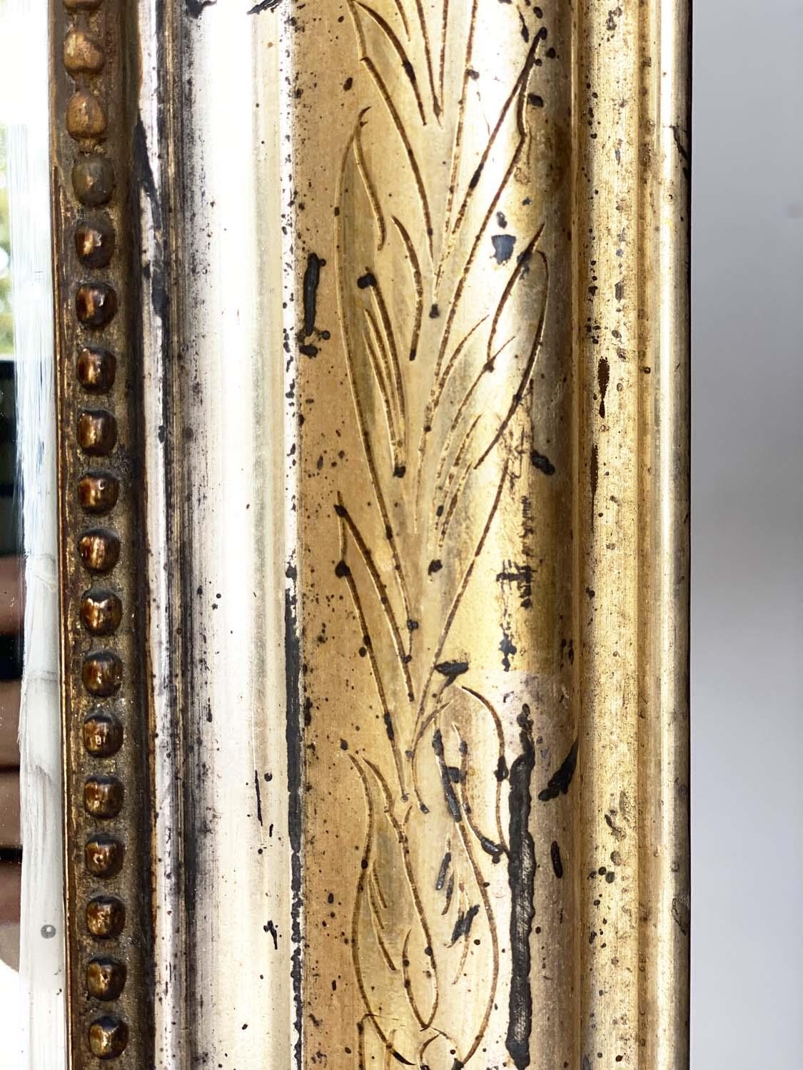 OVERMANTEL MIRROR, 19th century French arched giltwood and composition incised moulded and beaded frame, 84cm W x 120cm H.
