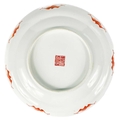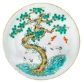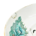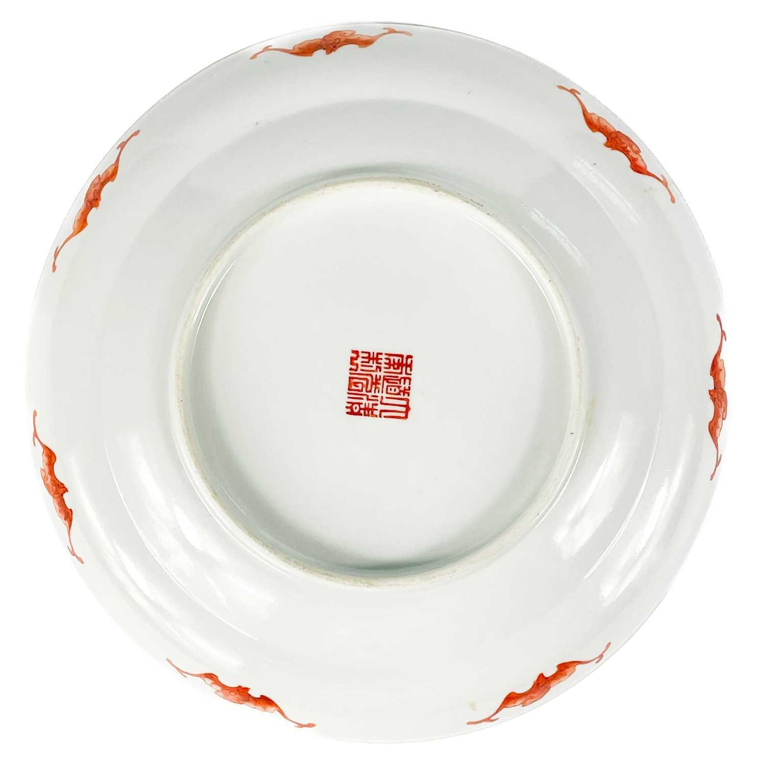 A Chinese famille verte porcelain dish, red Daoguang seal. Painted enamel decoration of a large tree, two cranes and two bats, the underside decorated with a further seven bats, height 4cm, diameter 24cm. chip and hairline to rim. Also another hairline from rim.