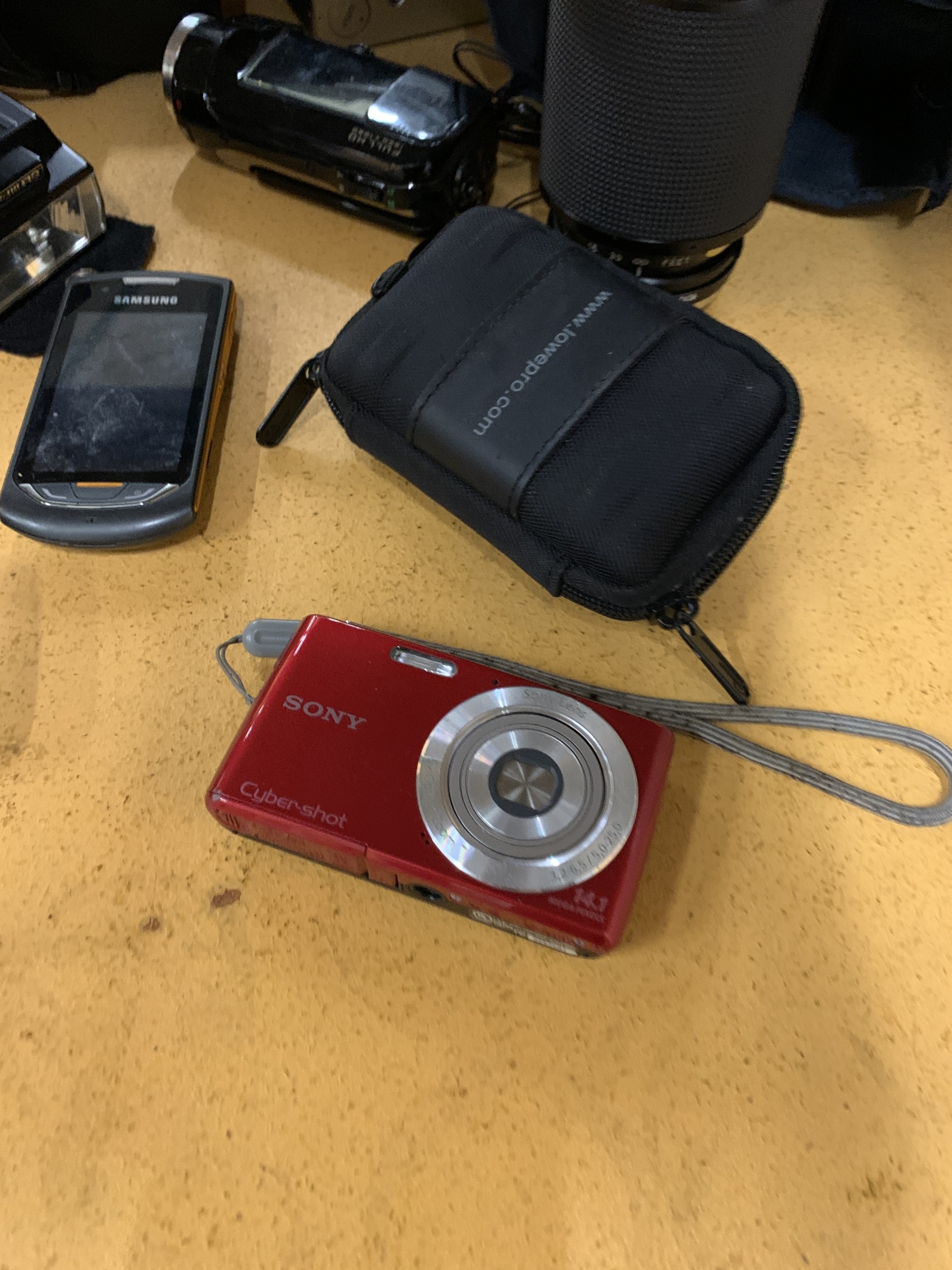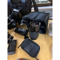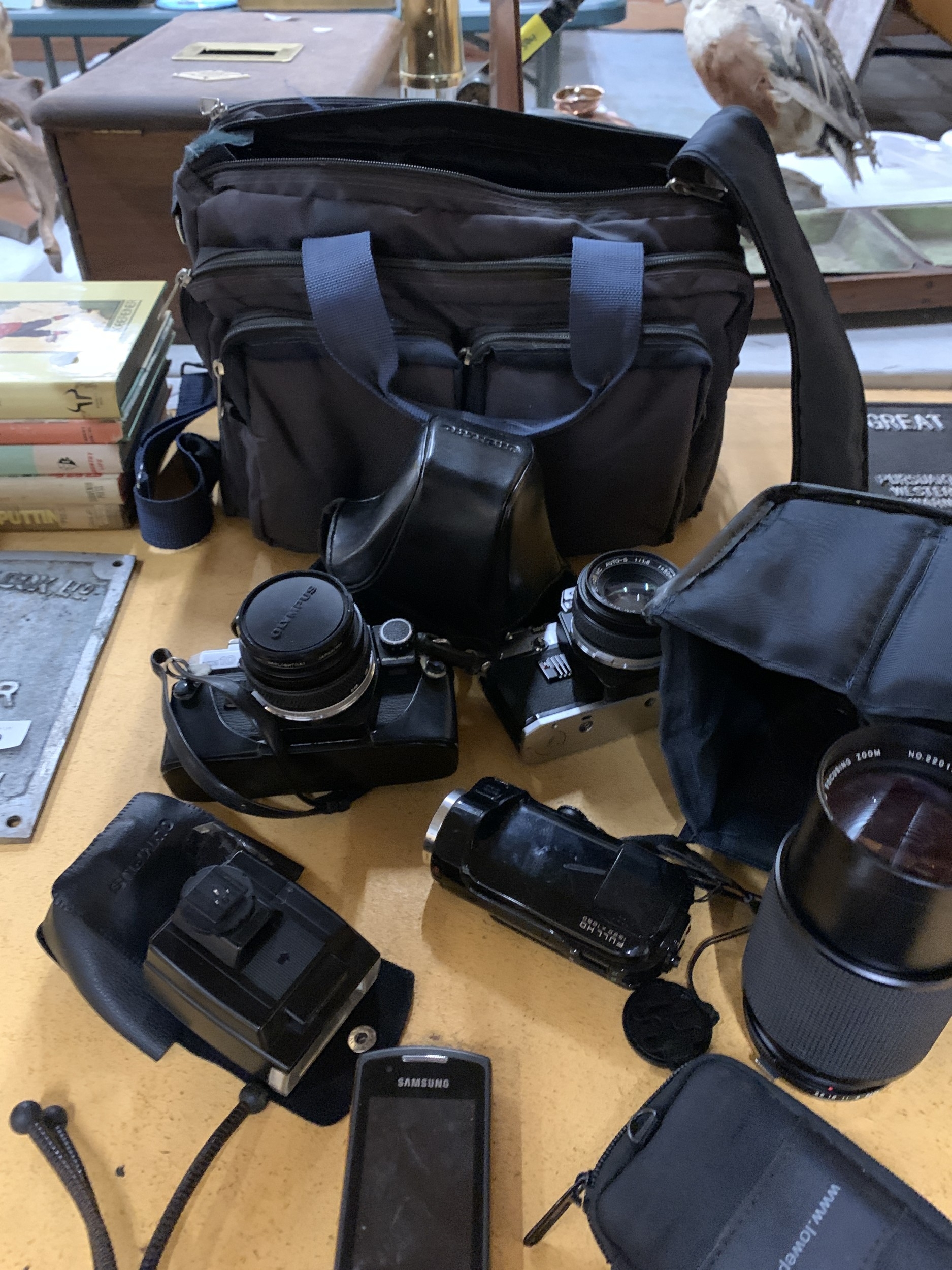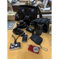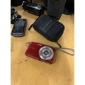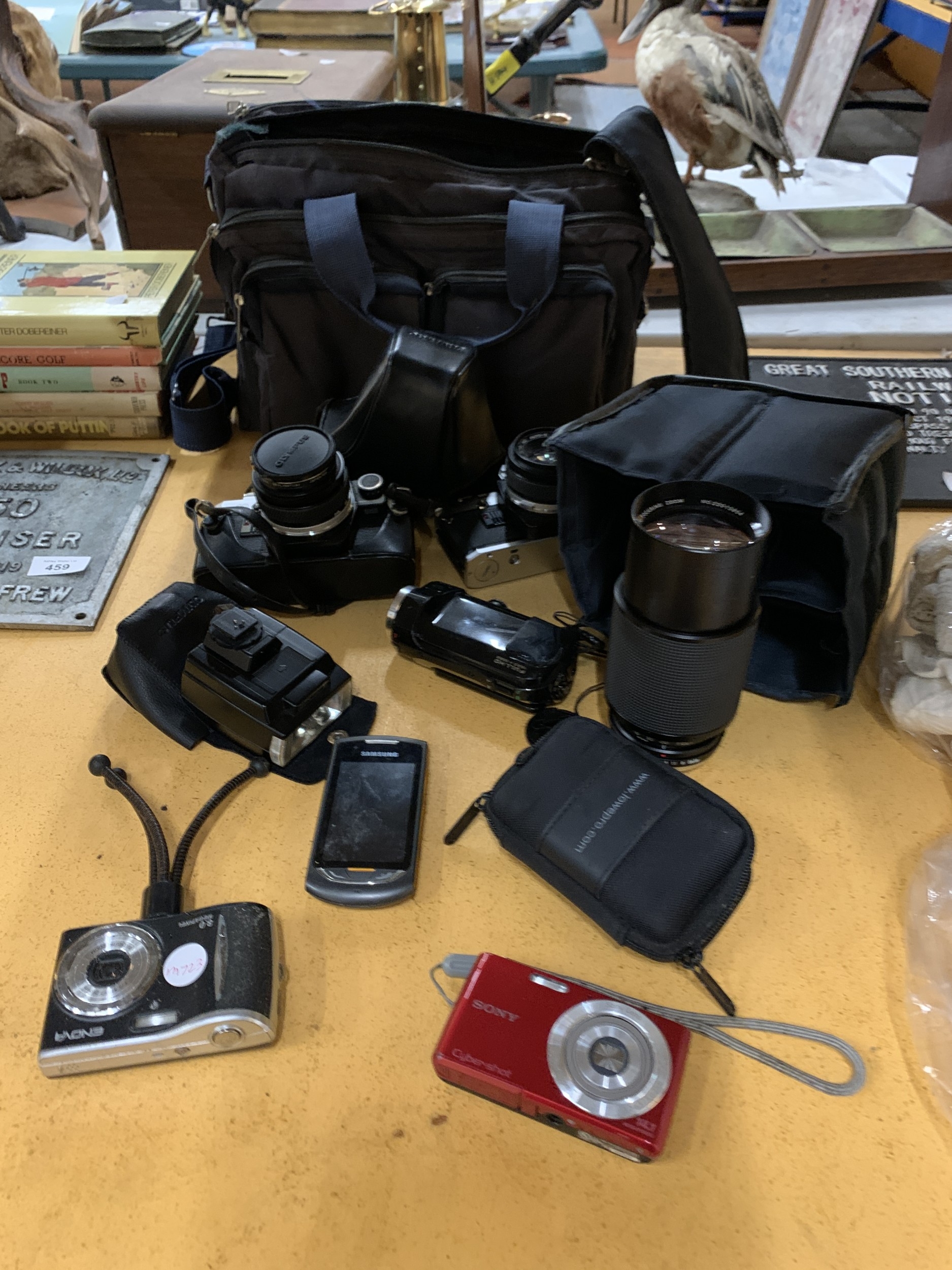 A COLLECTION OF CAMERAS TO INCLUDE OLYMPUS, SONY CYBERSHOT, ETC PLUS ASAMSUNG PHONE, BAGS, ETC