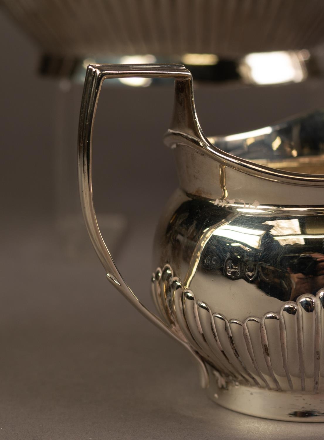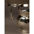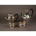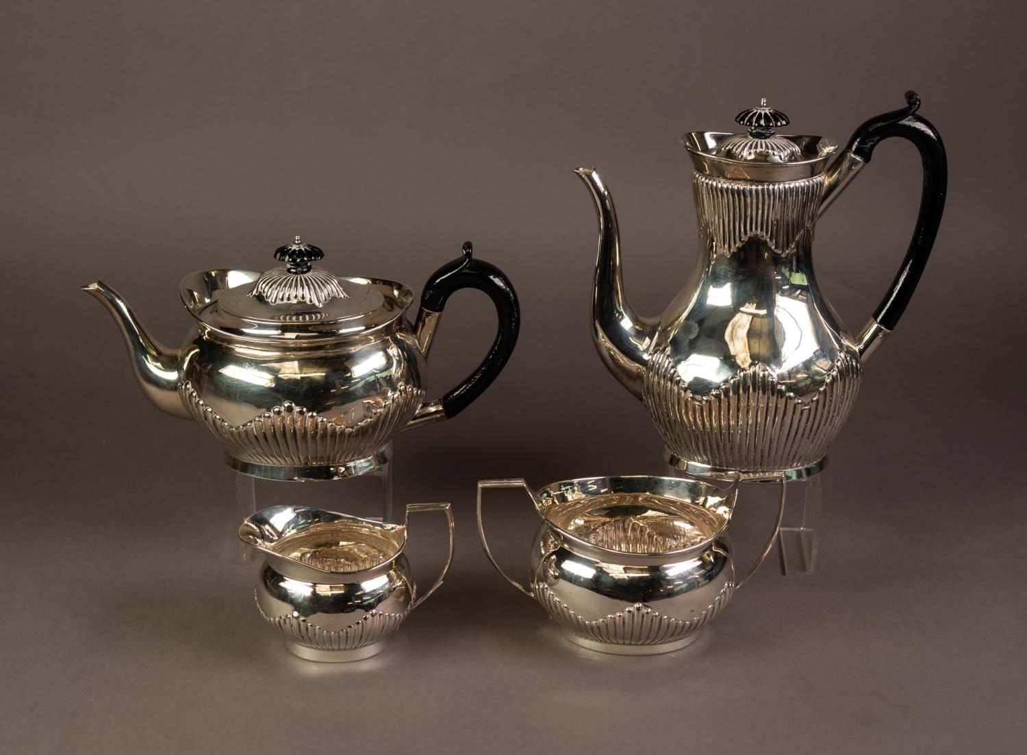 LATE VICTORIAN SILVER FOUR PIECE TEA AND COFFEE SET BY CHARLES STUART HARRIS, of oval part fluted form with black scroll handles and knops and oval bases, London 1890, 50.3oz gross, (4)