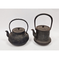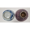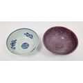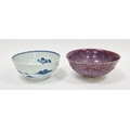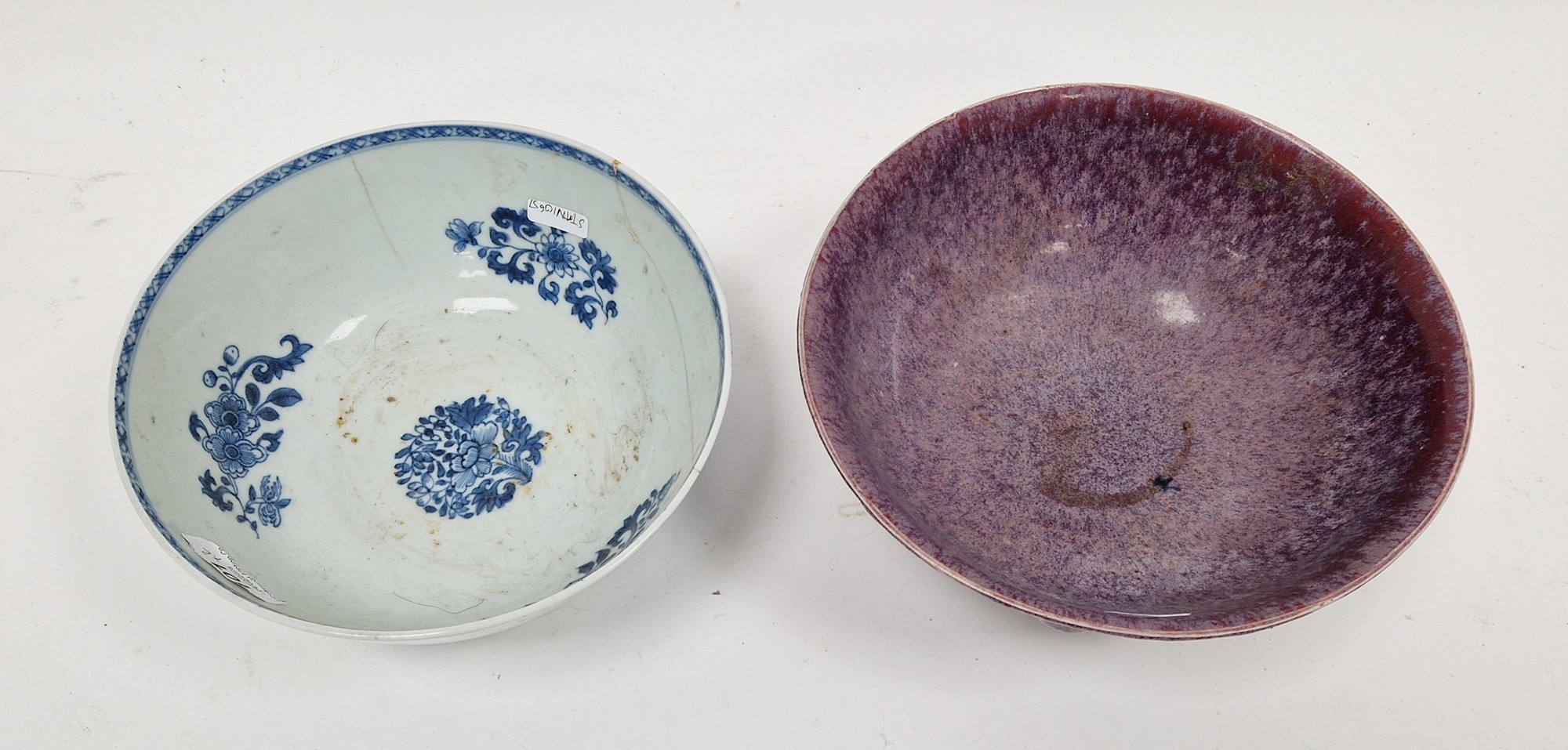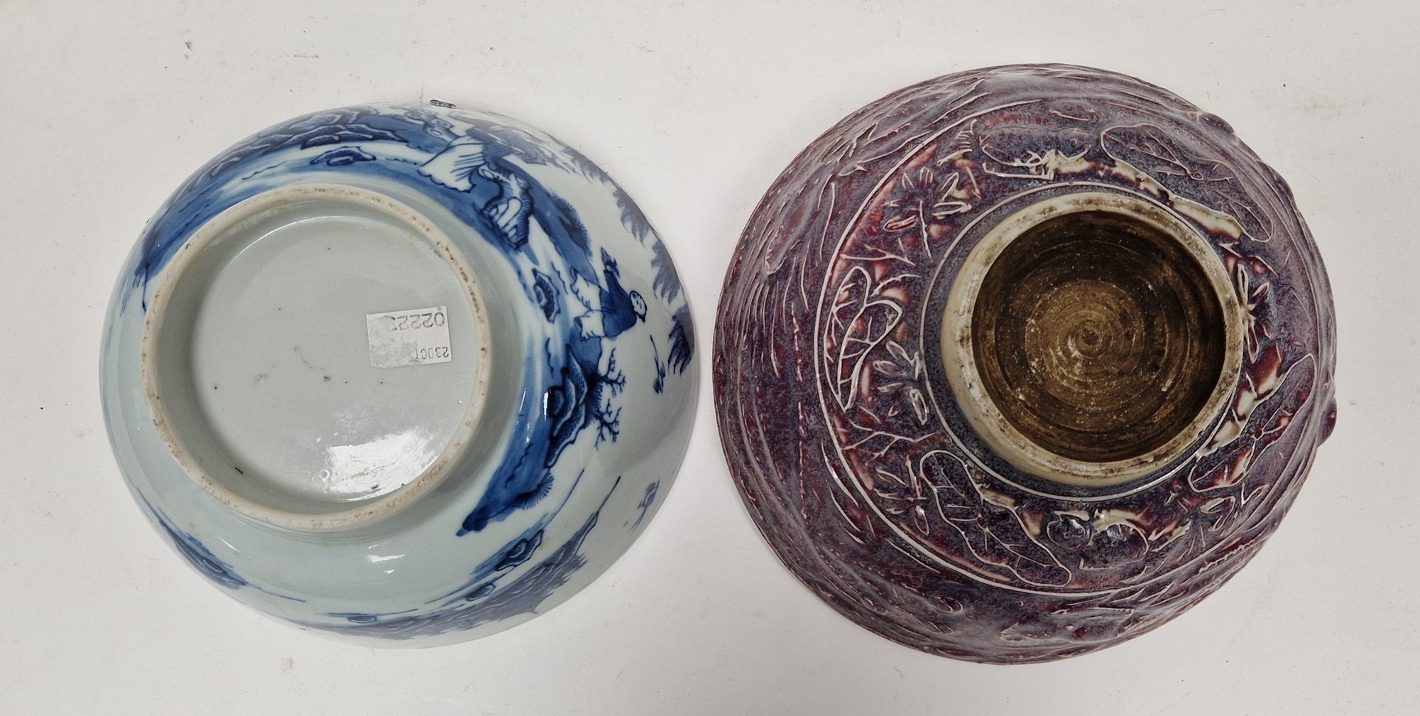 Chinese export porcelain blue and white bowl, late 18th/early 19th century, painted with figures before willow and rockwork and river islands, 20cm diameter (cracked and riveted) together with a Chinese sang-de-boeuf flambe glazed bowl moulded in relief with water plants and dragons, 22.2cm diameter (2)