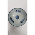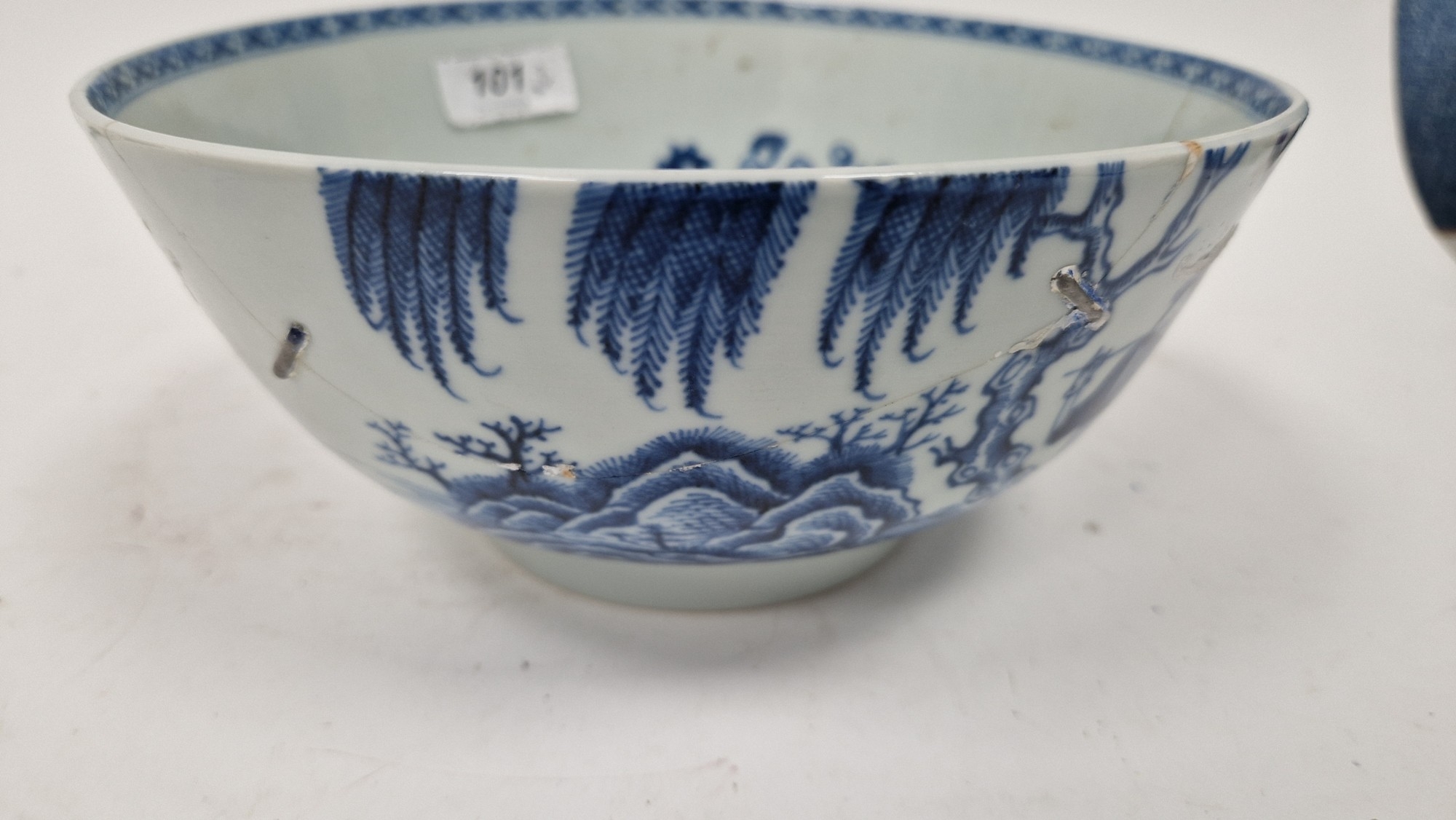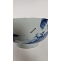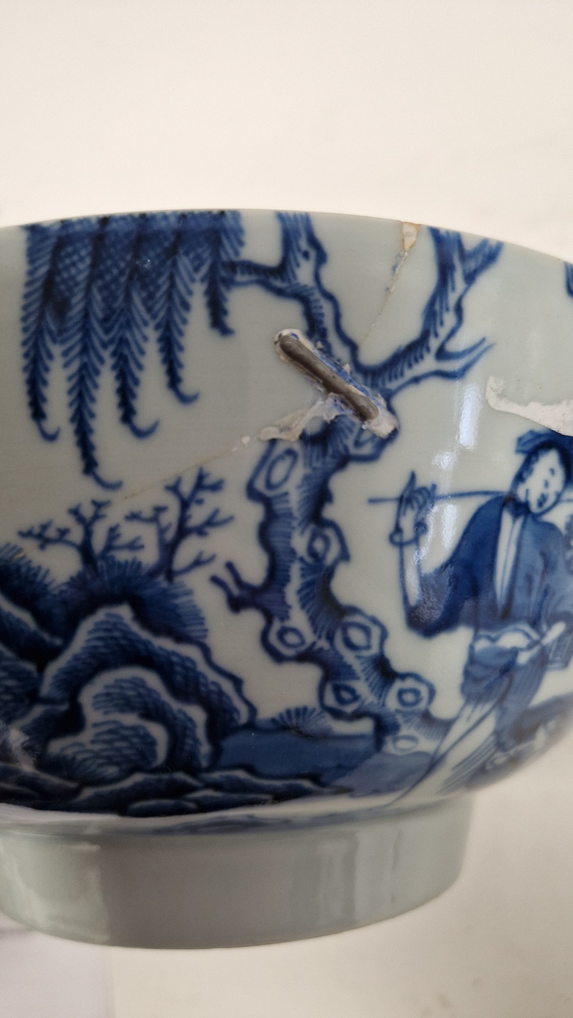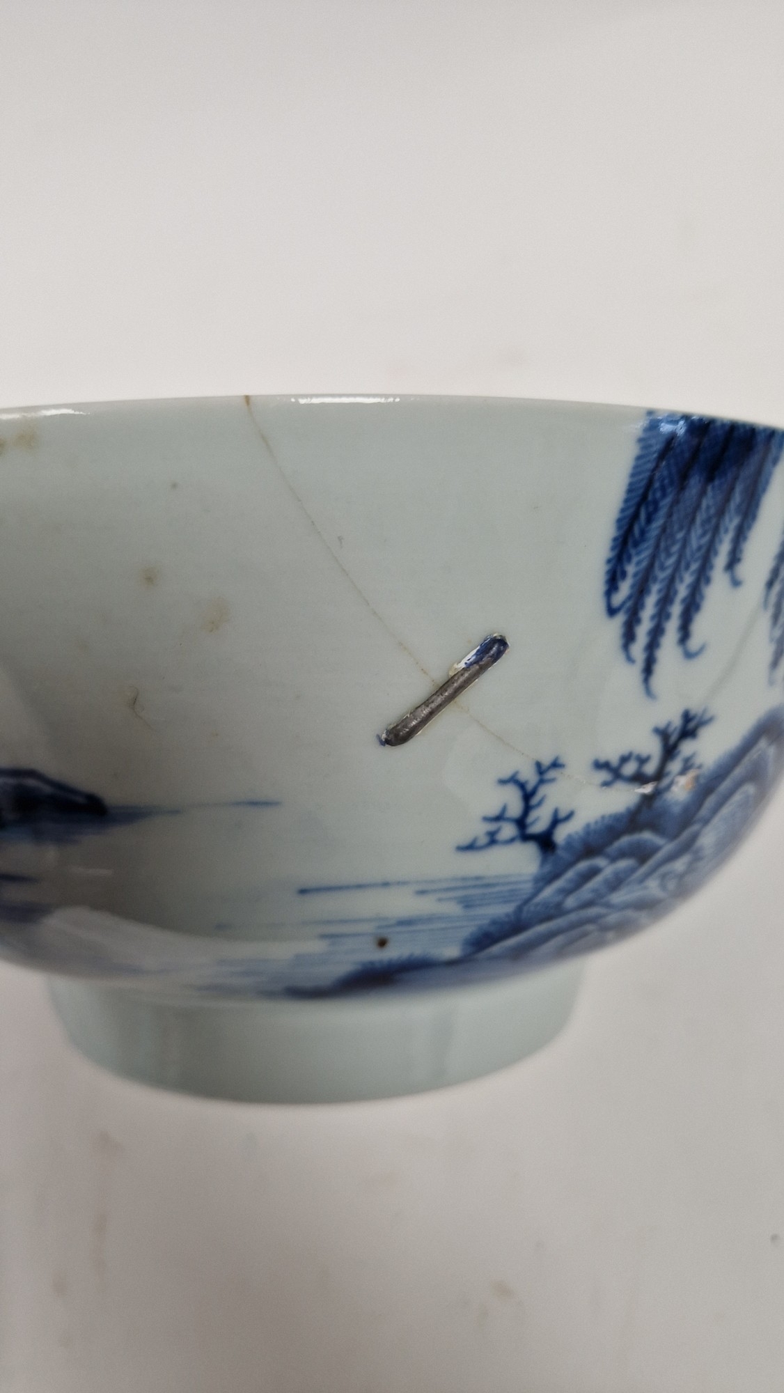 Blue and white bowl with hairline and further crack and repair. Both with general wear and tear.
