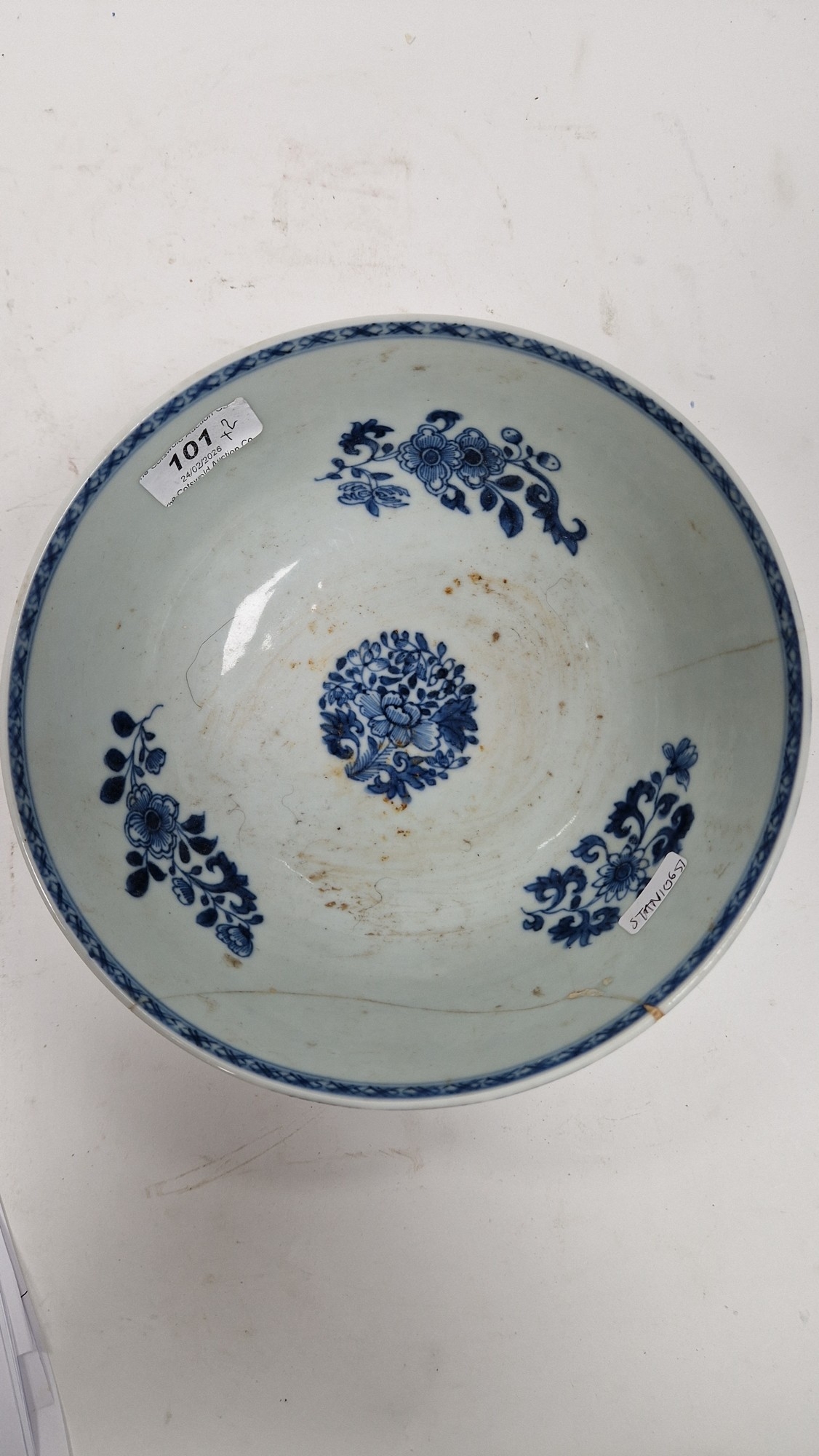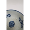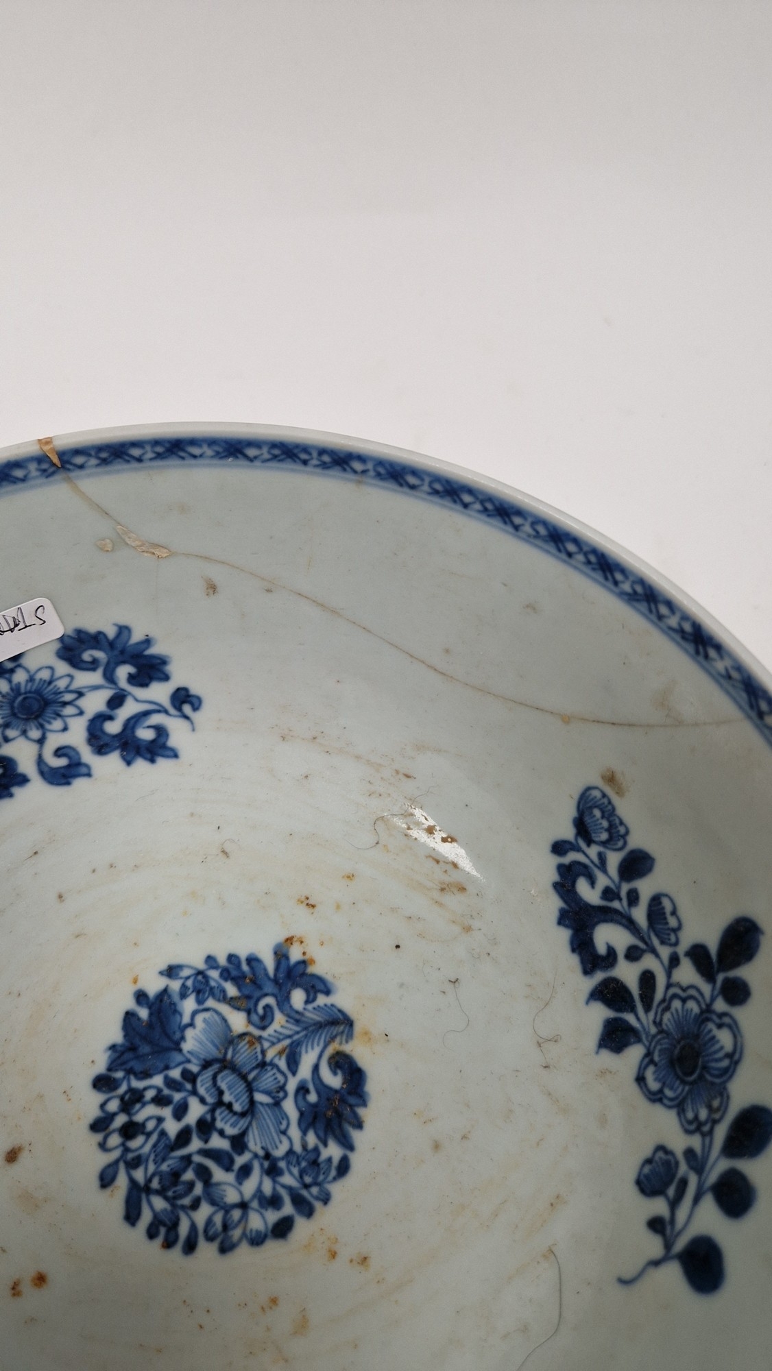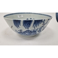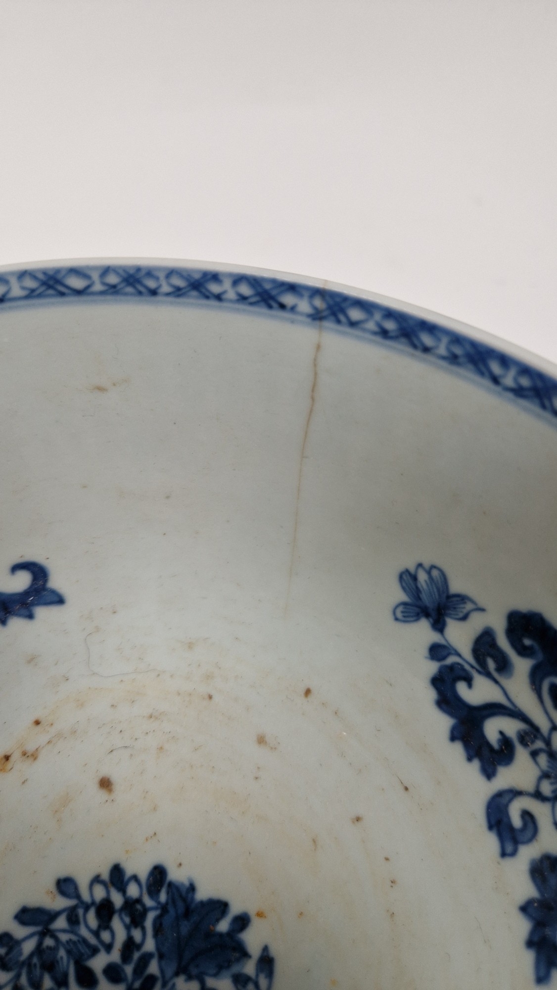 Blue and white bowl with hairline and further crack and repair. Both with general wear and tear.