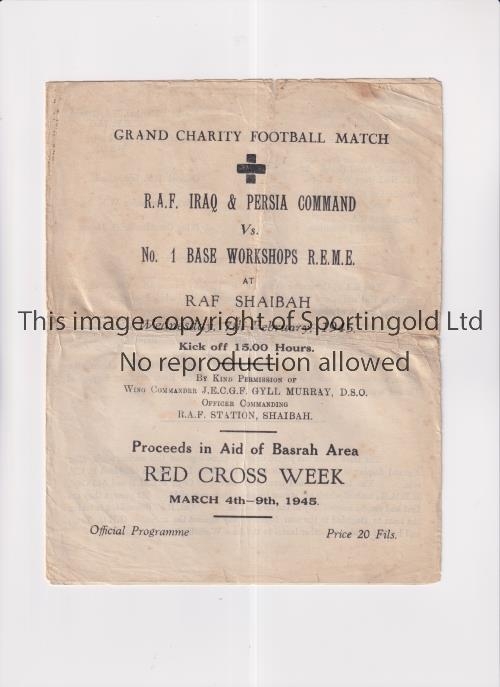 SERVICES FOOTBALL IN IRAQ 1945 Programme for R.A.F. Iraq & Persia Command v No. 1 Base Workshops R.E.M.E. 7/2/1945 at R.A.F. Shaibah in Iraq, clear tape inside, folded and slightly worn. Fair to generally good