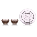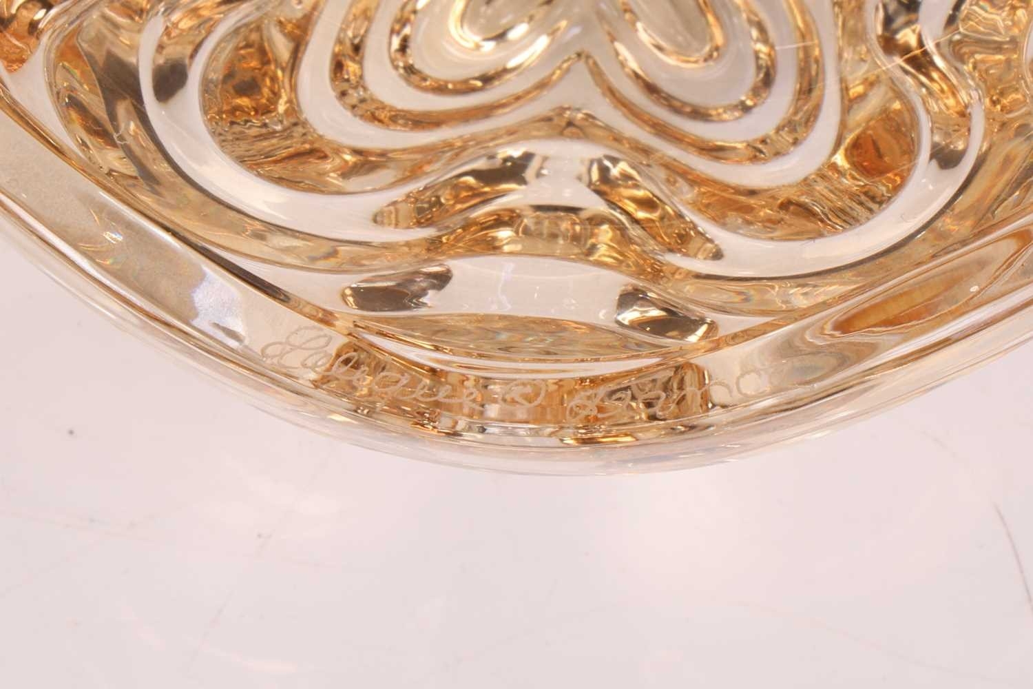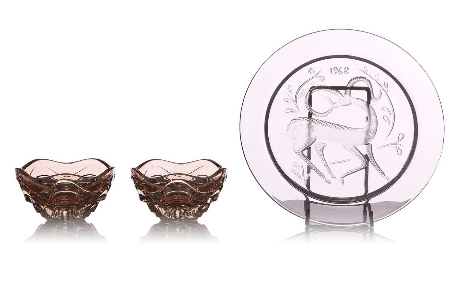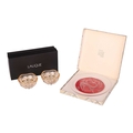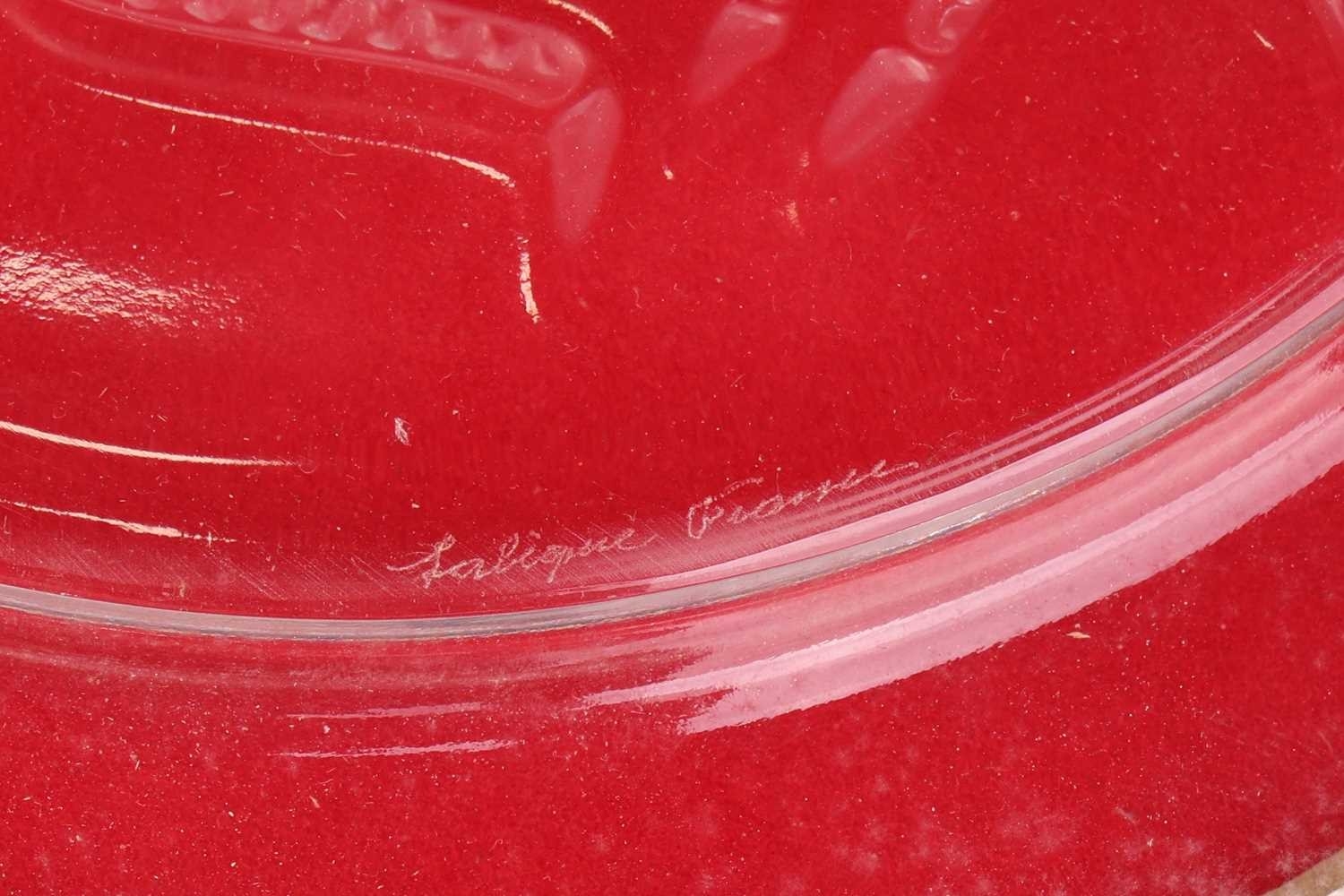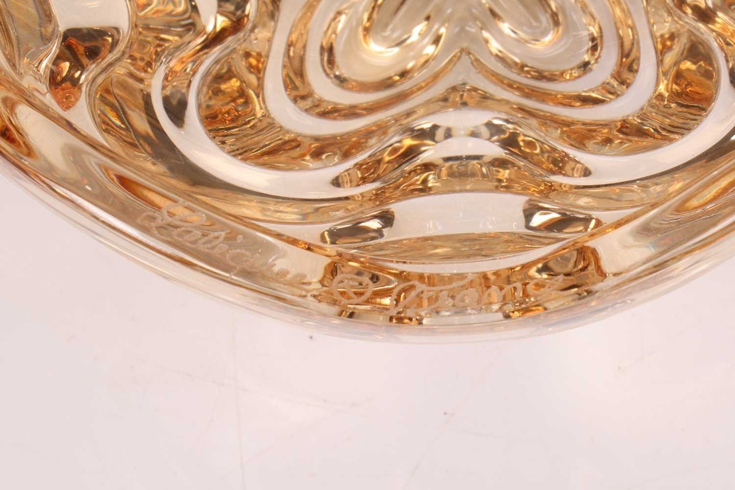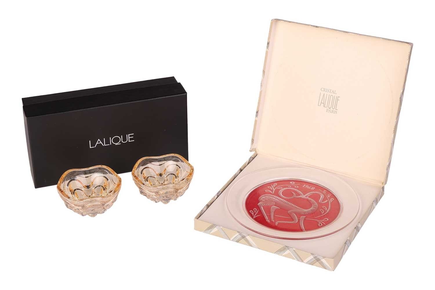 A pair of Lalique 'Vibration' pattern glass lustre dishes, the two elements fitting together to create a covered box, each 5.5 cm high x 10.5 cm wide, in a fitted Lalique branded box, with booklet, together with a 1968 Lalique Christmas plate, of circular form decorated with a stylised deer, 21 cm diameter, in original box. Qty: (2) No damage