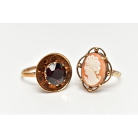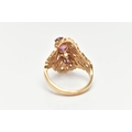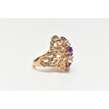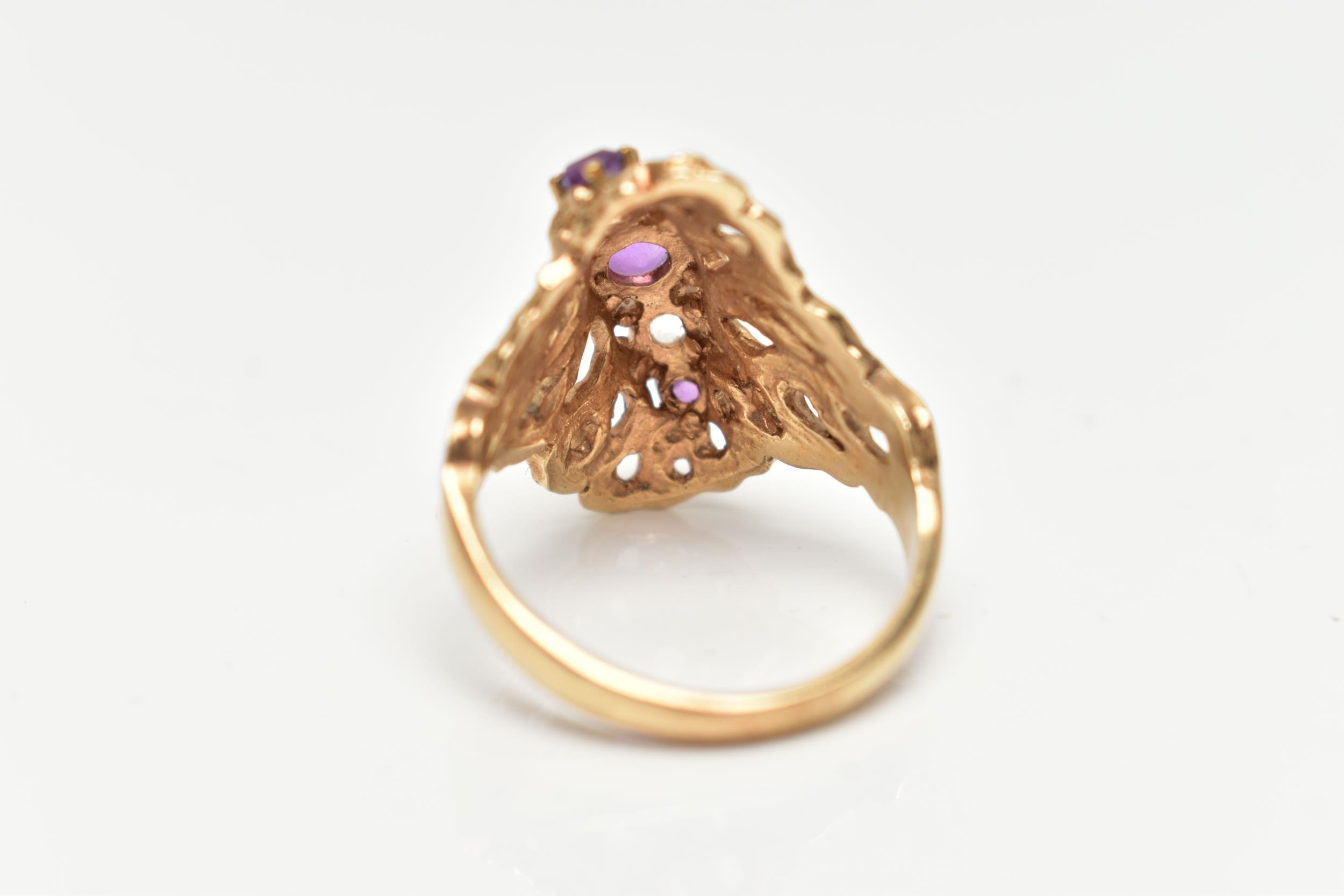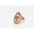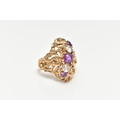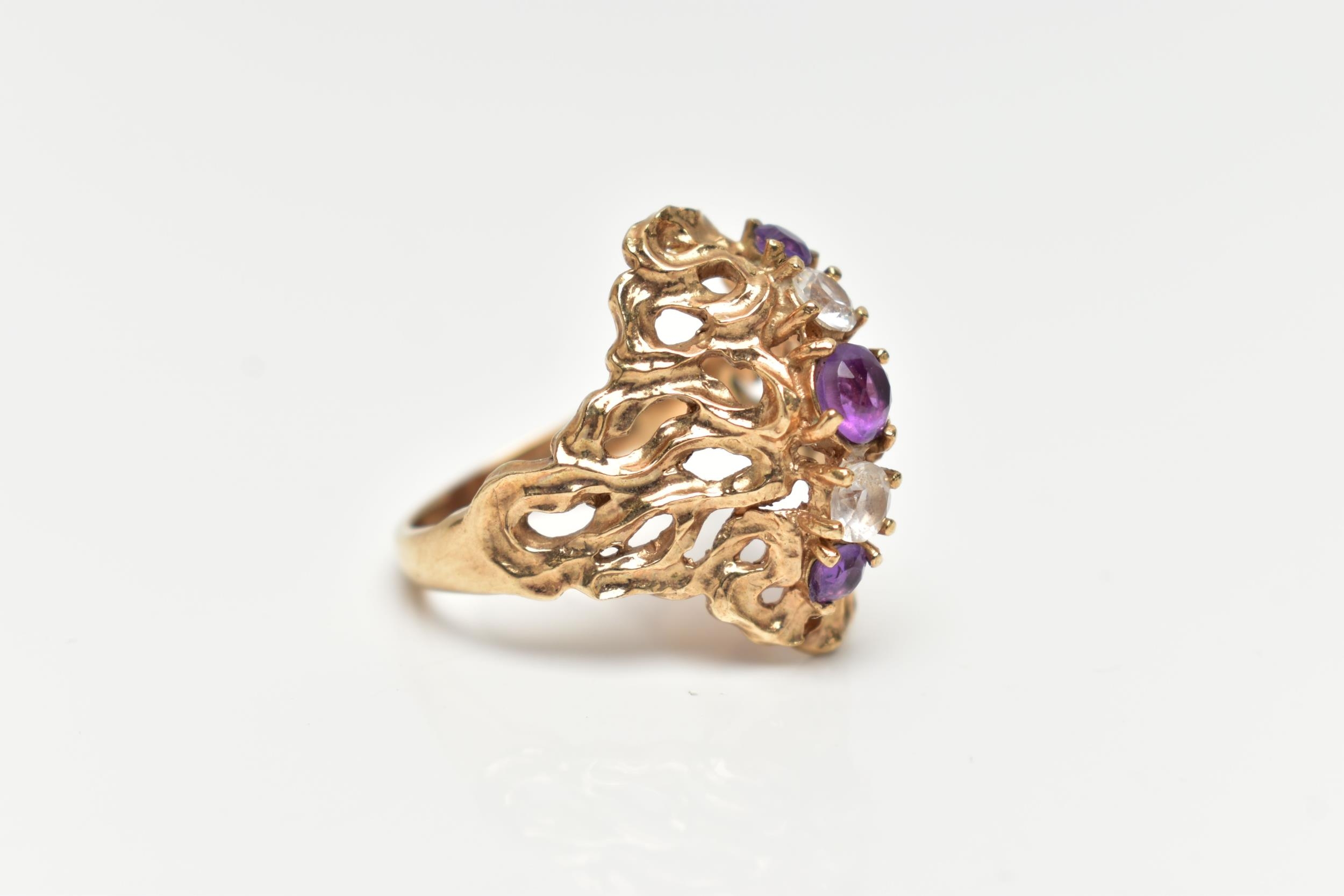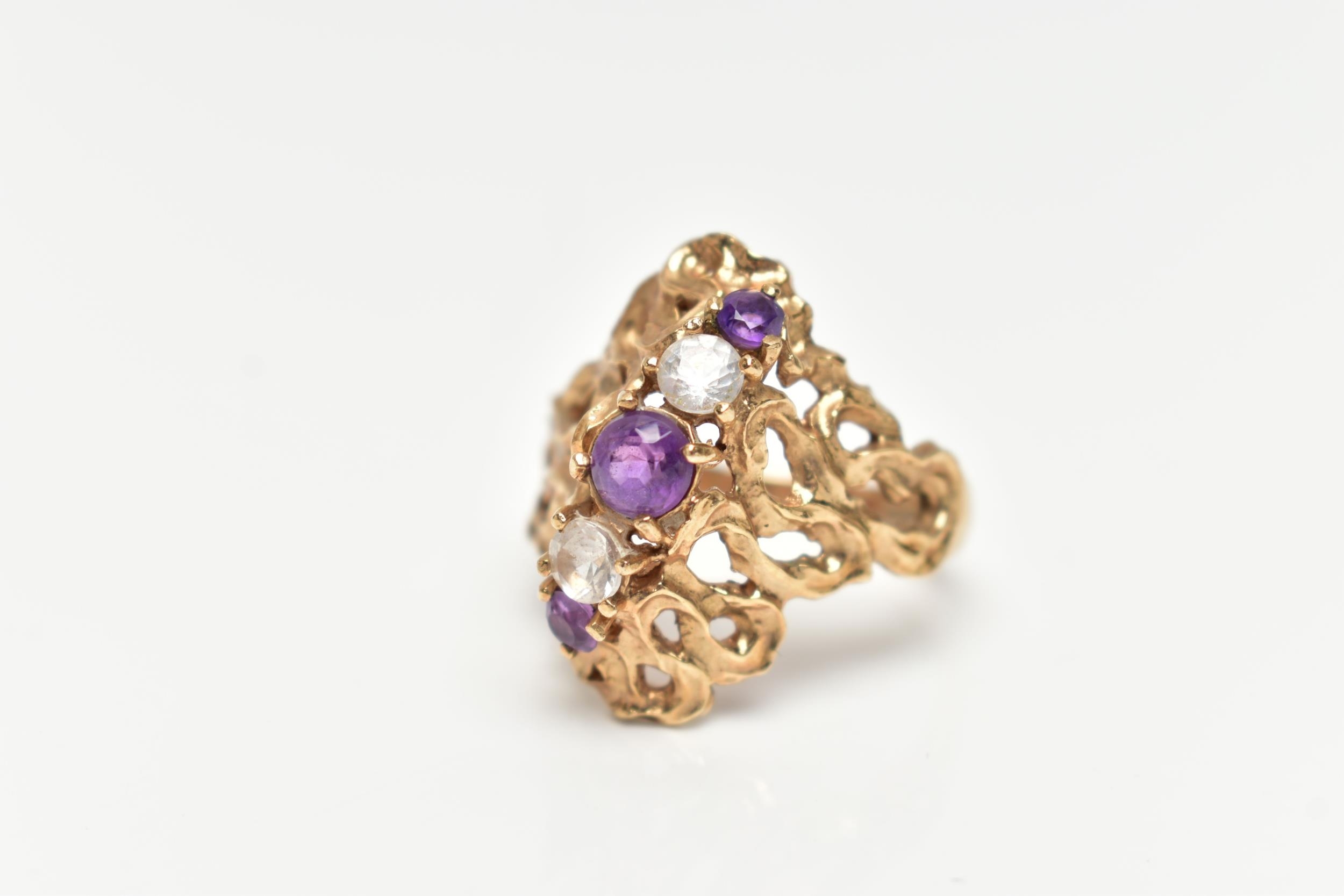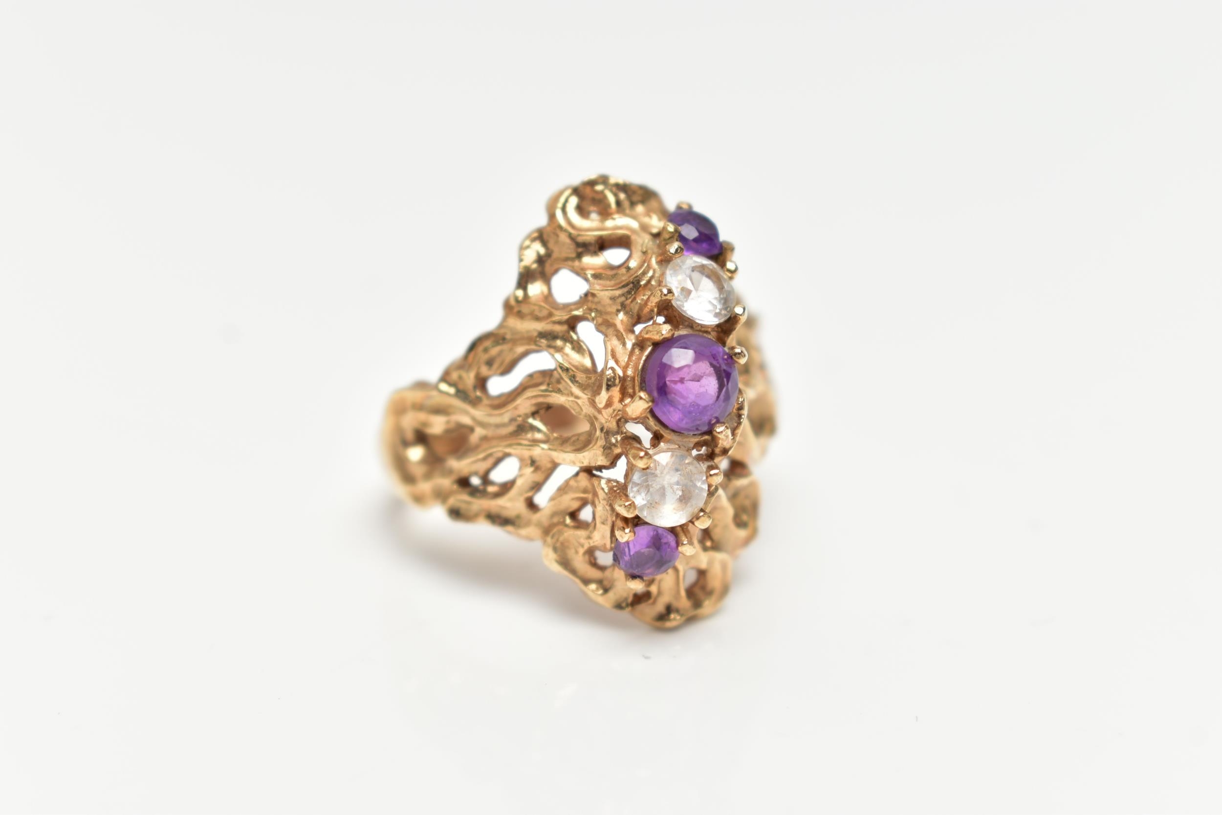 A 9CT GOLD ABSTRACT RING, set with a row of three circular cut amethyst and two circular cut colourless spinels, to the openwork textured mount, leading onto a polished band, hallmarked 9ct Birmingham, ring size O 1/2, approximate gross weight 5.5 grams (condition report: stones intact at time of cataloguing, general light wear, overall condition good)