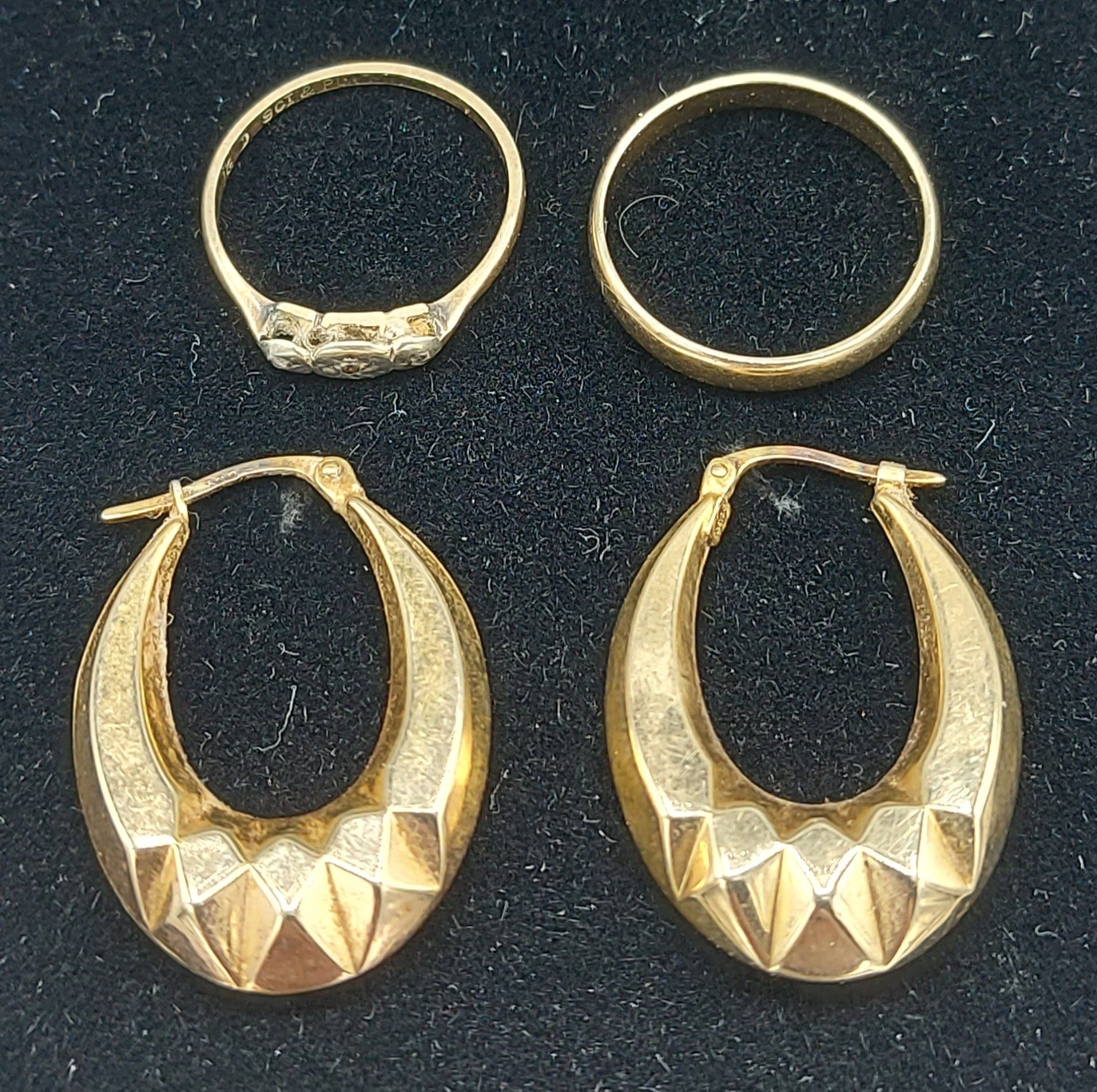 A 9ct gold and Platinum diamond set ring together with a 9ct gold wedding band and a pair of 9ct gold earrings, 5.2g