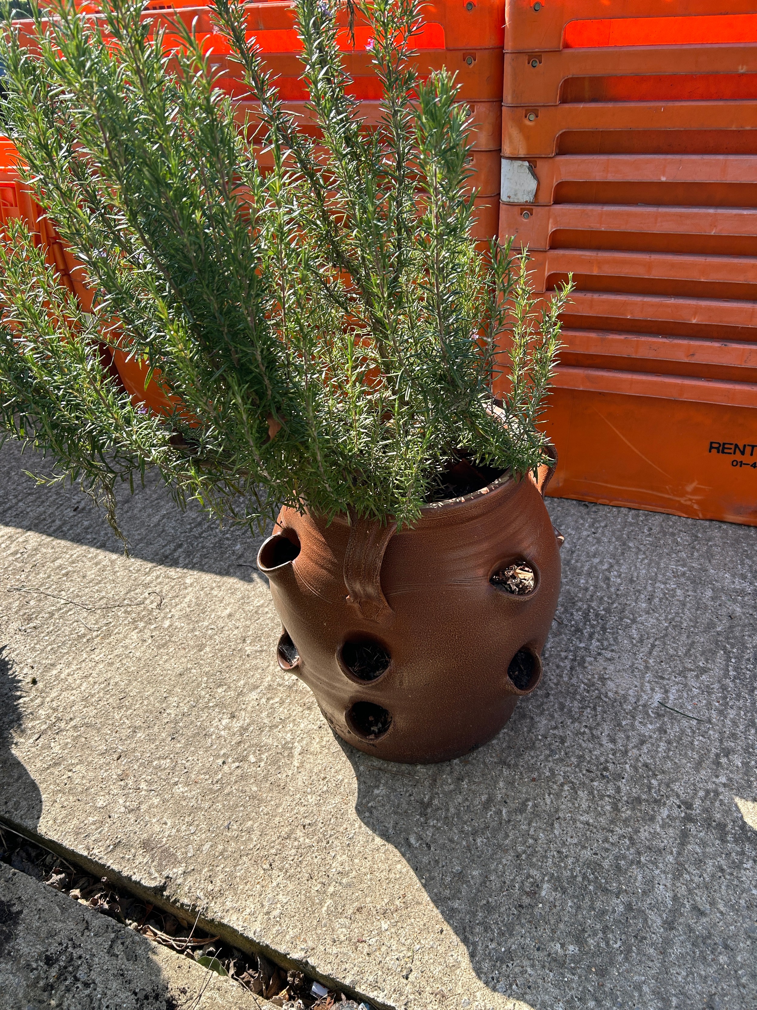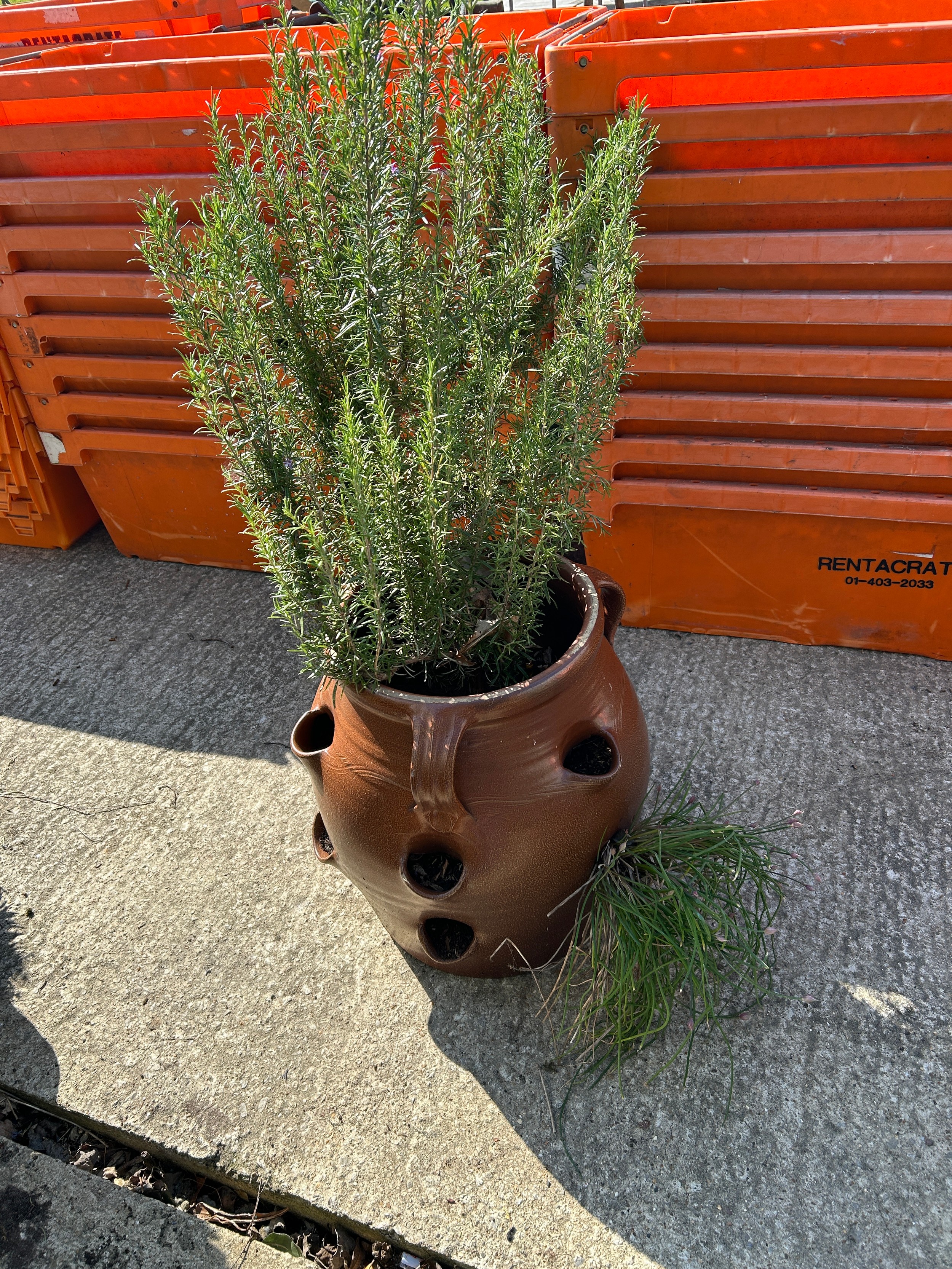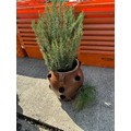 Salt Glazed Strawberry pot planted with Rosemary and Chives, height of pot 49 cms, diameter 48 cms