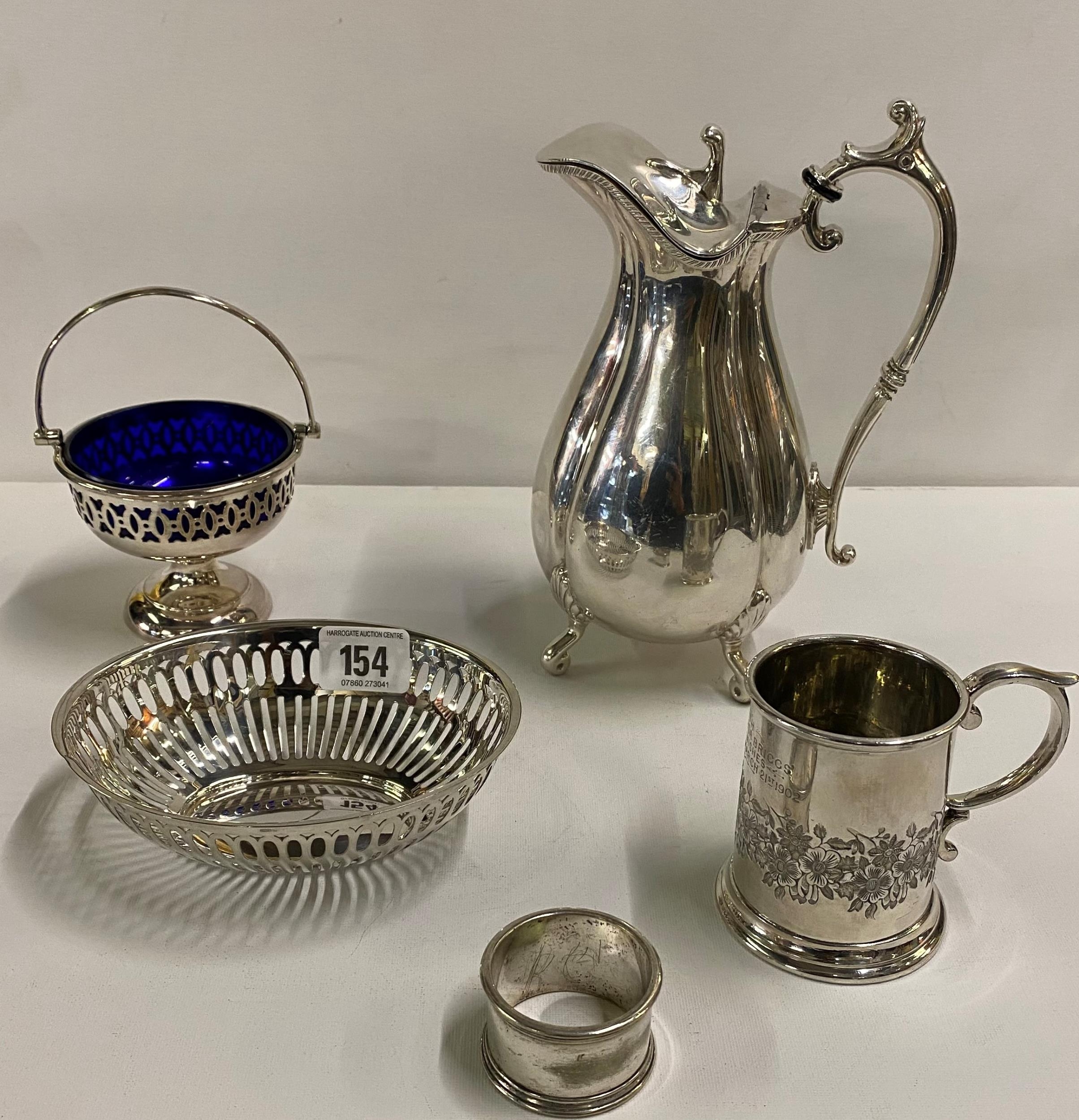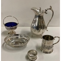 A selection of Silver Plated items including sugar basin water jug miniature tankards and napkin rings