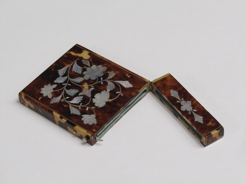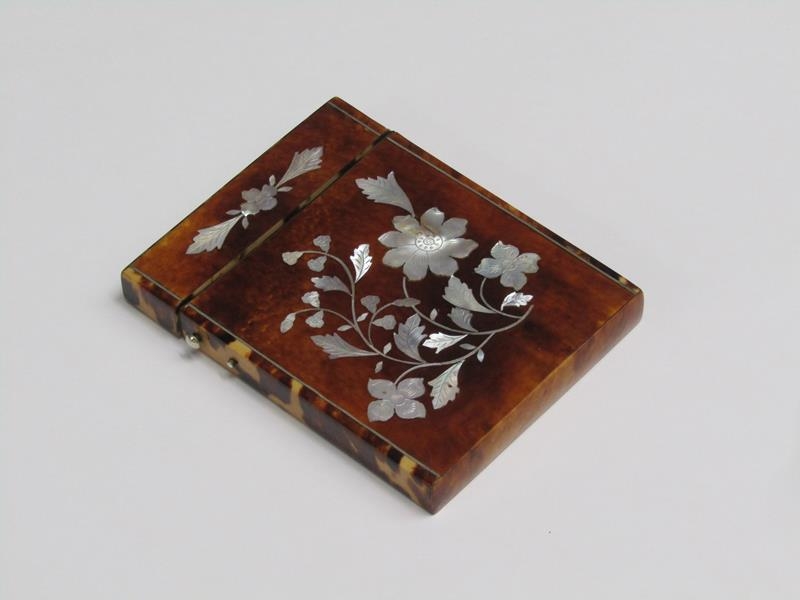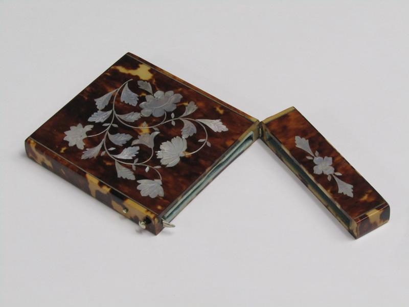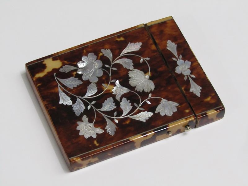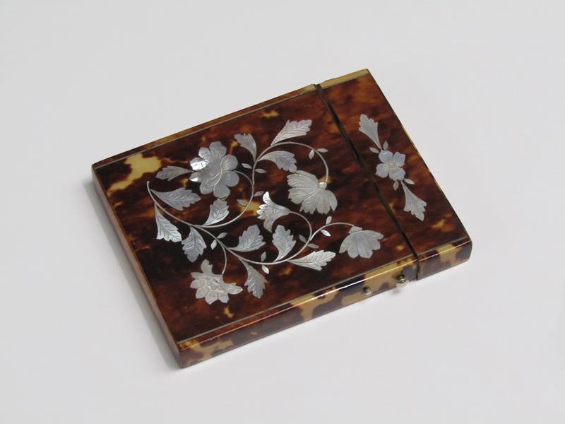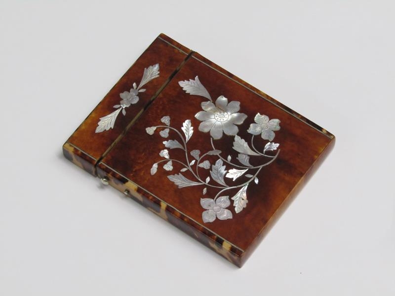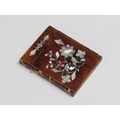 A 19c visiting card case of pearl inlaid tortoiseshell, 8cm x 10cm.