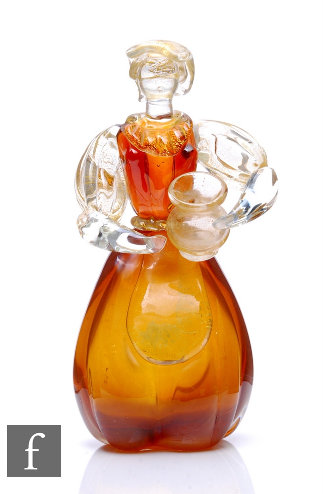 Unattributed maker - A post war Murano glass figure, modelled as a woman holding a pot, the clear and amber body with gold aventurine inclusions, height 25.5cm.