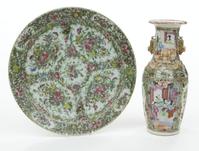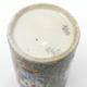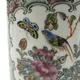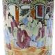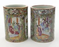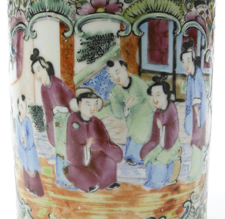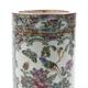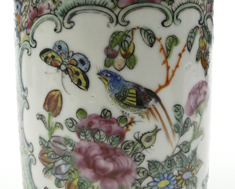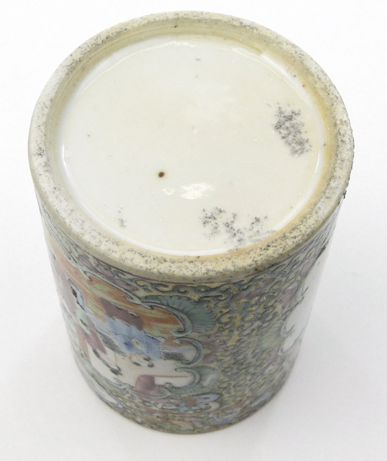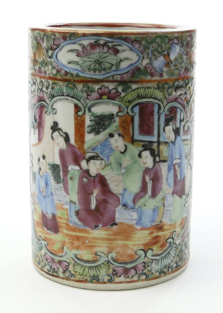 Cantonese cylindrical porcelain brush pot, enamelled with figures and panels of birds and butterflies, 11cm high
